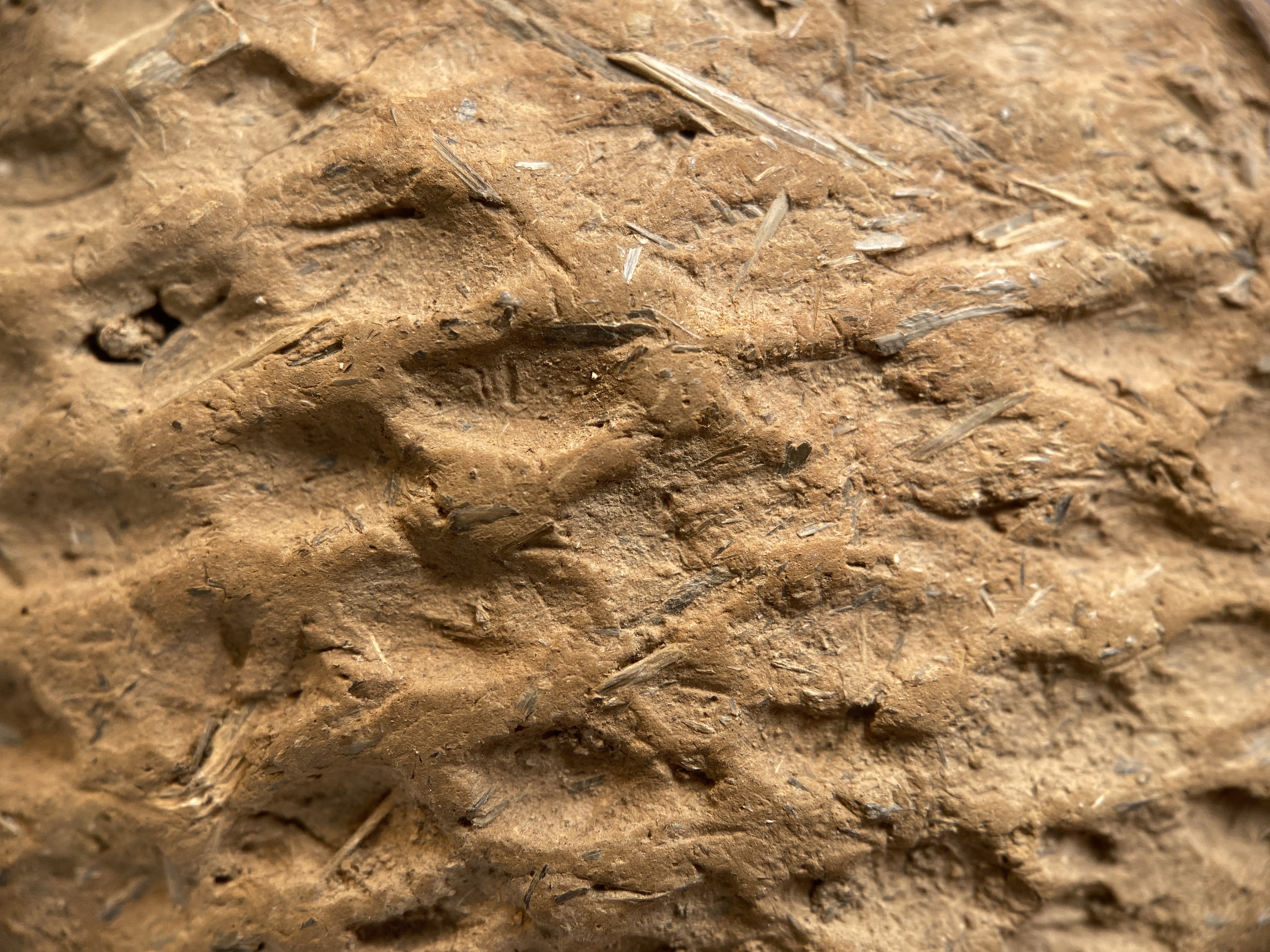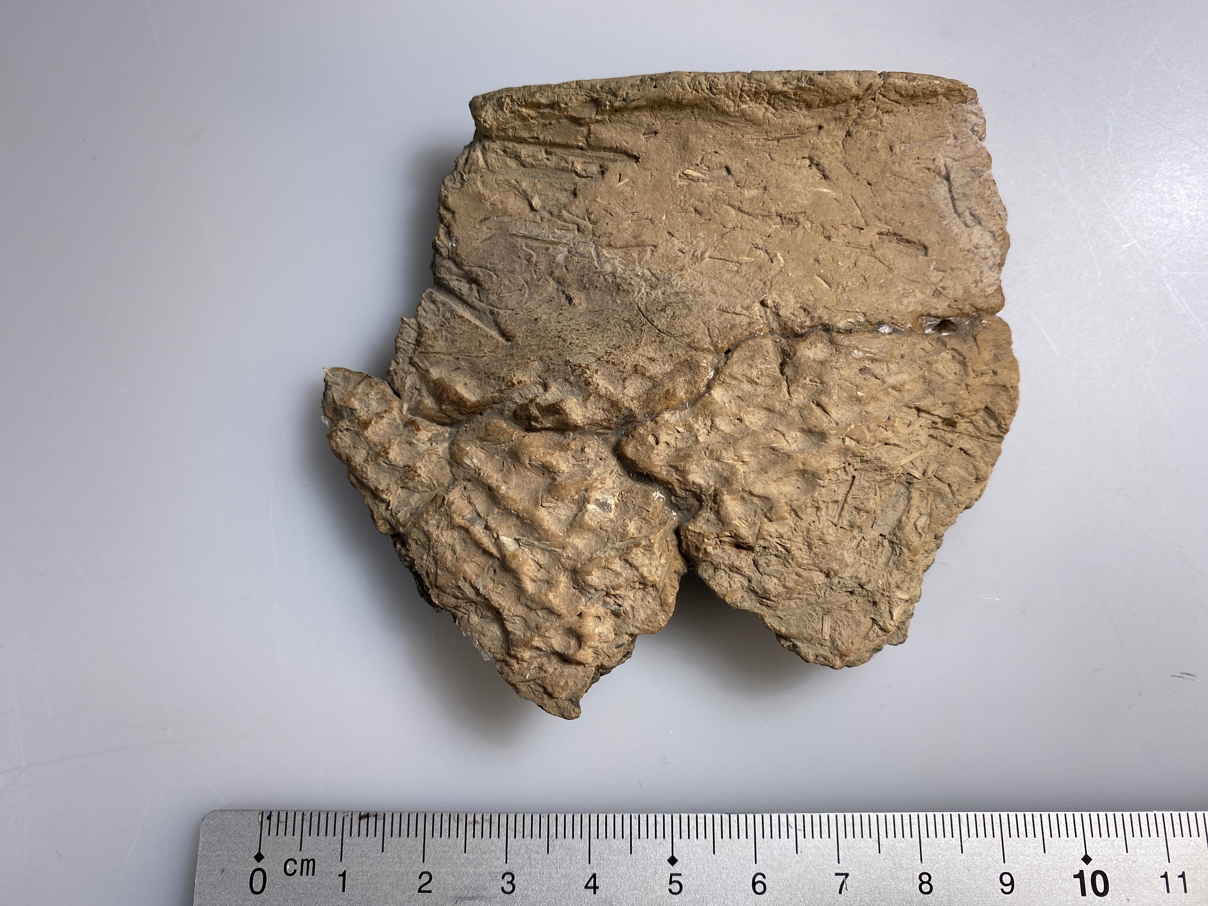 mynningsparti med glättad yta överst och därunder grovt textilintrycik. textilkeramik. Asbestmagring