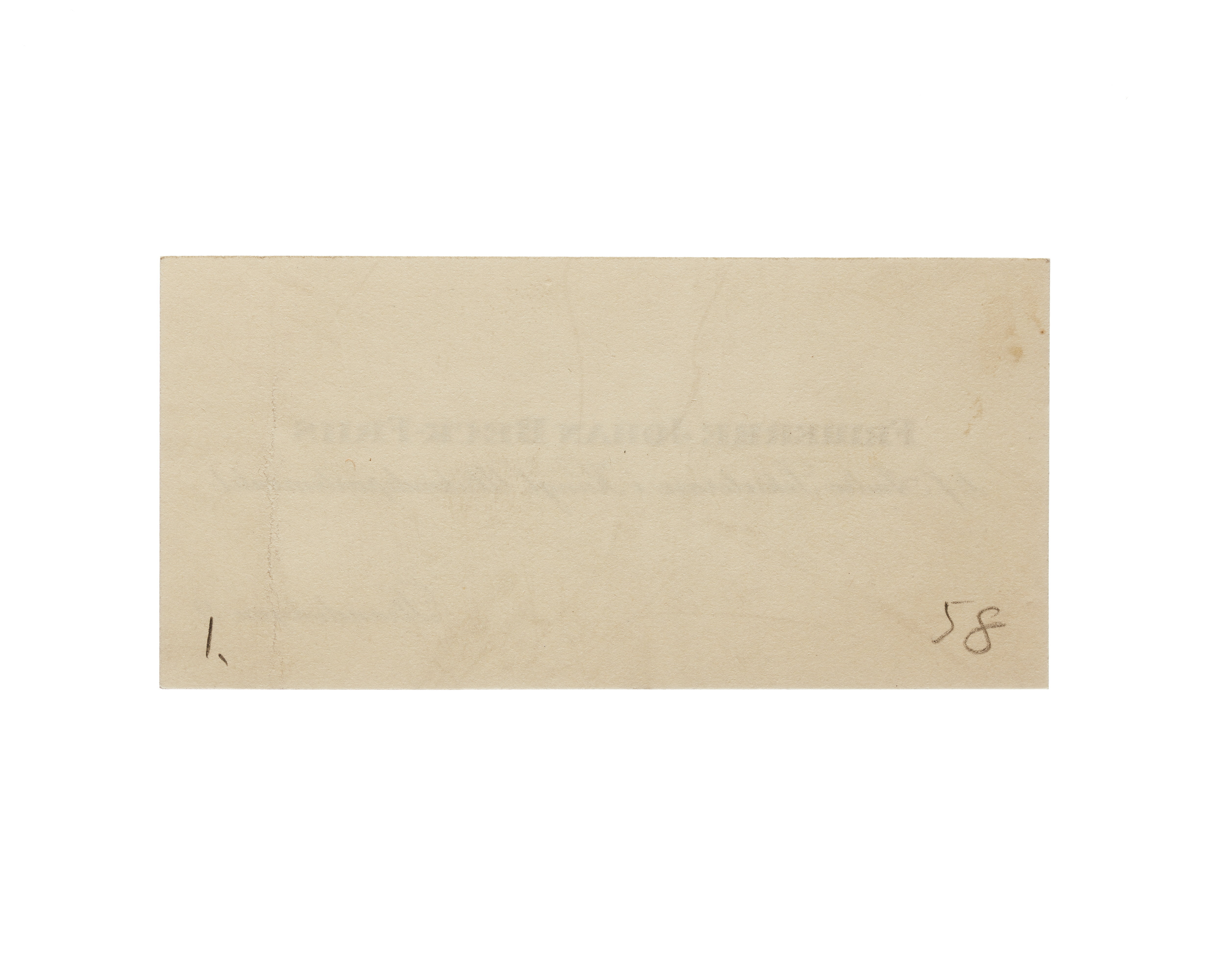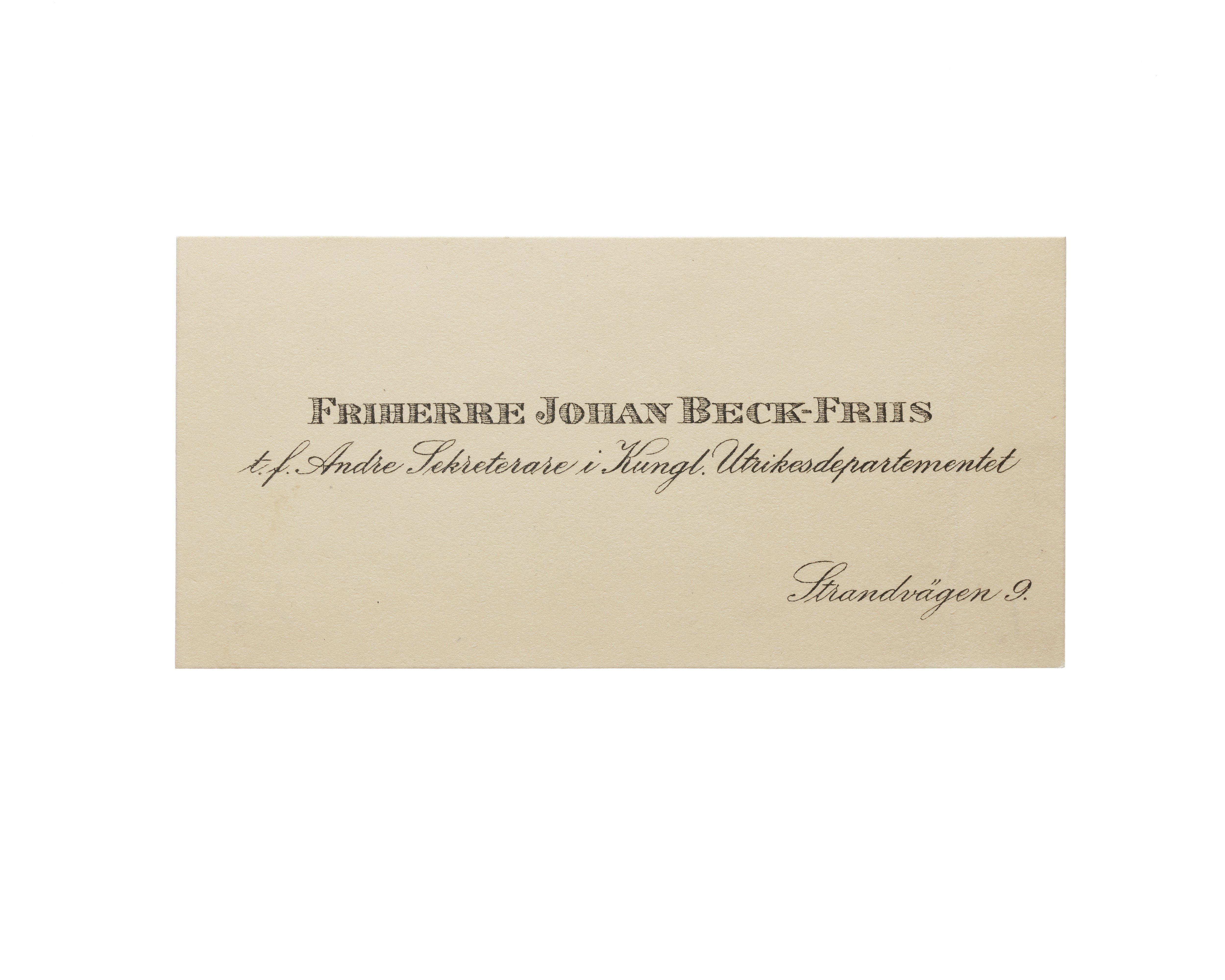 Ett visitkort från friherre Johan Hugo Beck-Friis, t. f. andra sekreterare i Kungl. utrikesdepartementet, utan datum, adress (nedre högra hörnet) Strandvägen 9. Vikt i högra sidan.