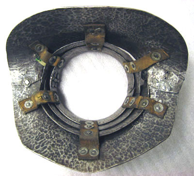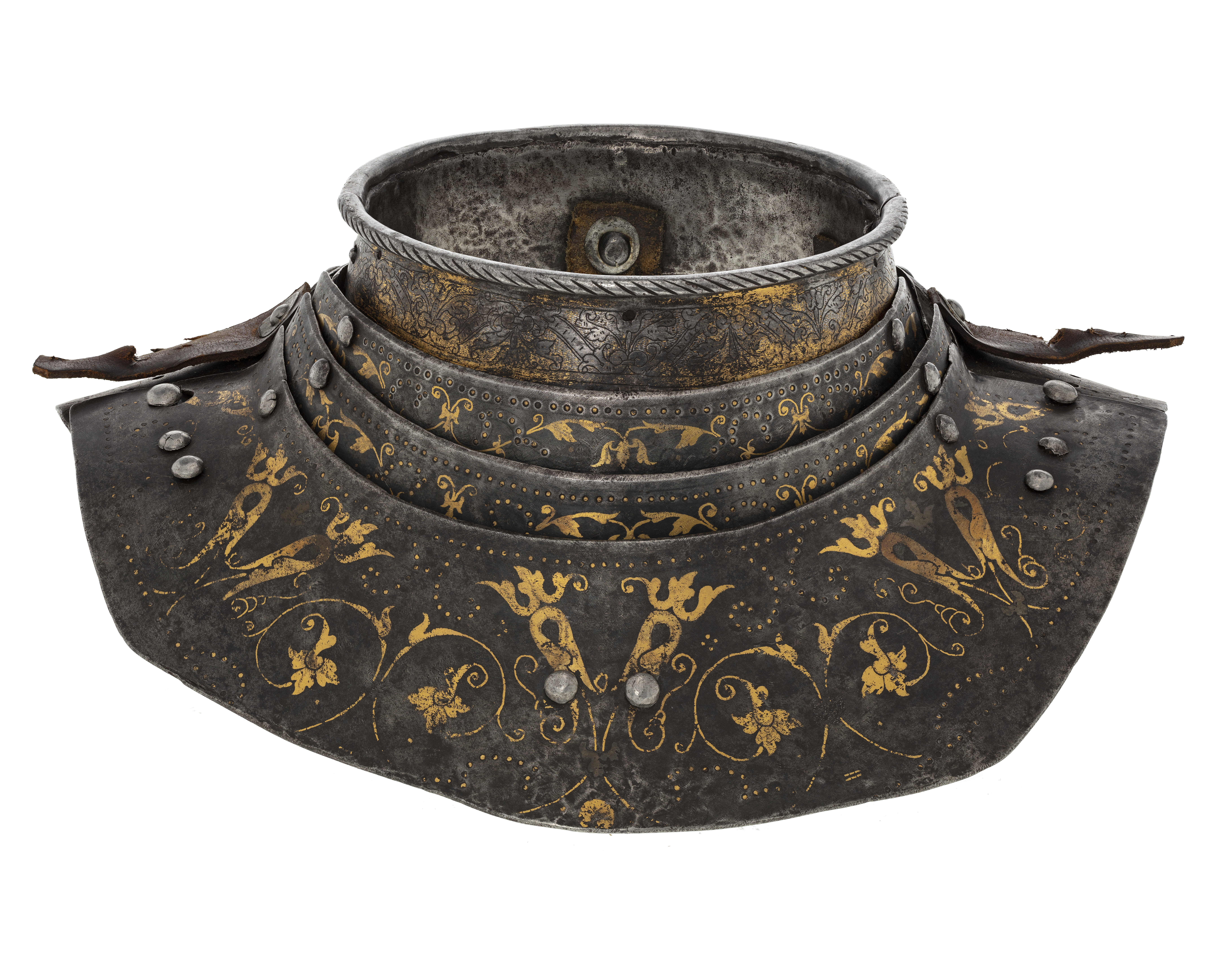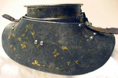 Driven stålplåt med på utsidan rankdekor av påslaget guld mot mörk botten. Insidan brunaktig med tydliga slagmärken. Sammanlagt sju delar. Bestående av ett främre och ett bakre stycke av tre resp. fyra välvda skenor, fästade omlott med sex nitade ljusbruna sämskade läderband på insidan. De översta två skenorna bildar ett rör. Övre kanten omvikt, rundsmidd och dekorerad med filade snedställda tunna linjer. Öppningsbar med i vänster kant gångjärn, i höger tapp genom nyckelhålsformat hål. Mellanparti av tre skenor, framtill två och baktill en. Nederst två större skenor, uppdragna och böjda över axlarna. Bröstskenan nertill spetsig, bakstycket brantare med rak kant. Framtill driven svagt spetsig mittås över alla skenor. Över nedersta nackskenan vid var axel en läderrem, l 80 mm. Synliga blanka nitskallar över axlarna, även mitt bak och mitt fram två stycken. Dekor: Blånerad yta med skrafferade partier med påslaget guld och silver i form av slingrande rankor och blommor. Över och genom detta mönster löper slingor av punsade och guldfyllda prickar. På översta skenorna (själva kragen) en bård med etsad och förgylld dekor av bladverk.