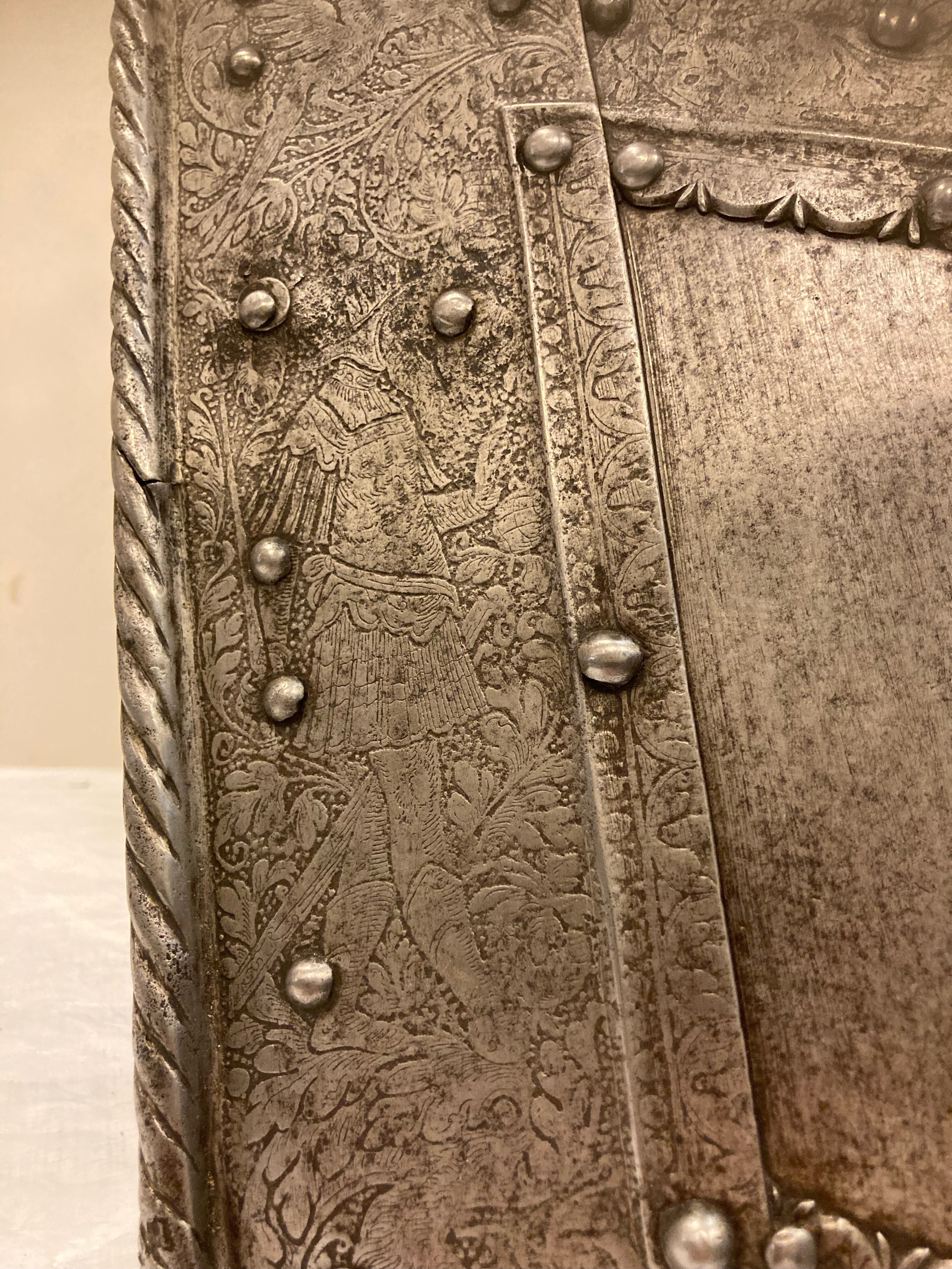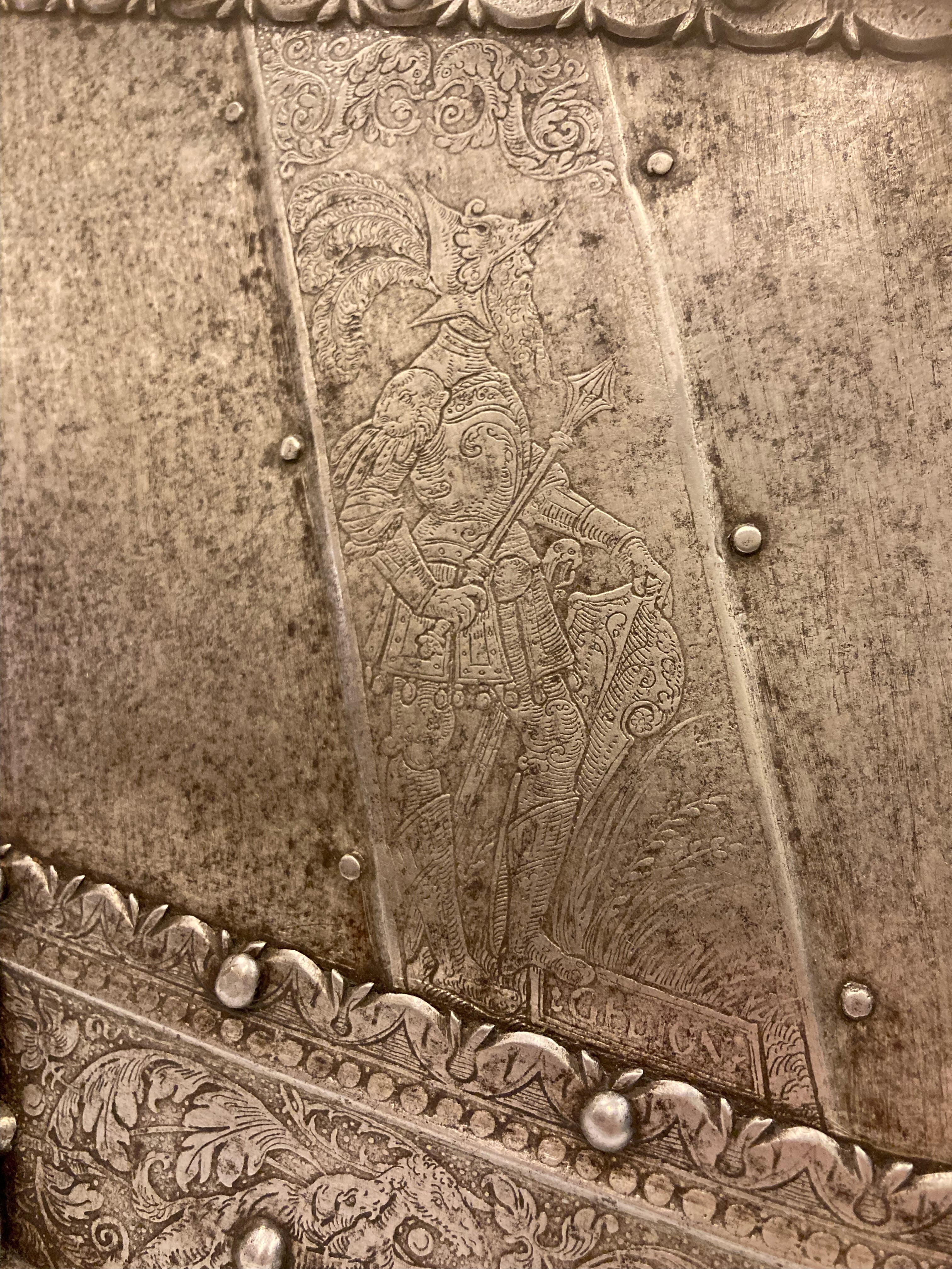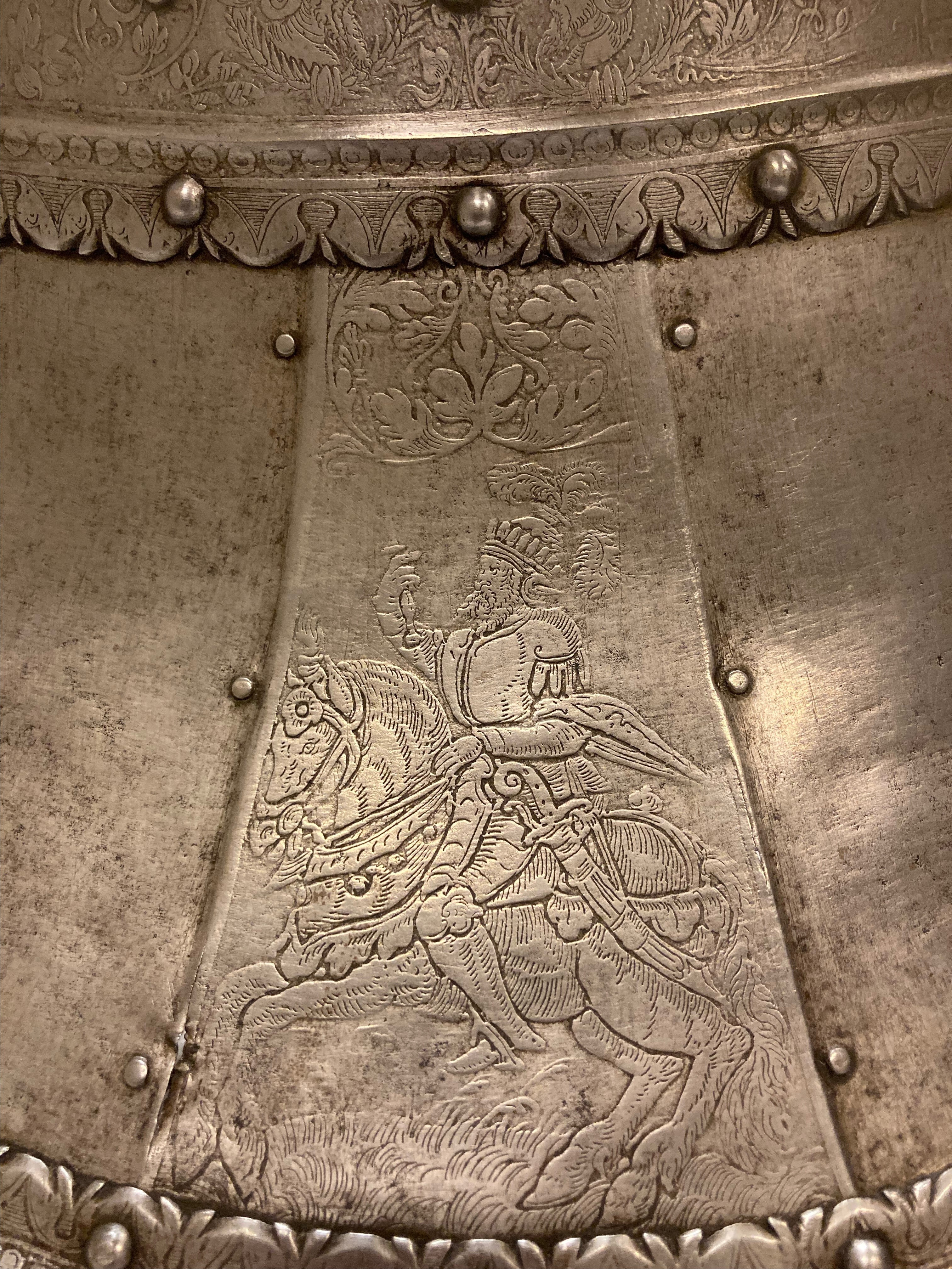 DEKOR: Omedelbart ovan nederkanten en etsad bård med jaktmotiv med jägare, villebråd och hundar och ovan denna etsad pärlstavsdekor. Hela nederkanten, inklusive den etsade bården utgörs av ett separat fastnitat stycke. Dess överkant är filat till formen av hermelinsvansar som korresponderar med den vågformiga etsningen, påminnande om en mantel. Omedelbart nedanför ovankanten etsad bård avbildande växtornamentik med medaljonger med porträtt samt fåglar och puttos. Motsvarande kant som nedre bårdens ovankant. På vänstra bakkanten stående kvinnofigur med ett svärd och våg(?), möjligen Justitia. Längs högra bakkanten en stående mansfigur iklädd antikiserande rustning, med krona på huvudet och en spira i höger hand. På höger sidstycke upphöjt panel med etsad stående mansfigur, iförd antikiserande rustning och med en spira i höger hand. Vid figurens fötter en ram med texten "GEDION". Längre fram ytterligare en panel med stående figur i delvis antikiserande rustning, delvis rustning av 1500-talstyp och med ett svärd i höger hand. Vid figurens fötter ram med svårtydd text. Framstycket, mellan de två bucklorna, tre upphöjda panelen. På vardera panelen en bepansrad ryttarfigur hållande i spira. På vänstra sidstycket, längst fram, en panel med stående bepansrad mansfigur ned spira i höger hand och svärd i vänster. Vid fötterna en ram med texten "IOSAPHAT", Längre bak, ytterligare en panel med stående bepansrad mansfigur med en spira i höger hand. VId fötterna en ram med texten "AMAZIA".