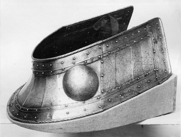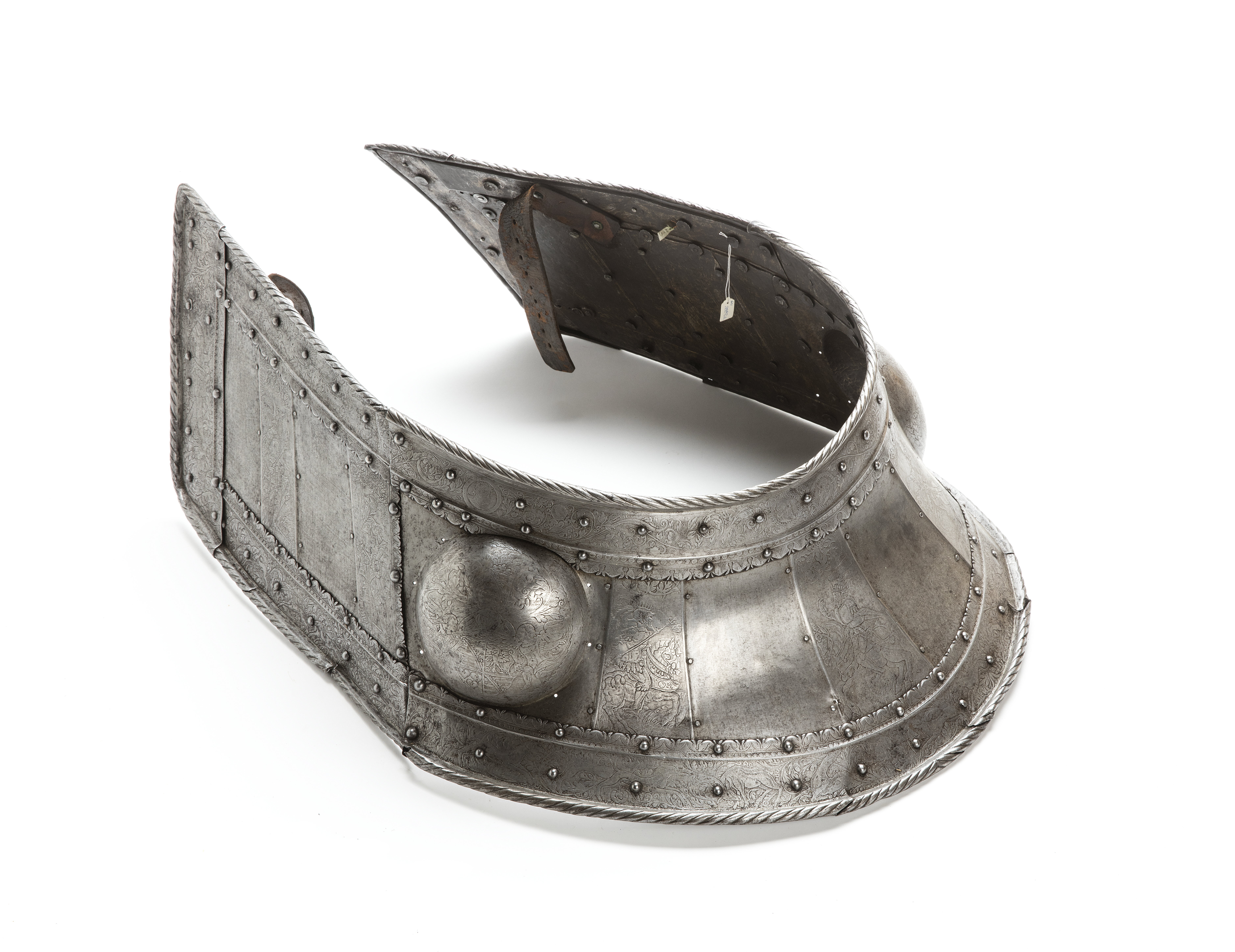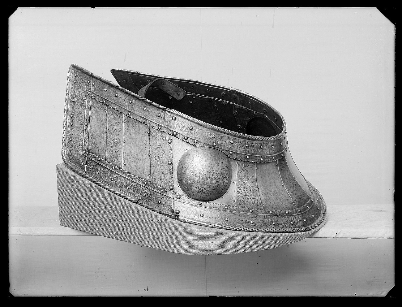 DEKOR: Omedelbart ovan nederkanten en etsad bård med jaktmotiv med jägare, villebråd och hundar och ovan denna etsad pärlstavsdekor. Hela nederkanten, inklusive den etsade bården utgörs av ett separat fastnitat stycke. Dess överkant är filat till formen av hermelinsvansar som korresponderar med den vågformiga etsningen, påminnande om en mantel. Omedelbart nedanför ovankanten etsad bård avbildande växtornamentik med medaljonger med porträtt samt fåglar och puttos. Motsvarande kant som nedre bårdens ovankant. På vänstra bakkanten stående kvinnofigur med ett svärd och våg(?), möjligen Justitia. Längs högra bakkanten en stående mansfigur iklädd antikiserande rustning, med krona på huvudet och en spira i höger hand. På höger sidstycke upphöjt panel med etsad stående mansfigur, iförd antikiserande rustning och med en spira i höger hand. Vid figurens fötter en ram med texten "GEDION". Längre fram ytterligare en panel med stående figur i delvis antikiserande rustning, delvis rustning av 1500-talstyp och med ett svärd i höger hand. Vid figurens fötter ram med svårtydd text. Framstycket, mellan de två bucklorna, tre upphöjda panelen. På vardera panelen en bepansrad ryttarfigur hållande i spira. På vänstra sidstycket, längst fram, en panel med stående bepansrad mansfigur ned spira i höger hand och svärd i vänster. Vid fötterna en ram med texten "IOSAPHAT", Längre bak, ytterligare en panel med stående bepansrad mansfigur med en spira i höger hand. VId fötterna en ram med texten "AMAZIA".