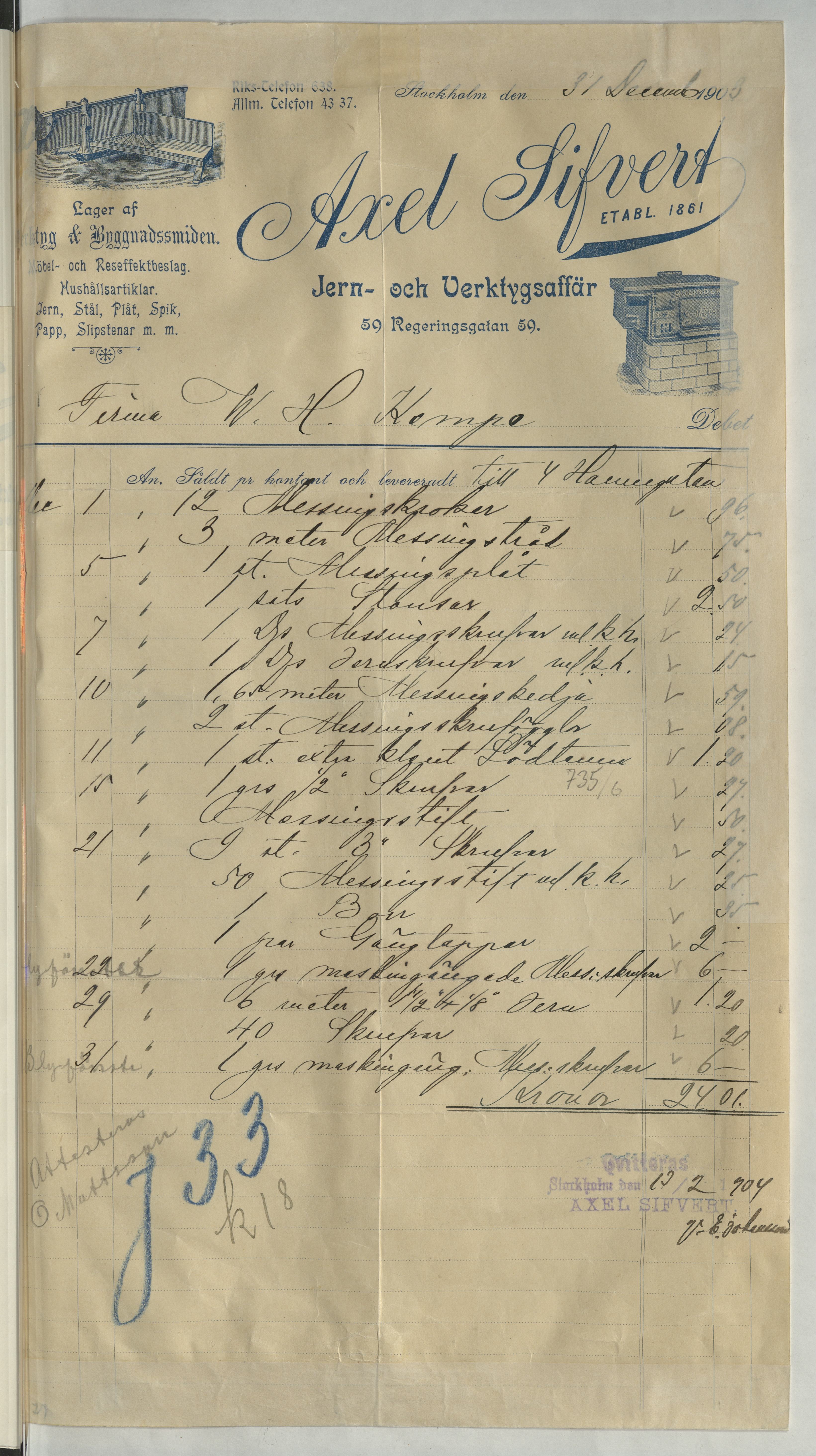 Kvitto från Axel Sifvert, Jern- och Verktygsaffär. Stockholm, 1904.