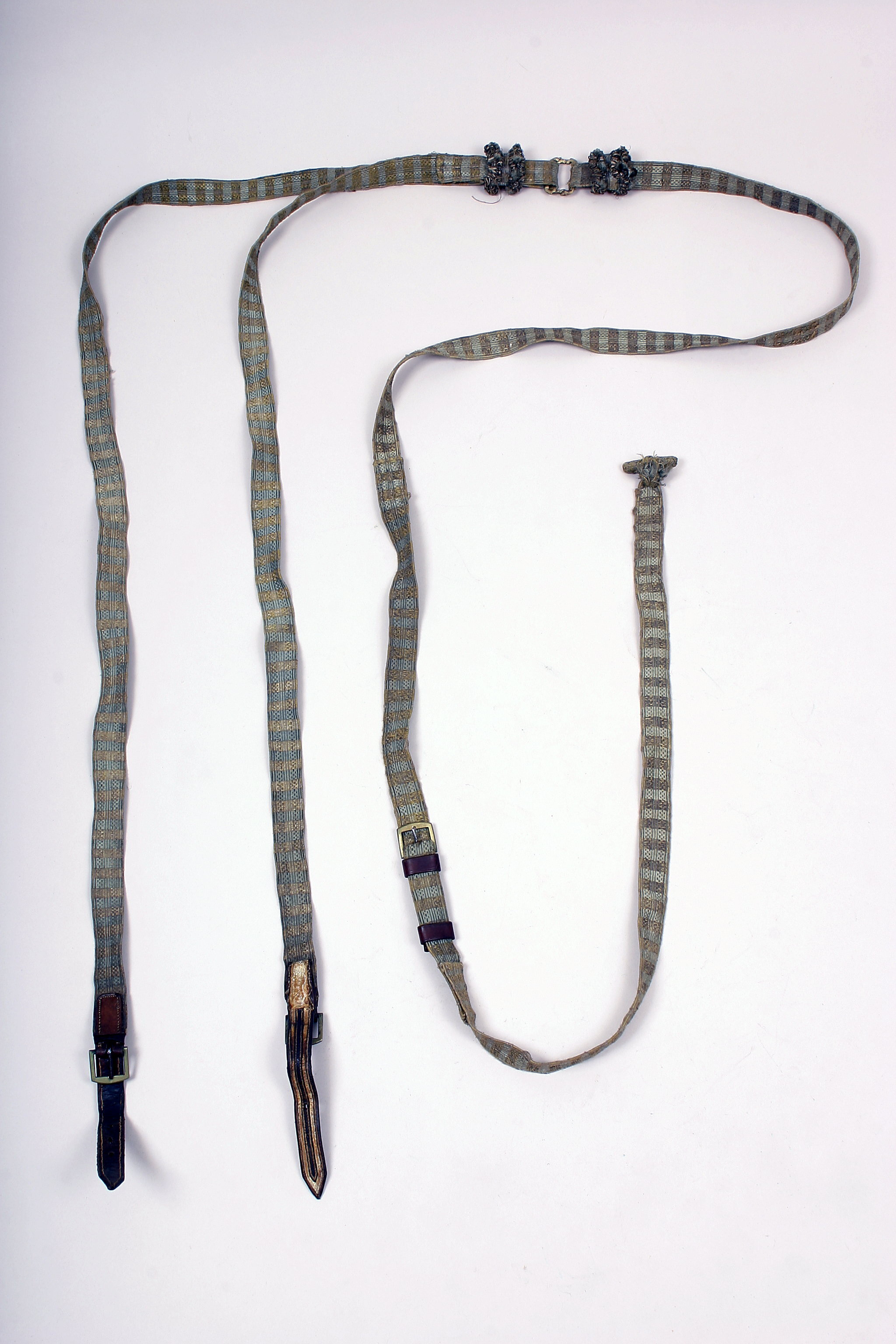 Tömmar vävda av blekt blå siden- och guldtråd. Löpare, bandformad, kantad med snörmakeriarbeten som har guldtråden virad kring smala vitläderband. Valknuten utgöres av rektangulär förgylld mässingsbygel, gjuten med bladdekor och med en hälla utformad som löparen. I ändarna fastsydda läderremmar med dekorsömmar, svarta och vita målade längsgående målade ränder. Sölja rektangulär av gjuten, förgylld mässing. Efter valknuten är tömmarna skarvade på två ställen, med en påträdd läderrem med två hällor och en förgylld mässingssölja. I änden en liten blå-gul silkestofs och en kort tvärstång, klädd med flätad blå silkes- och guldtråd.