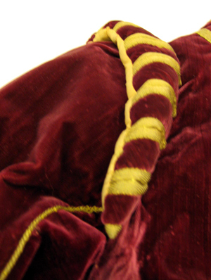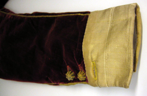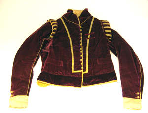 Jacka av purpurröd sammet, kantad med smala guldgaloner och med guldtrensar av tvinnade snoddar täckandes sömmarna. Framstyckena är rakt skurna, kantade av en knäppning bestående av 12 höga träknappar, klädda med ett snörmakeriarbete av guldtråd, samt av motsvarande knapphål, b. 24 mm. Knäppningen ramas in av guldgalon. På vardera framstycke är iskuret en horisontell ficka, l. 175 mm, kantad av en slå, b. 30 mm. Jackan har en ståndkrage, h. 80 mm. Ärmarna är långa, sydda av två stycken, med inner- och yttersöm. Vid ärmslutet förekommer ett sprund i yttersömmen, l. 116 mm. Sprundet knäpps med hjälp av tre knappar. Ärmuppslagen är av orangegult sidenrips med inslag av guldtråd, b. 62 mm. Över axelsömmarna sitter vadderade axelkarmar med slitsar, kantade av smala guldgaloner. Ryggstycket är tillskuret av tre stycken med en ryggsöm och med två sneda sidsömmar. Jackan har en midjesöm som bildar en skörtkappa, b. 65 mm. På bröstet på vänster sida sitter påsytt två horisontala sammetsband, troligen för fäste av två ordenskraschaner eller för fäste av kappan. Jackans framstycken är vadderade vid brösten. Den är på insidan fodrad med gulorange taft och i ryggen med vit linnelärft. Fodret består av flera stycken.