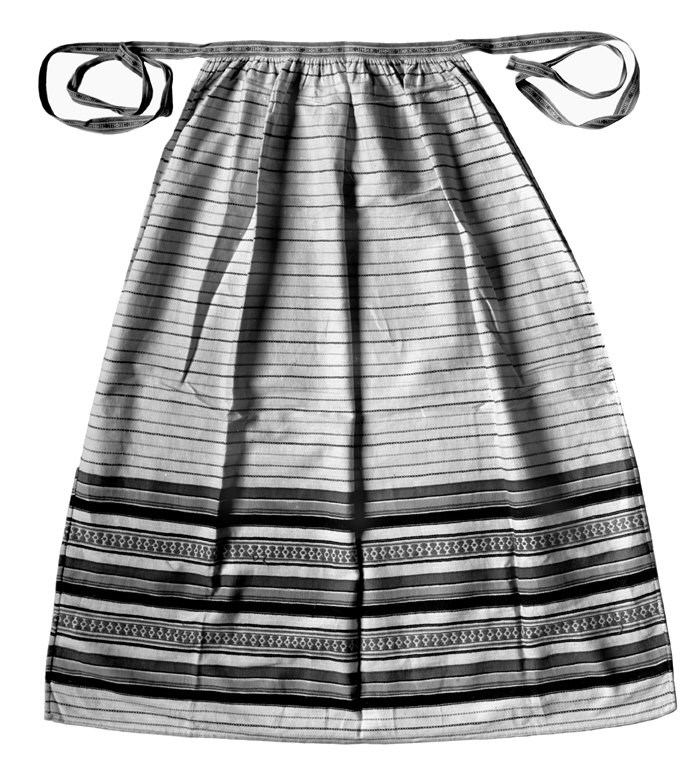 ARBETSFÖRKLÄDE Av bomullsgarn, med varptrådar i vitt och inslagstrådar i flera färger. Långt, med tvärgående ränder och bårder i flera färger och nyanser. Längd: 86 cm.; bredd: 76 cm. Gåva till Wilhelmina von Hallwyl Julaftonen 1889 från hennes dotter Ebba Johanna Cecilia von Eckermann. Inköpt av Ebba hos Blekinge Slöjdförening i Karlskrona. Begagnat av Wilhelmina under åren 1897-1902 vid bindning av ljuskronor.