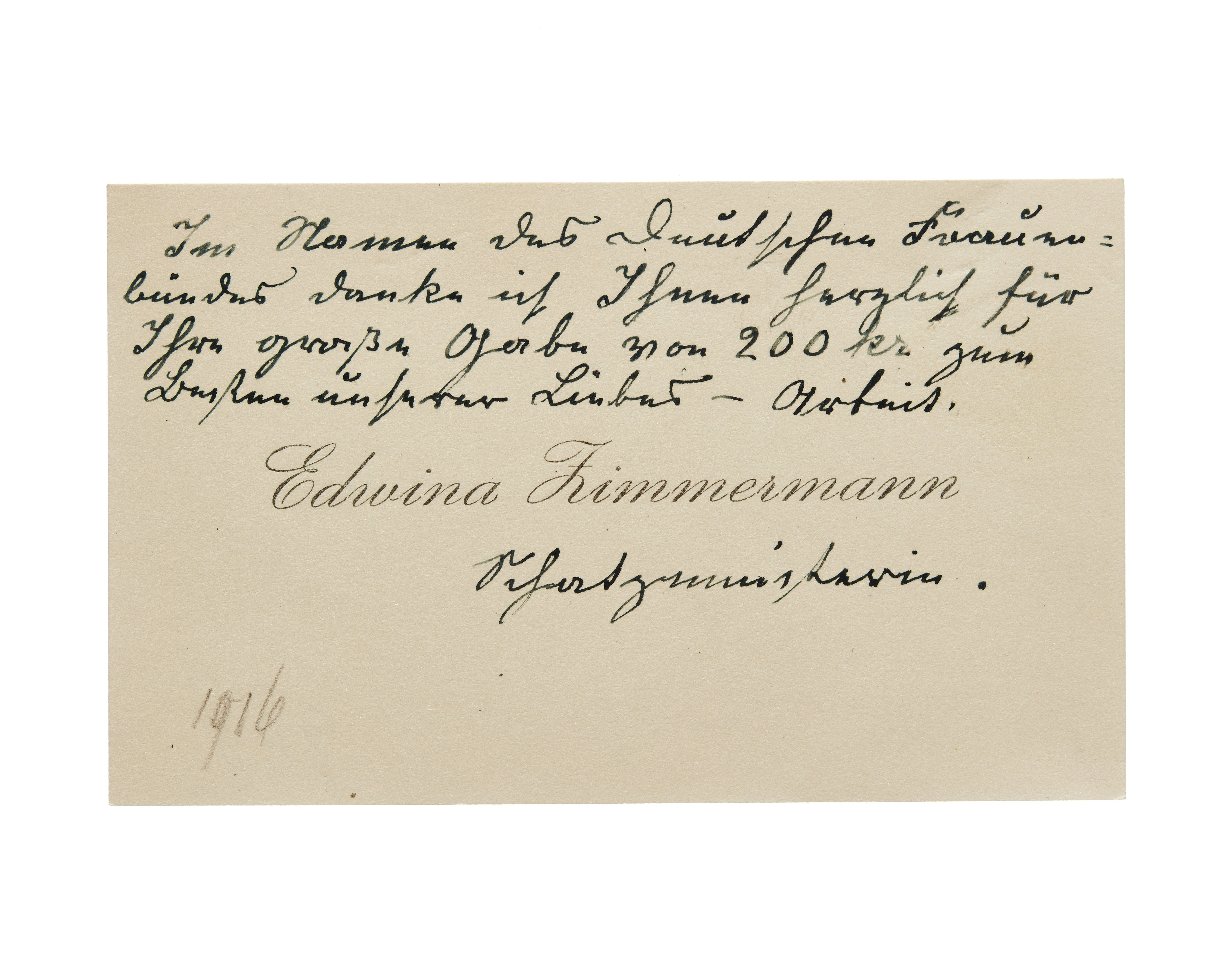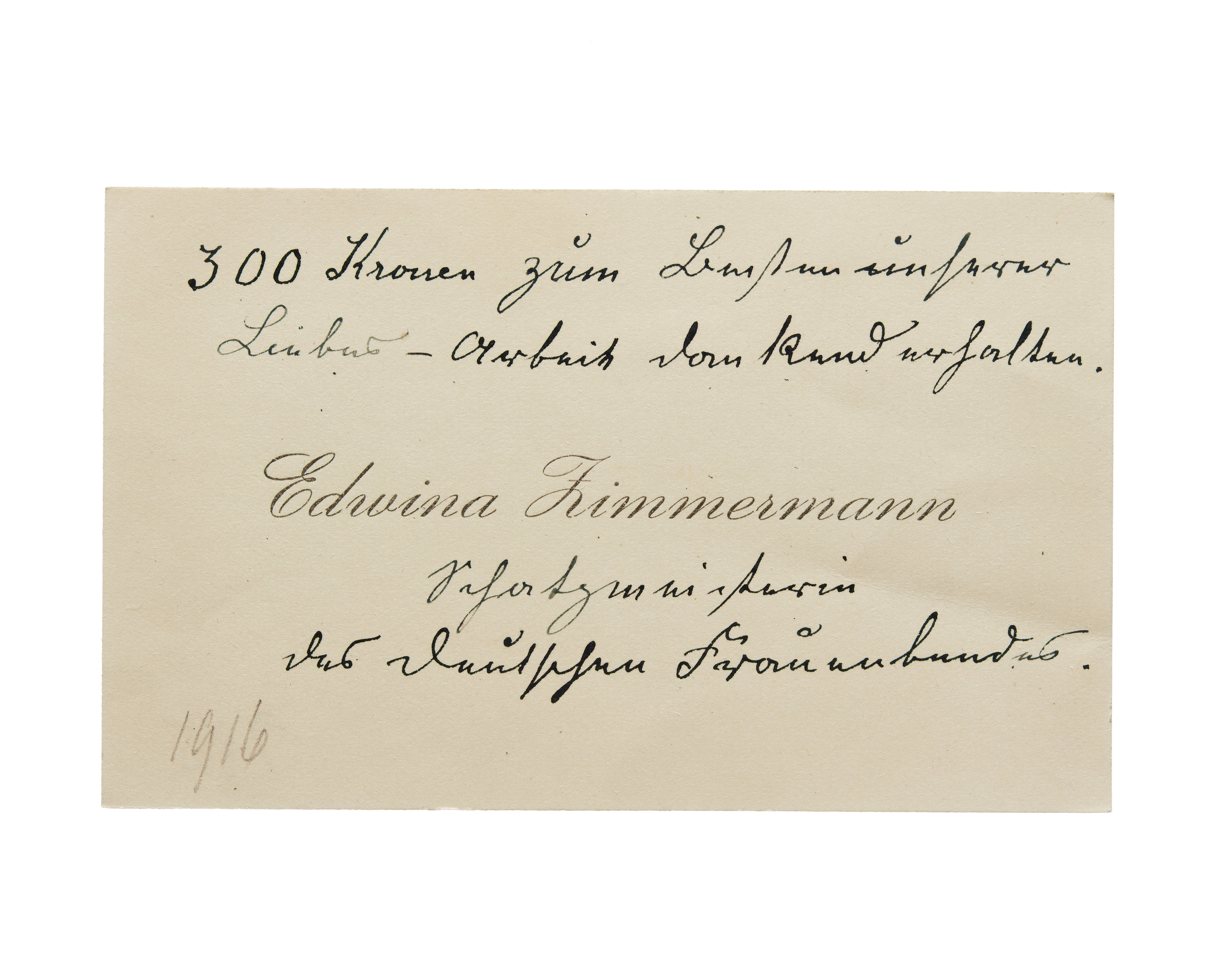 Två visitkort från Edwina Zimmermann. Första kortet daterat 1916. Handskrift "...". Andra kortet daterat 1916. Handskrift "...".