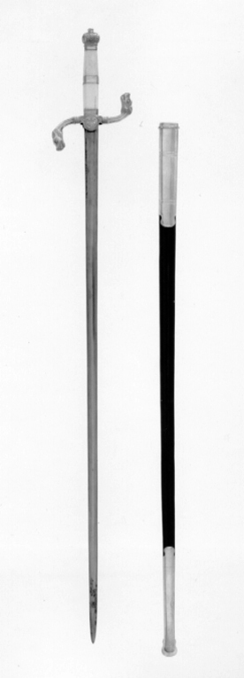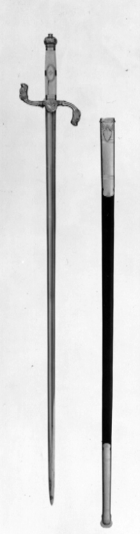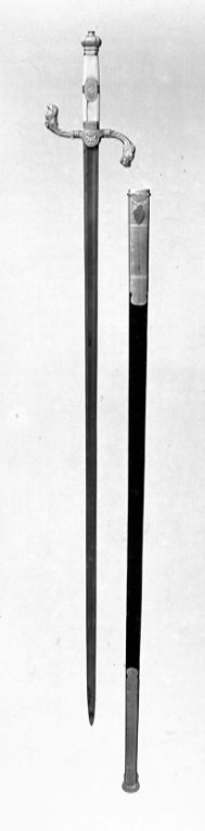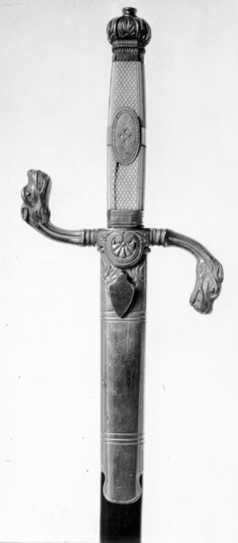 Balja klädd med svärtat läder. Munbleck, b: 152 mm och doppsko med släpsko, b: 167 mm av förgylld mässing. Munblecket med bågformig nederkant, dekor av inslagna linjer. Koppelhake i sköldform. Runt koppelhaken punsad dekor i form av ett ekblad. Urtag för styrskenan. Doppskon har samma rundade avslutning, kantdekor av inslagna linjer, symmetrisk släpsko. Har tillhört Karl XIV Johan, nr 538 i Karl XV:s samling, 1872 förvarad i Adjutantsrummet på Stockholms slott. Avbildad på Kiörboes ryttarporträtt av Karl XIV Johan, 1843-1844.