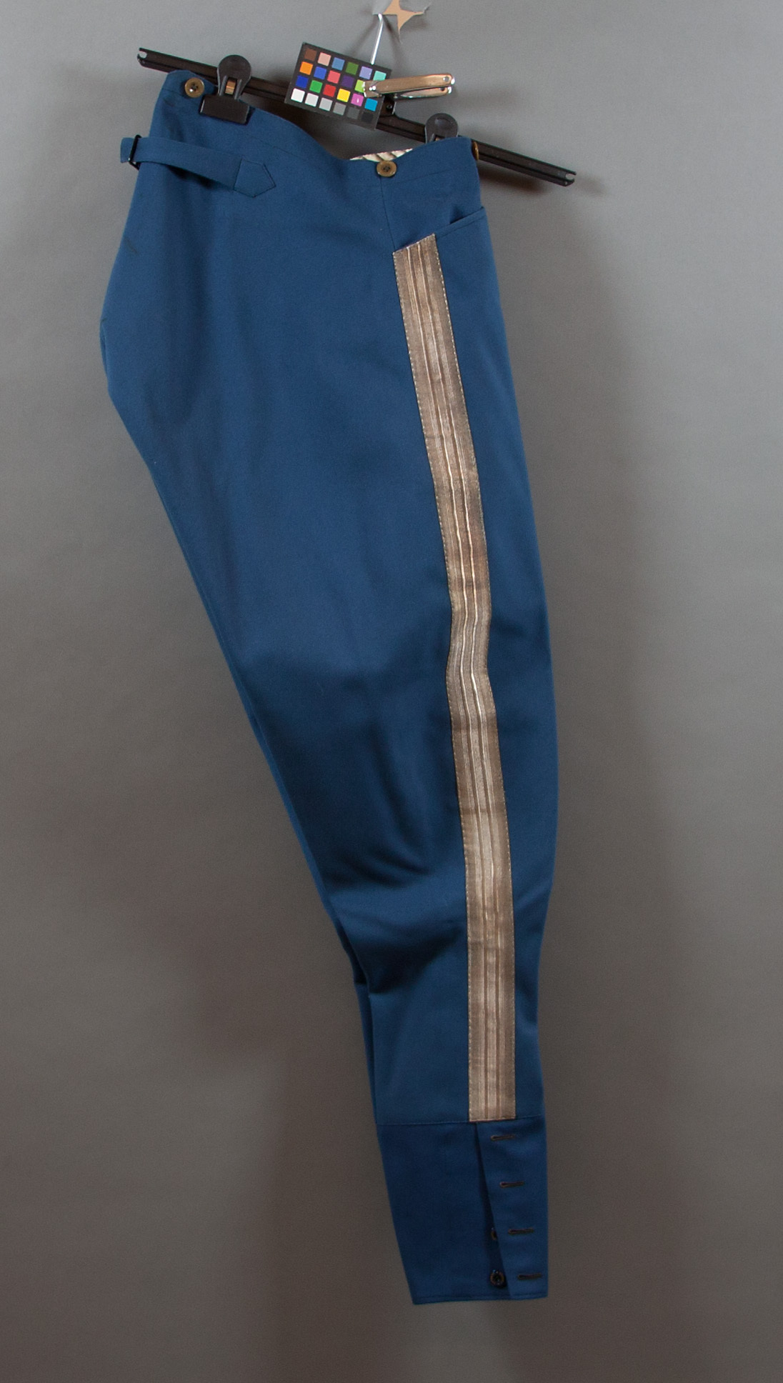 Ridbyxor av mellanblått kläde, knäppta med gylf med fem knappar av grönaktig plast. På en av knapparna firmanamn: "ZITTORIN & LUNDVIK, STOCKHOLM". I linningen sex knappar, alla med firmanamn.Mitt bak spänntampar med svartlackerad sölja med text: "FW&S". Tvärställda fickor. Utmed sidsömmen en 40 mm bred silvergalon avslutad 160 mm nedifrån med sprund och fyra små blånerade stålknappar, d: 13mm, med text: "SOLIDE NEUHEIT". Foder i linningen av brun-beigetrandigt siden samt svart siden. Fickor av vit bomull.