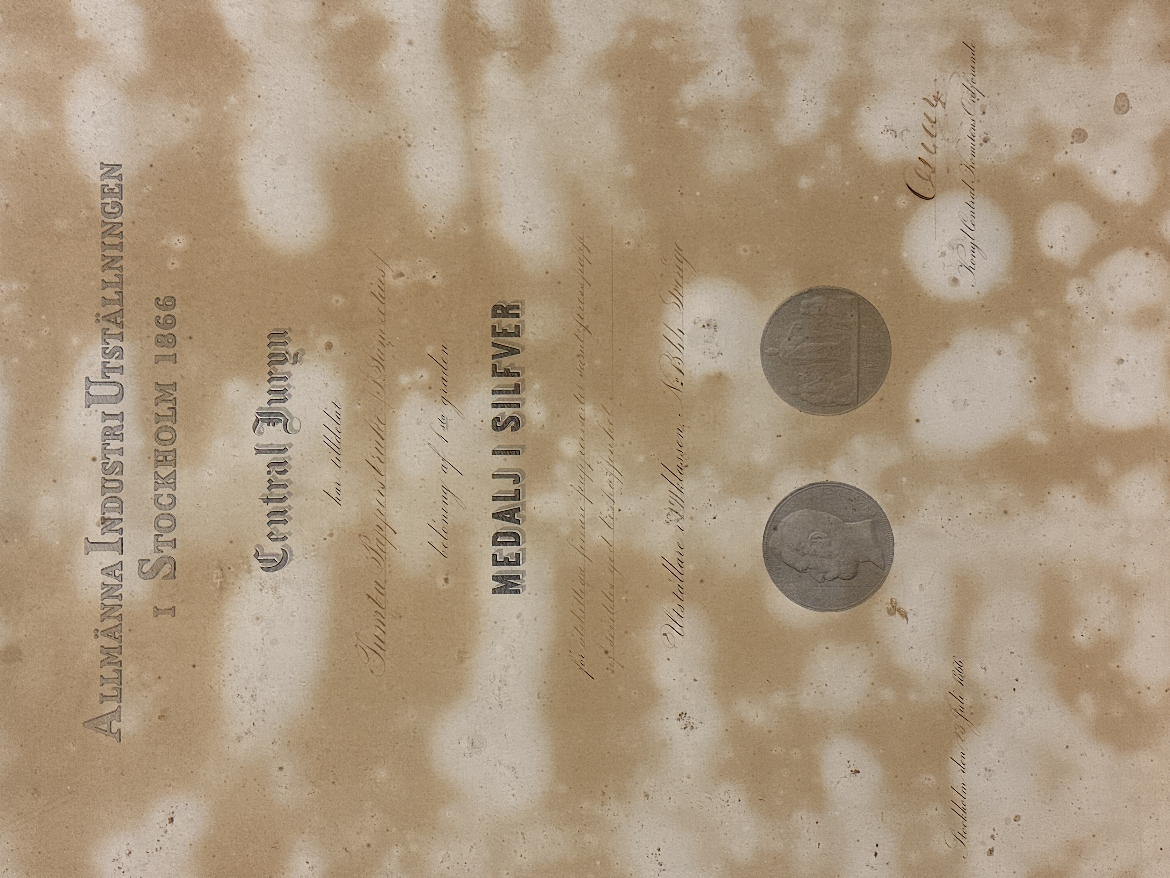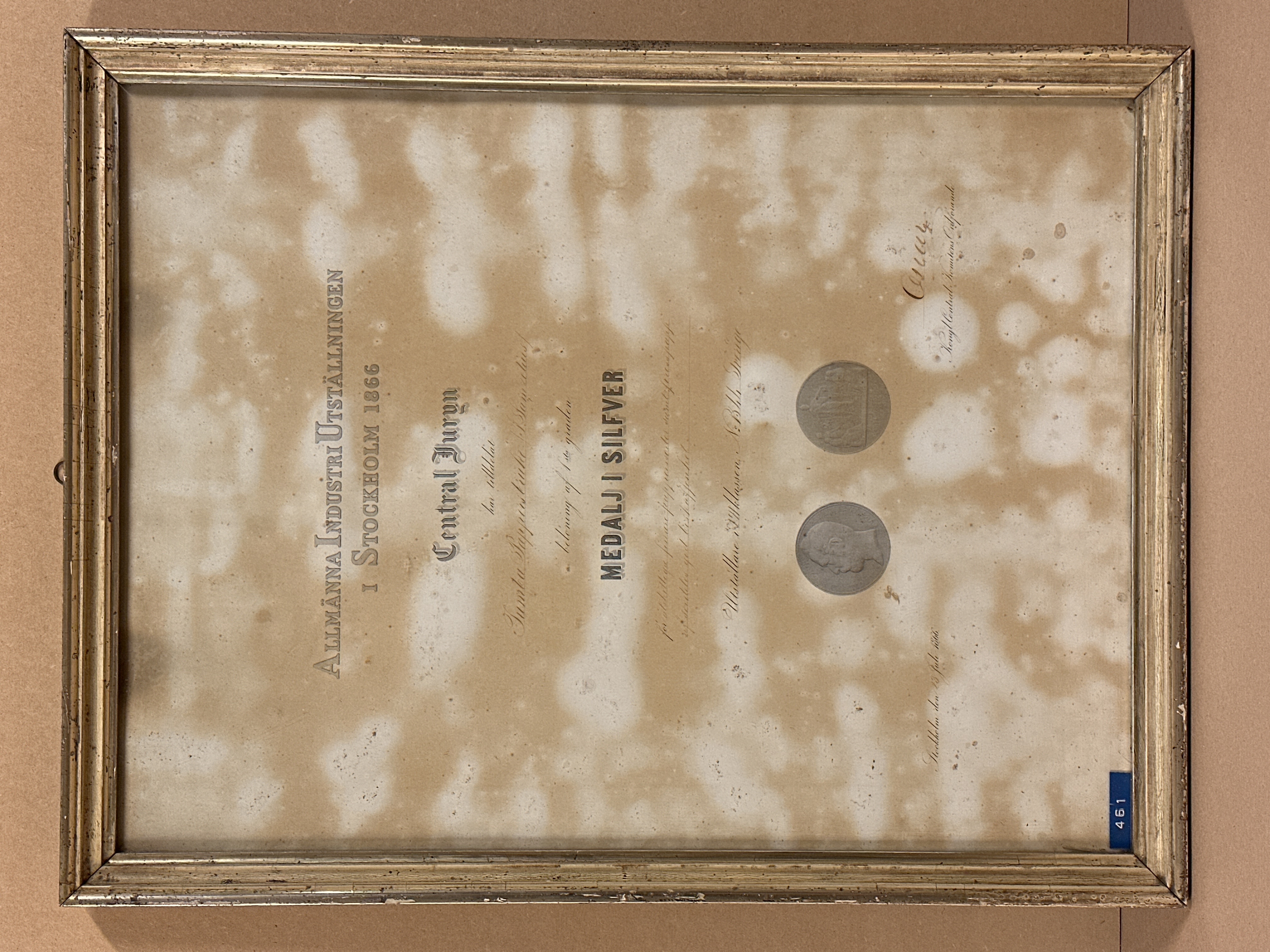 Tavla. Diplom för medalj i silver vid Allmänna industriutställningen i Stockholm 1866. Diplomet med text, både tryckt och handskriven, på papper placerat innanför profilerad och förgylld träram. Ramen med framsida i glas och baksida i trä. Baksidan även med ögla i metall för upphängning på vägg. Texten på diplomet lyder: Allmänna Industri Utställningen i Stockholm 1866 Central Juryn har tilldelat Tumba Pappersbruks / J. Samzelius / belöning af 1sta graden MEDALJ I SILFVER för åtskilliga finare papperssorter samt presspapp af serdeles god beskaffenhet. Utställare i I´II(?) Klassen N: 1344(?) Sverige. Stockholm den 23 Juli 1866. Oscar Kongl Central Komitens Ordförande".