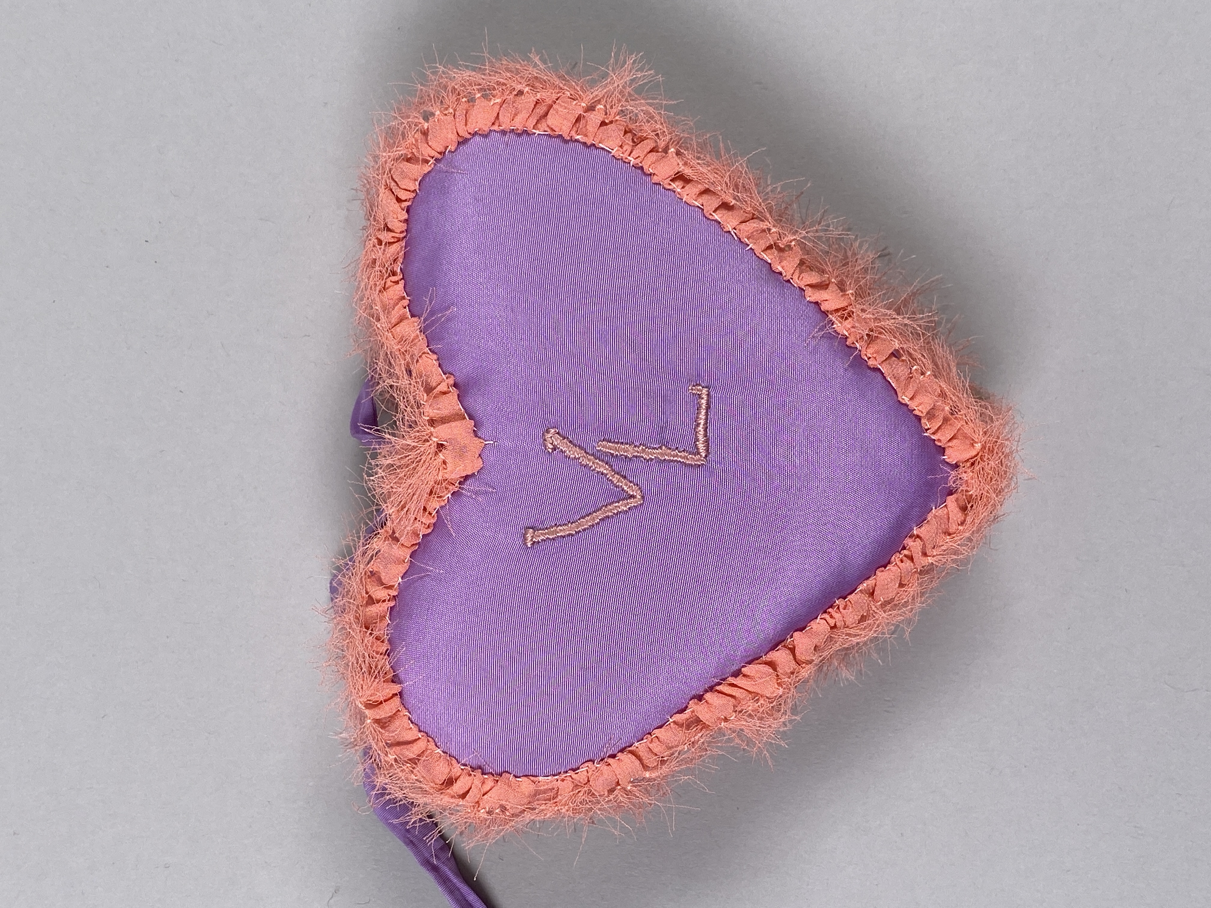 Minnesbok i hjärtform som kan knytas i mitten. Papper inuti med mjukt omslag i lila rayon med rosa frans. Hälsning och namn av tillverkaren inuti. Monogram VL på ovansidan.