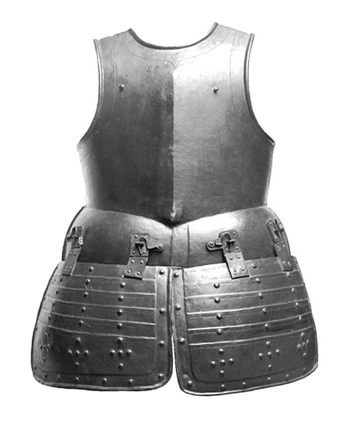 HALVRUSTNING. Bestående av bröstharnesk med lårskydd. Bröstharnesk h 46, b 42; Lårskydd l 22, b 33; Vikt med lårskydd 3,5 kg;