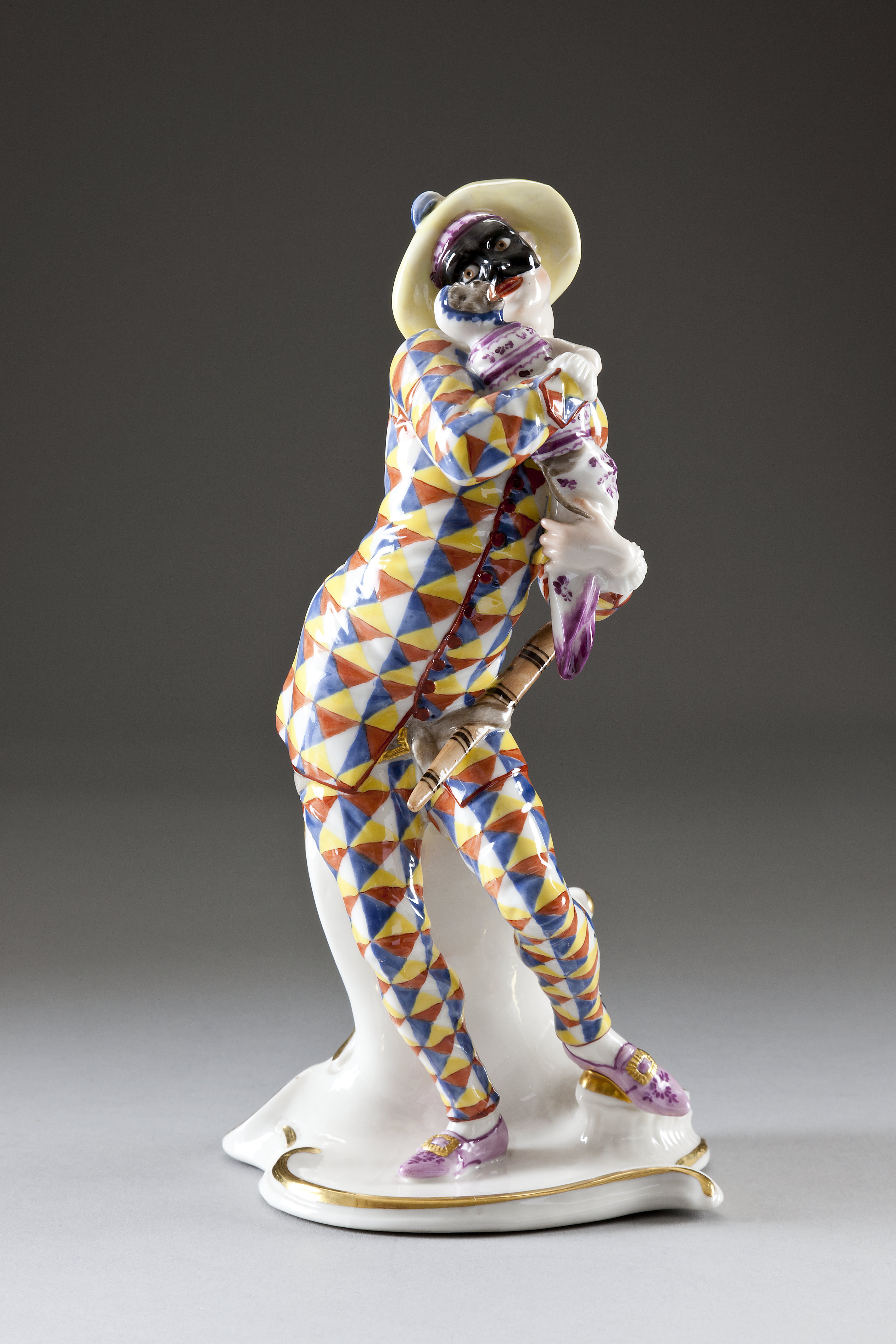 Stående figur iklädd rutig harlekindräkt bärande en markatta som ett lindebarn. Över ansiktet en svart halvmask på nästan oval fotplatta. Dekor i färger och guld på glasyren. Pendang till XII:P.a.a.05. Fabriken grundlagd 1747 i Neudeck ob der Au (vid München) av kurfursten Max av Bayern. Tillverkningen började dock först 1753 vid J.J. Ringlers ankomst. Fabriken flyttades senare,1761, till Nymphenburg. Pris: 65 Kr. Inköpt i tyska avd. på Baltiska utställningen i Malmö 15 Maj - 4 Okt 1914.