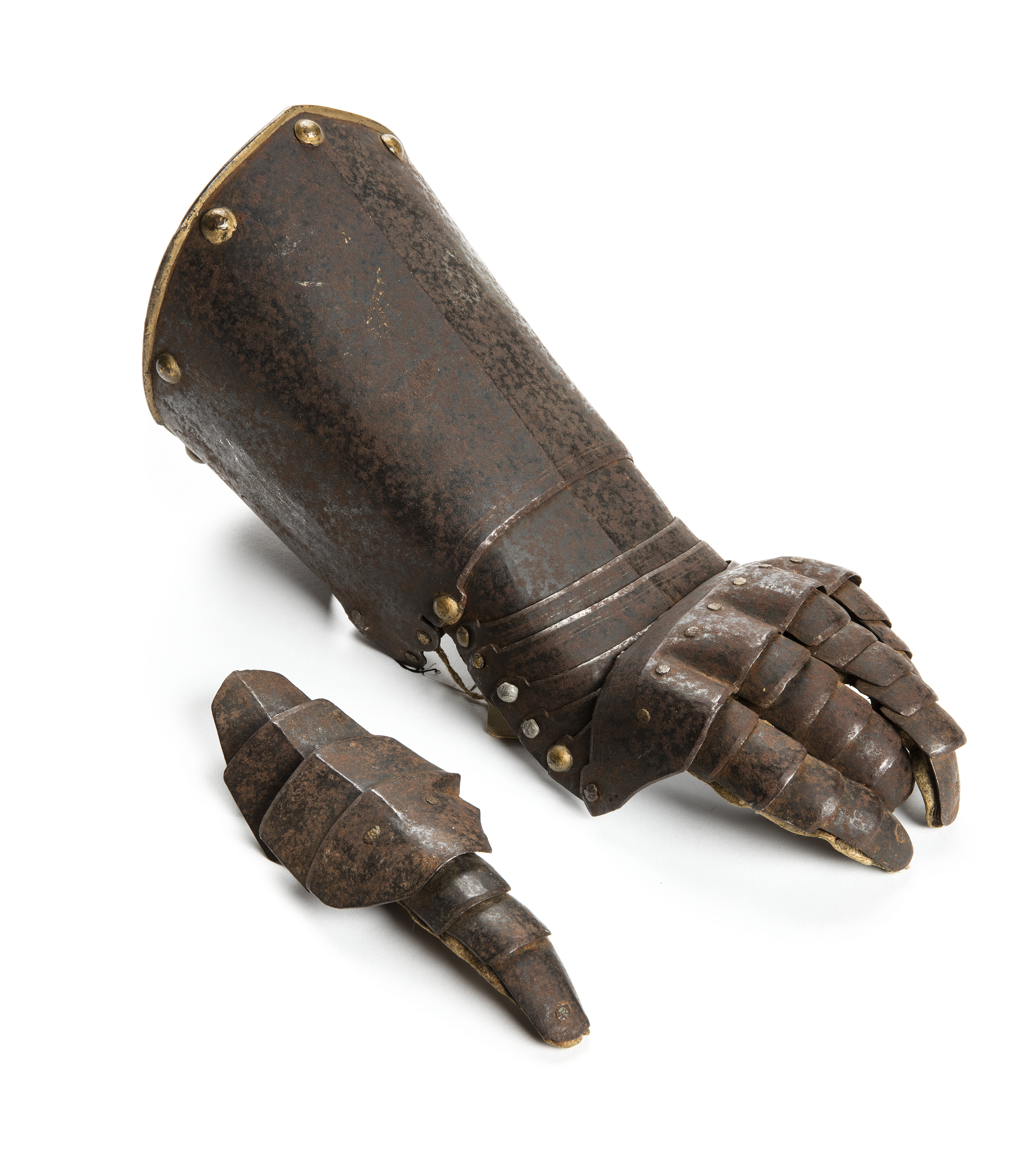 Troligtvis buren av greve Christian Rutger Dücker vid riddarspelen på Adolf Fredriks torg 1777. Rustningshandske, vänster hand, av mörk järnplåt, bestående av en krage som sammansatts av två plåtar varav den övre är 150 mm lång och den undre 80 mm. Kragen dekorerad med åtta förgyllda nitar som är fästa symetriskt längs den omvikta förgyllda kanten. På undersidan är en sölja fastnitad och i den är fäst en skinnrem i vilken en ögla är utskuren att fästa i niten på motsvarande sida, för att spänna fast armen. Från kragen finns sju välvda lameller överlappande och fästade i varandra med en förgylld nit på vardera sida, vilket skapar rörlighet. Enda mönster är två tunna, parallella linjer som återkommer på samtliga lameller och löper från ena sidan till den andra, samt en svagt upphöjd ås som går från kragens kant och fram till den sjätte lamellen, annars helt släta förutom den sjunde lamellen som har fyra bågformer längst fram för knogarna. I vardera av bågformerna är fästad en avlång bit sämskskinn i vilken fingrarnas lameller är fastnitade, sammanlagt 20 stycken bevarade, plåten längst ut på långfingret saknas. Tillkommer gör skyddet för tummen (har lossnat) som består av fyra bredare lameller som skyddande delar av handen ner mot handleden, samt tre smalare lameller för själva tummen. Även tummens lameller fästade med nitar på sämskskinn.