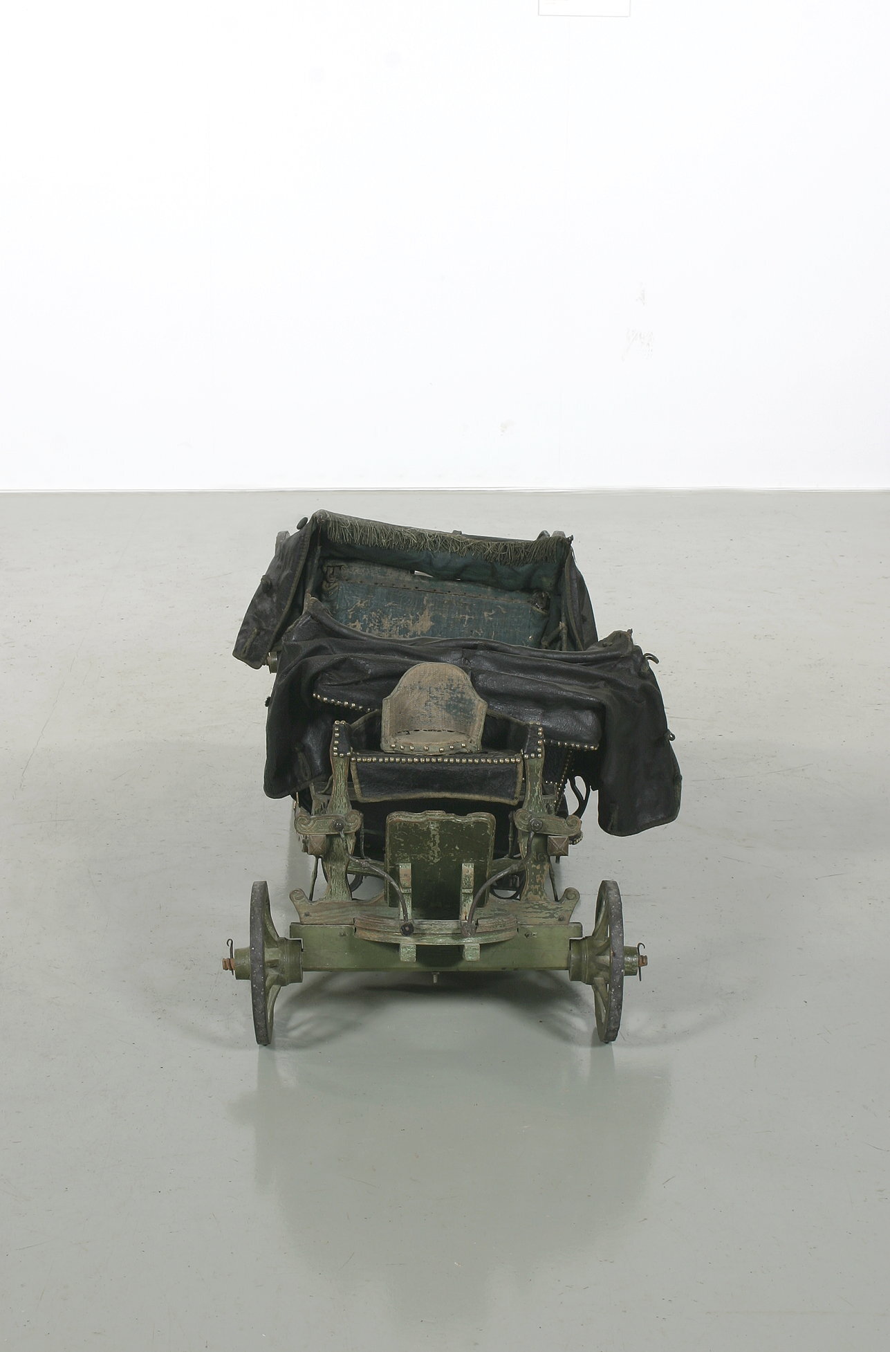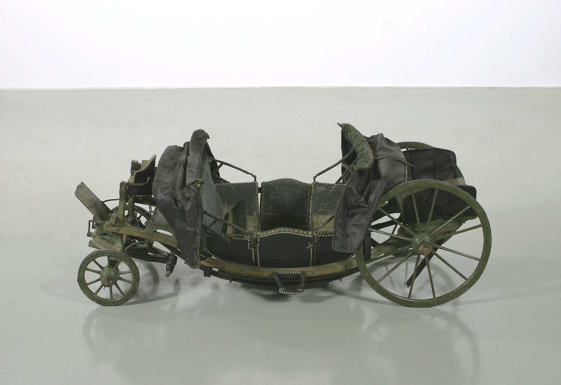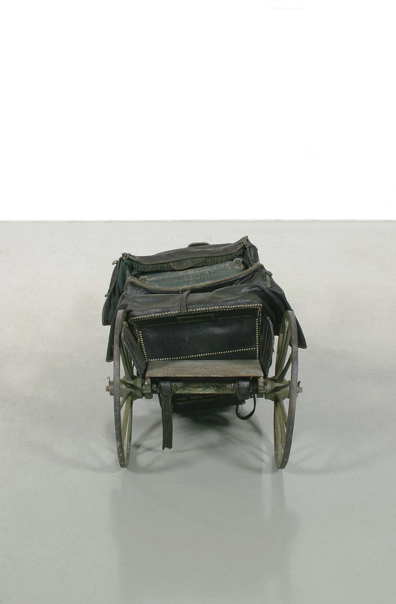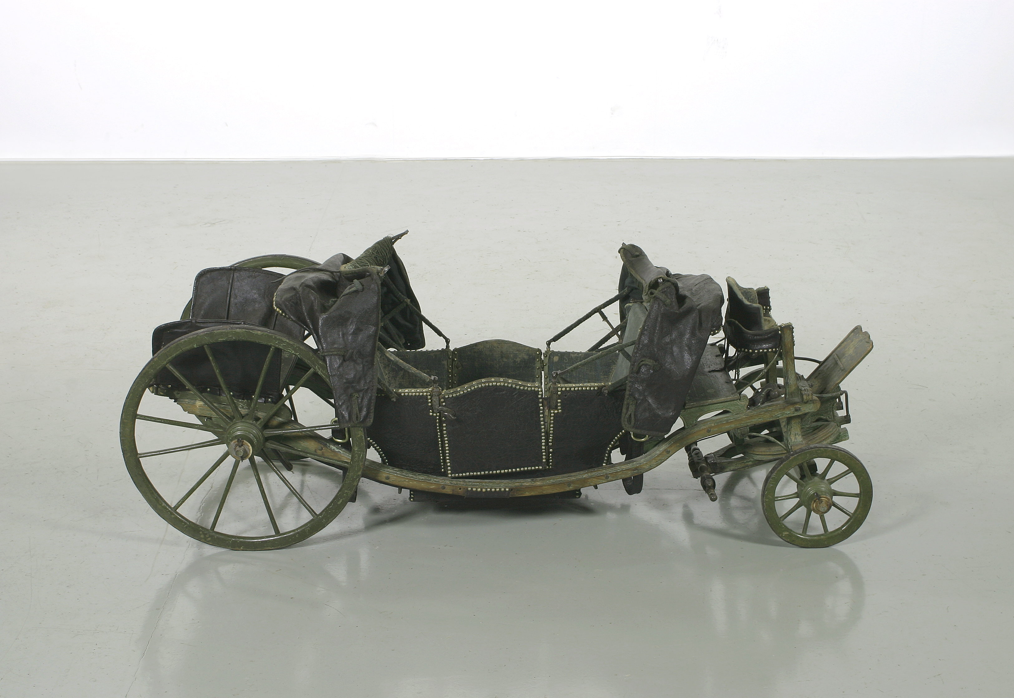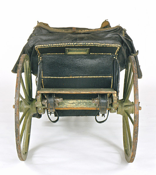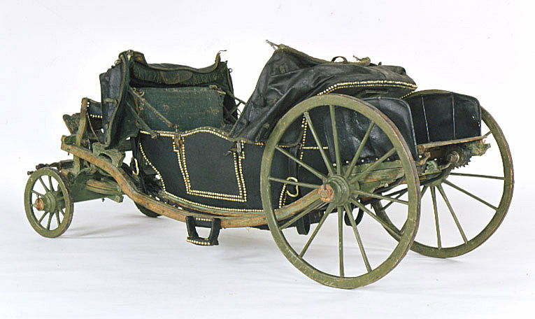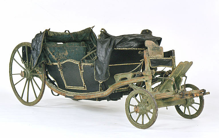Landå, resevagn, med vagnskorgens stomme av trä. Utvändig klädsel av svart läder; inuti grönblå schagg. Runt kanterna tännlikor av mässing och delvis garneringsband. Visavisäten. Förvaringsutrymme i vagnsgolvet och under sätena.Två dörrar med övre kanten uppsvängd i båge, vridhandtag. Nedre delen på insidan klädd med skinn. En suflett av svart skinn, fodrat med grönt tyg, över vardera sätet. Spröjsarna klädda med schagg. Rektangulärt fönster över vardera ryggstödet. I sufletternas framkant en grön frans, på utsidan remmar och knäppanordning av snoddar.Sufletten över baksätet har en kappa. Vagnskorgen fäst vid två längsgående remmar mellan fram- och bakvagnen. Remmarnas fästen vid den senare är valsartade och tjänar till spänning av remmarna. Hängremmar med spännen från de 4 hörnen löper runt bärremmarna. En bräda (med kvadratiskt hål) framför och en bakom korgen är fäst vid båda bärremmarna. Grönmålat underrede av trä med 4 hjul; framhjulen har 10 ekrar, bakhjulen vardera 12. Två bommar, som i längdriktningen löper mellan fram- och bakvagnen, utanför vagnskorgens sidor.Över framaxeln och dess vändkrans är den läderklädda kuskbocken fäst. Den har separat sits med svängda konturer. Nedhängande kappa. Fotbräda. Bakom kuskbocken en bagagehylla. Bakom vändkransen, mellan framaxel och korg, är springvåg och 2 svänglar monterade. Framför vardera dörren är ett läderklätt fotsteg fästat vid bommen. Över bakaxeln en bagagehylla, varav hälften kan fällas upp i 2 steg. På sidorna läderklädda stänkskärmar med stålstomme. Detaljer av underredet är snidade, bl.a. som voluter.