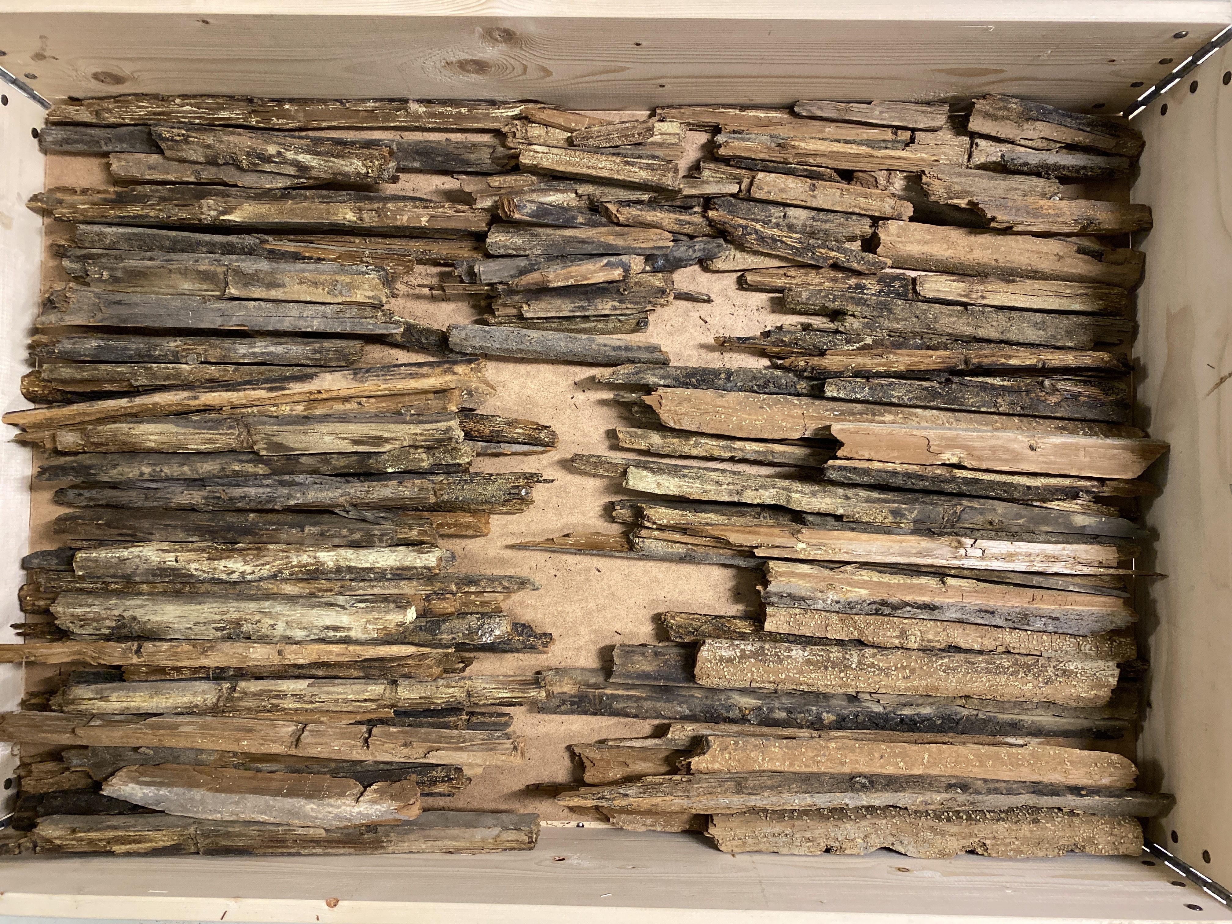 Pinnar med gula saltutfällningar, troligtvis svavel. Pinnarna är troligen rester från större vrakdelar men kan inte identifieras till vilka. Ihopsamlade från hyllorna i slottskällaren.