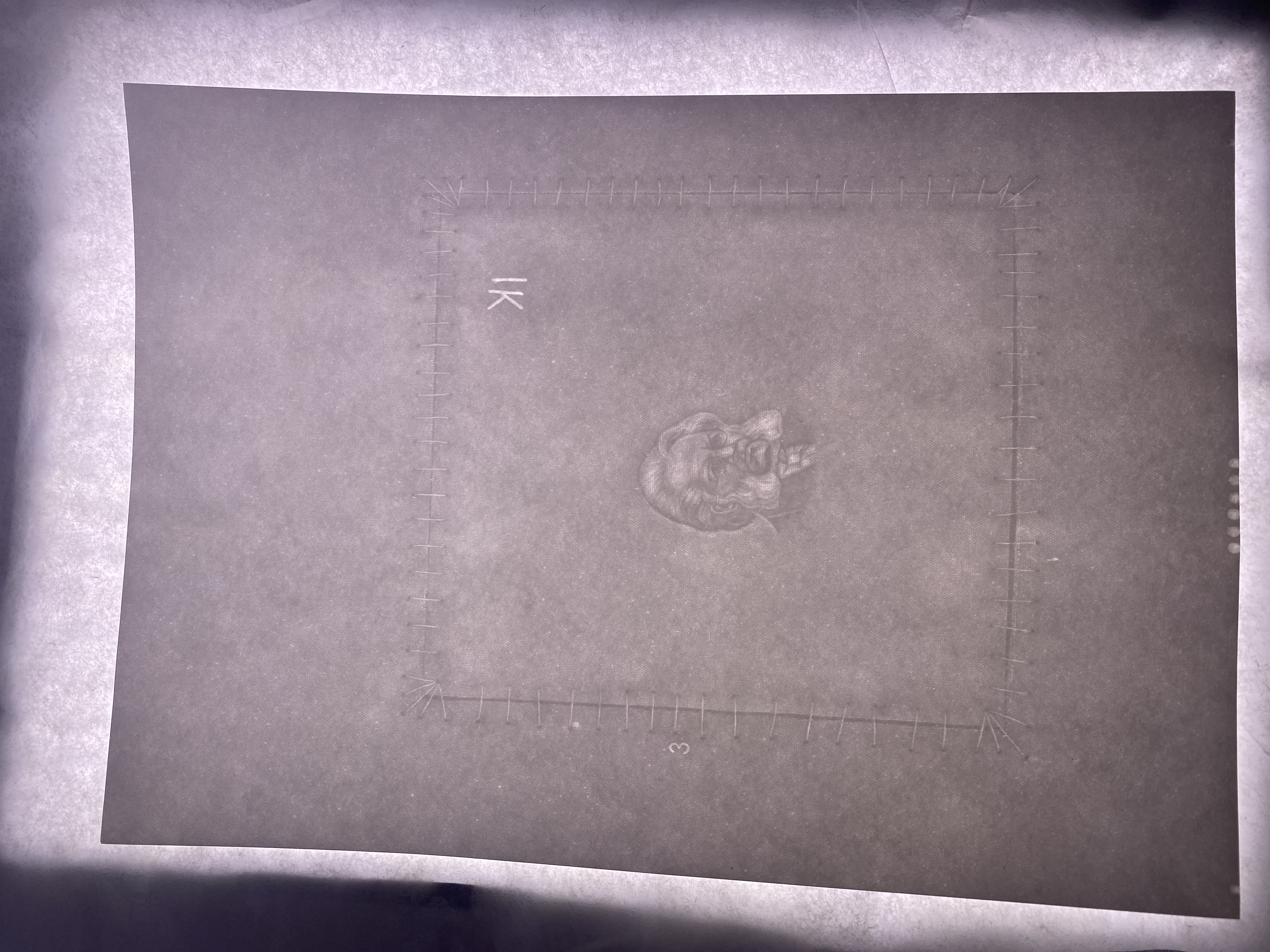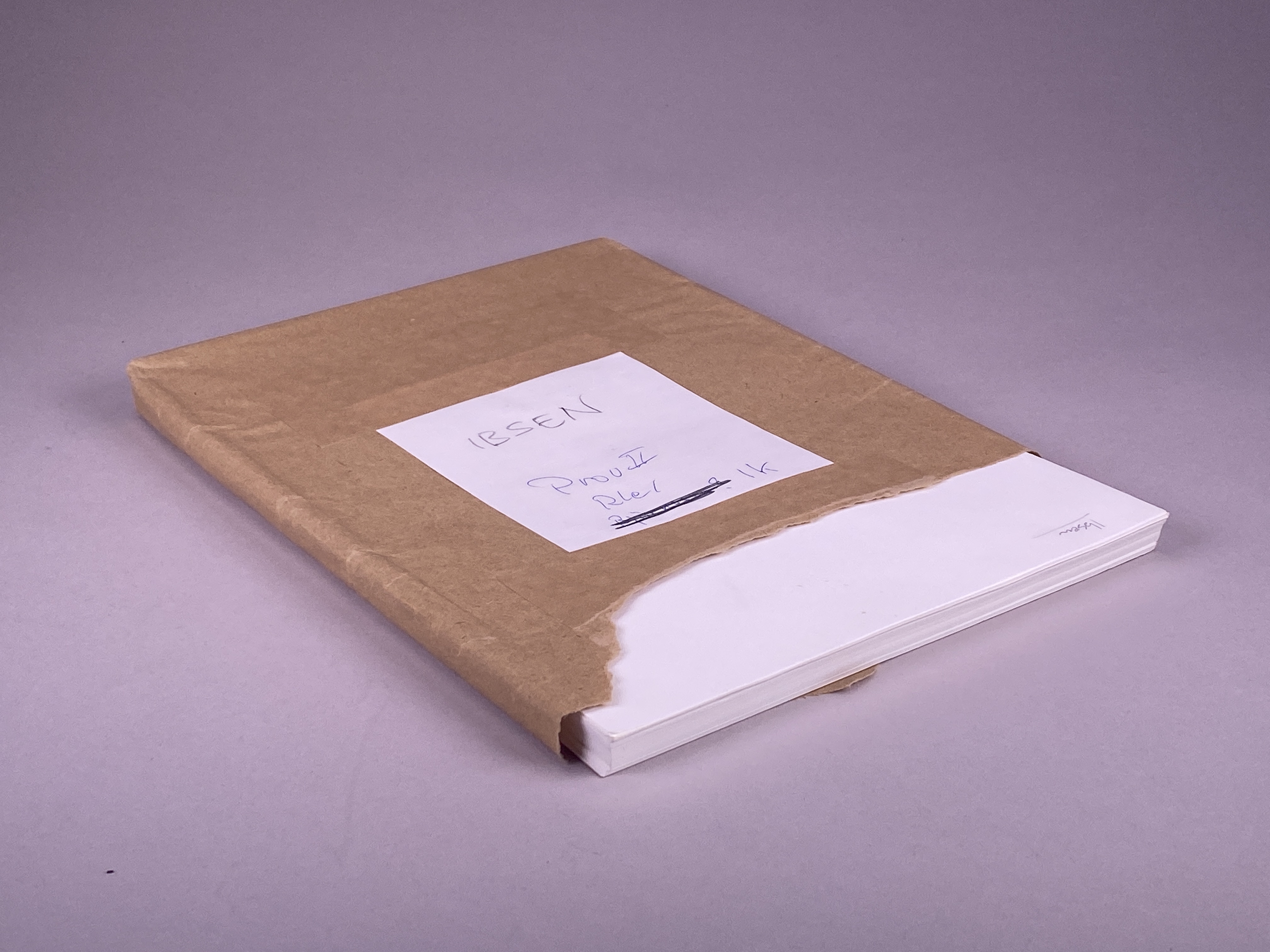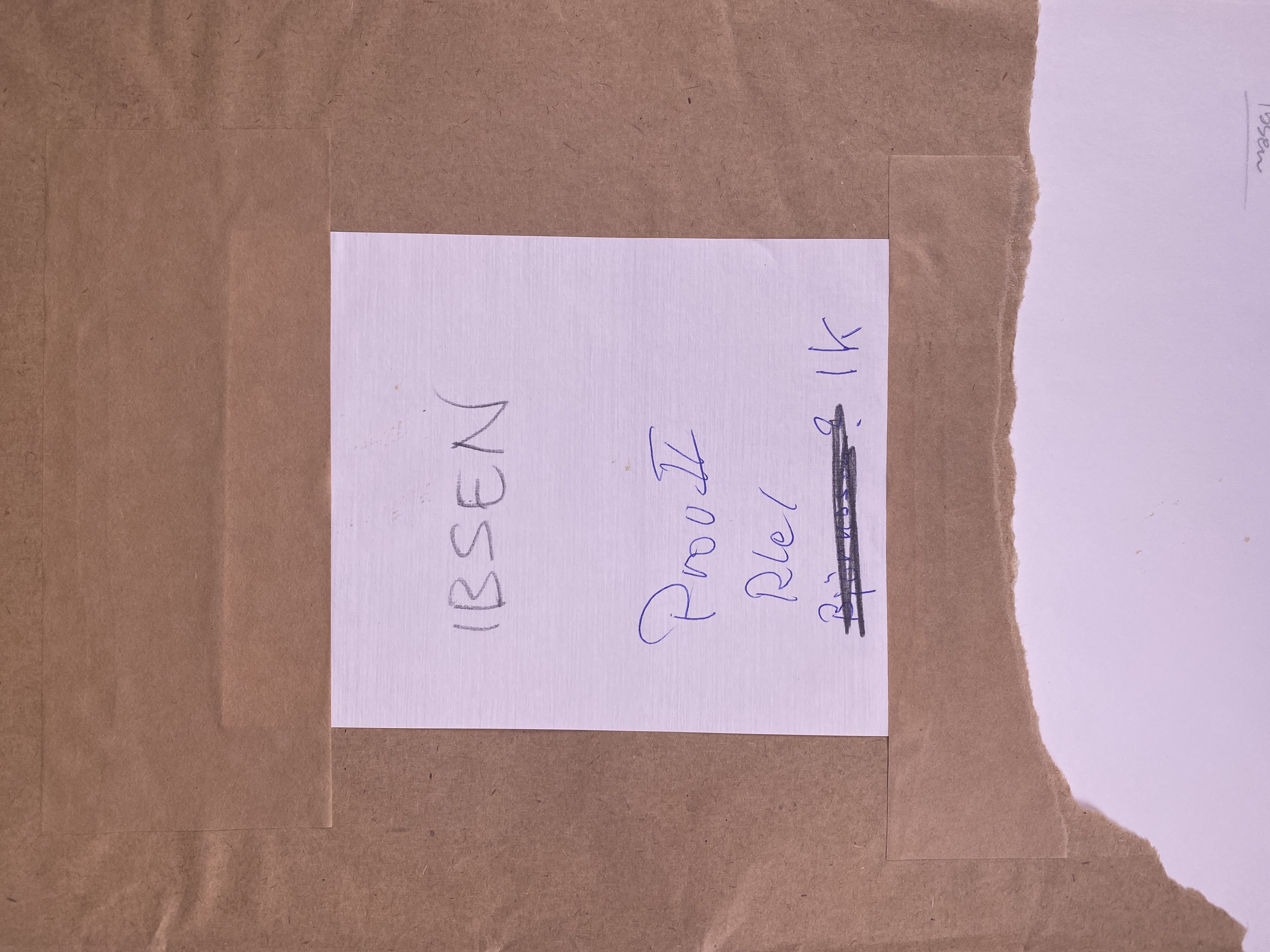 Paket av brun papp innehållandes ett flertal pappersark tillverkade på Tumba bruk. Vita pappersark med vattenmärke föreställande Henrik Ibsen (1828-1906) innanför en ram av stygn, samt bokstäverna "IK". Omslaget med vit etikett märkt: "IBSEN U Prov II Rle I IK".