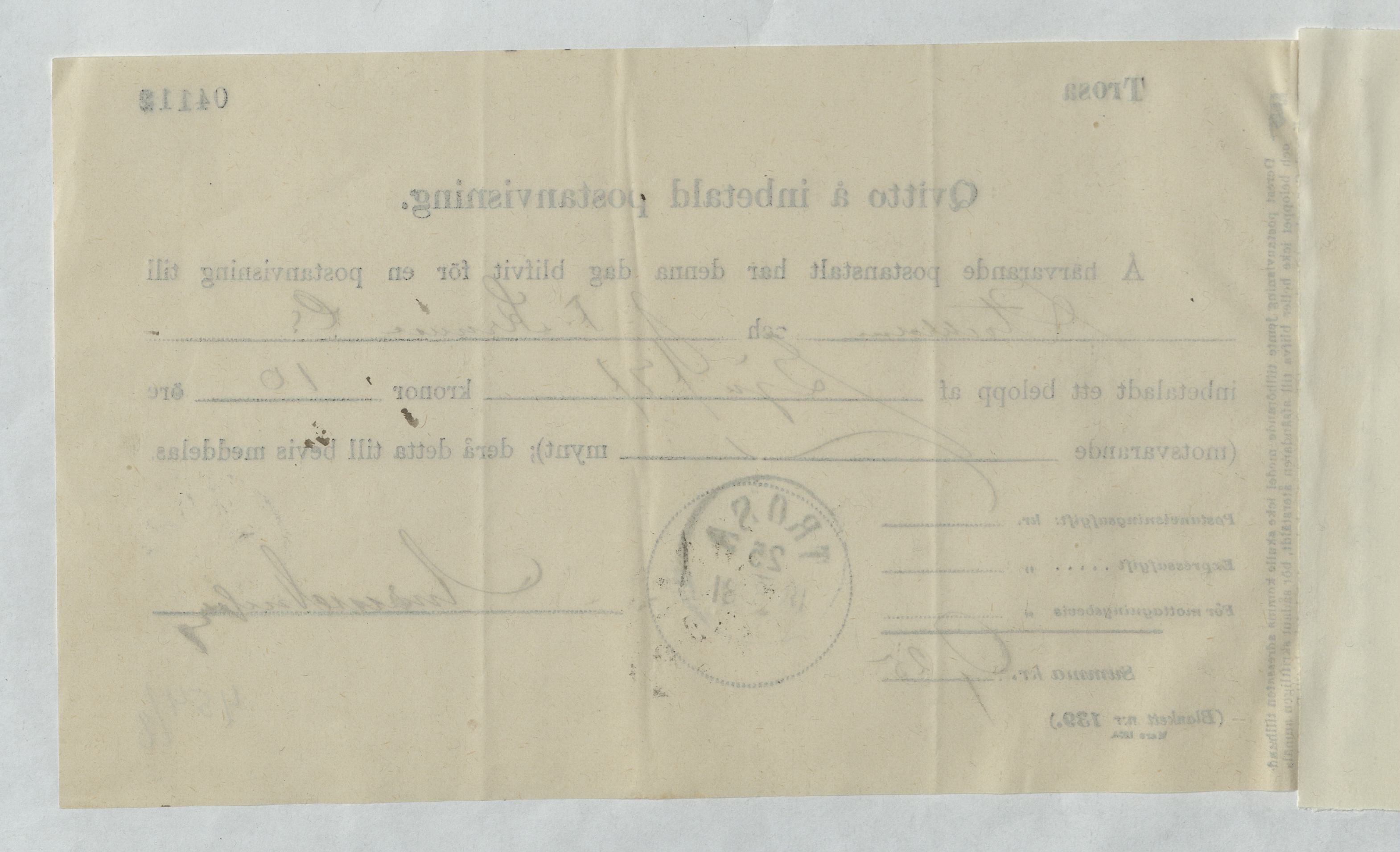 Kvitto för inbetald postanvisning gällande J. F. Kruuse & Co