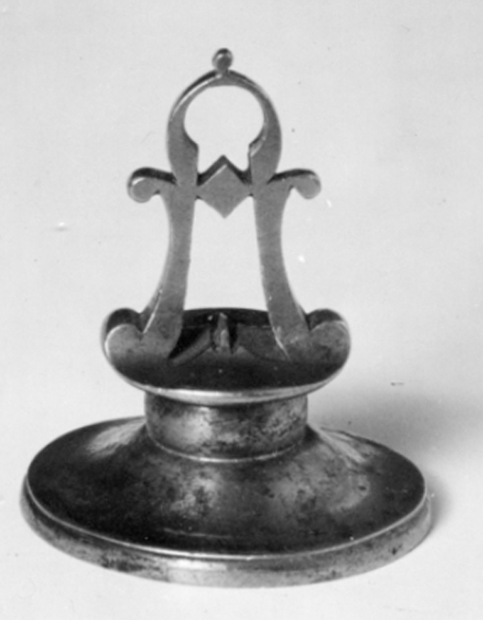 Helt av stål, oval platta, däri graverat vapen, skrafferade färgangivelser. Kartusch krönt med kunglig krona, därpå oval sköld, kvadrerad medelst ett utböjt kors, tre kronor och folkungalejonet, hjärtsköld Holstein-Gottorp. Runt skölden på kartuschen Nordstjärneordens kedja med tecken. Sköldhållare två krönta, tillbakaseende lejon, postament i form av mur, över muren hänger Svärds- och Serafimerordens kedjor med tecken. Spegelvänt valspråk ovanför kronan: "FIDE AVITA". Plattans rand svagt rundad, ovansidan svagt konisk, lyrformigt, genombrutet handtag med rund skiva nertill, d: ca 20 mm, upptill oval ring.