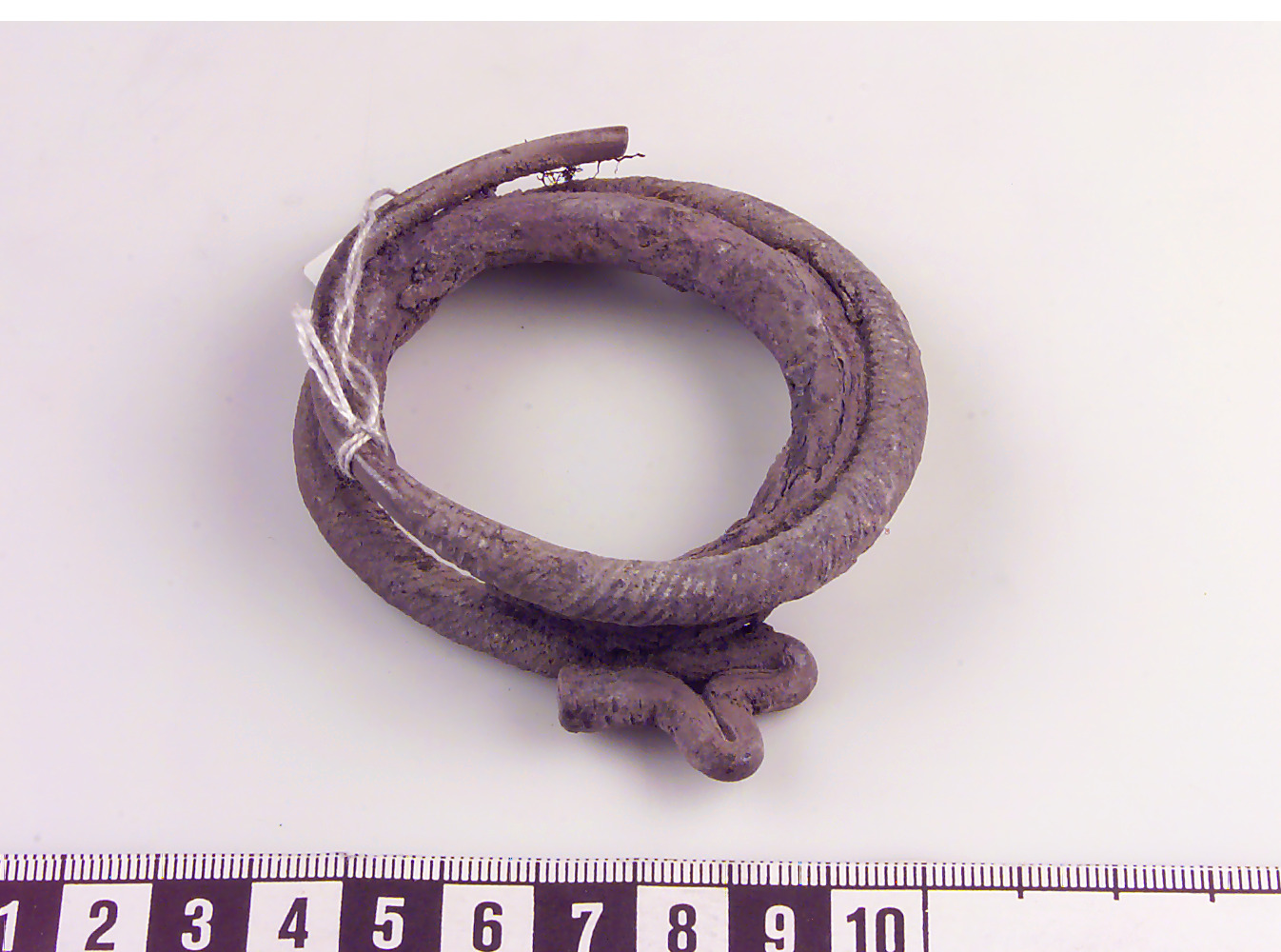 Del av permisk halsring spirallagd i ett och ett halvt varv. Ena änden avbruten, den andra tilbakaböjd i Y-form. Spiralräfflad ten som övergår i slät ten. I ringen sitter en armbygel av mångkantig ten med avsmalnande ändar. Kraftigt korroderad.