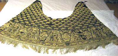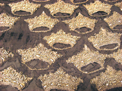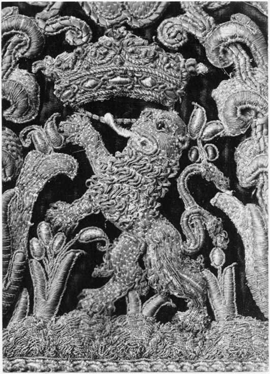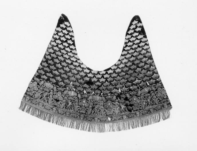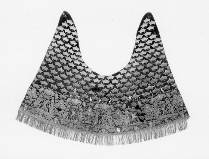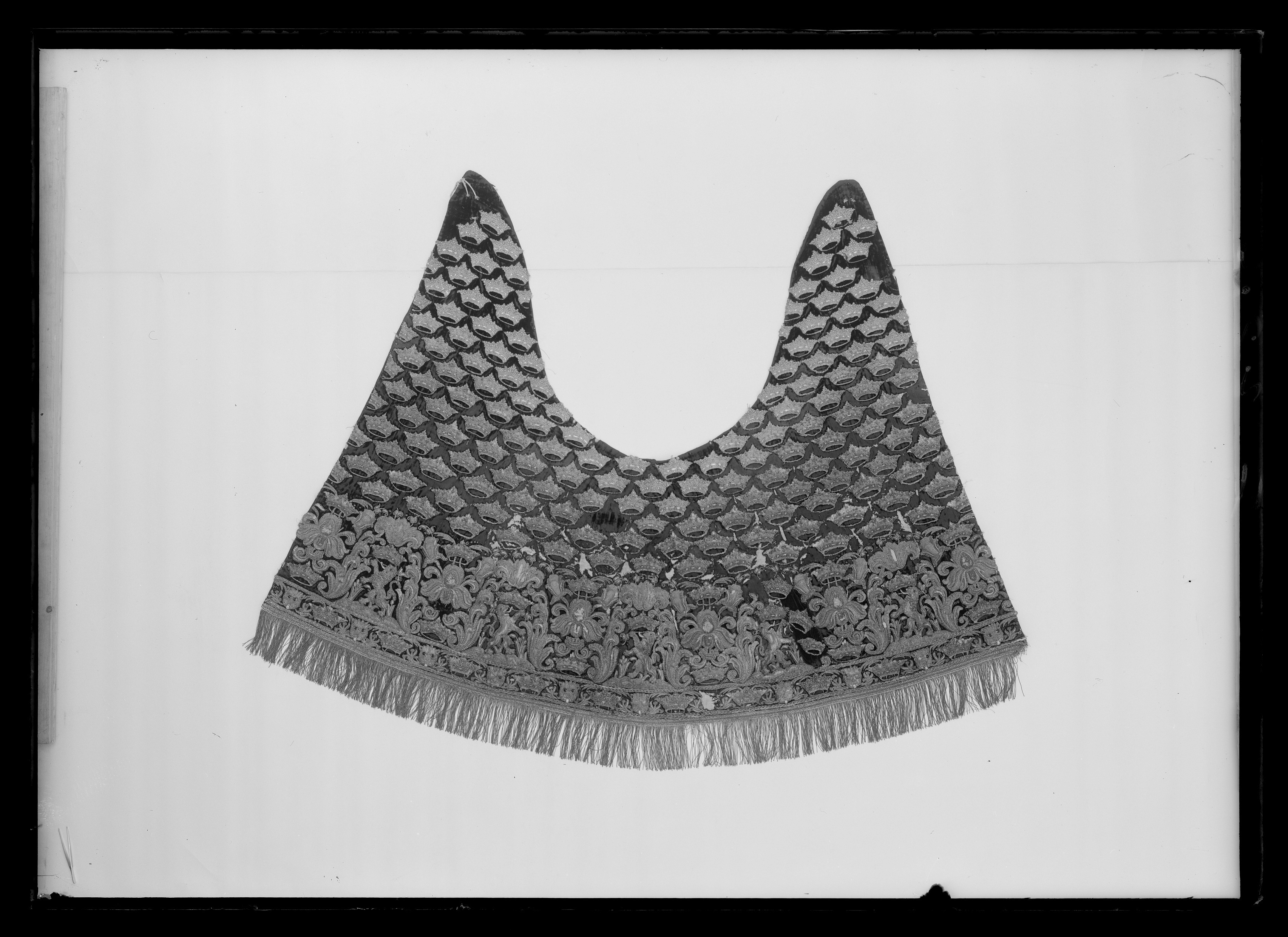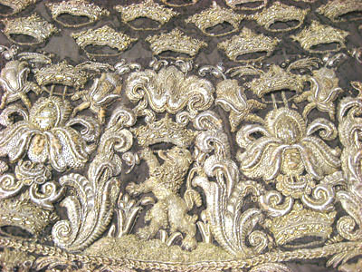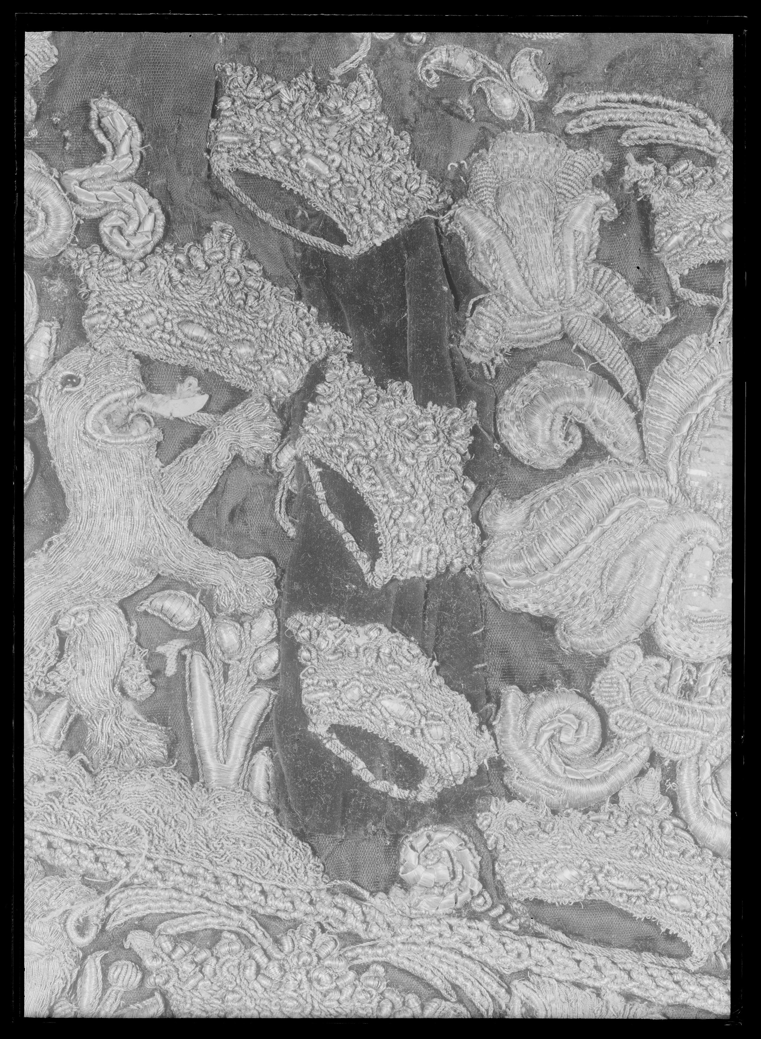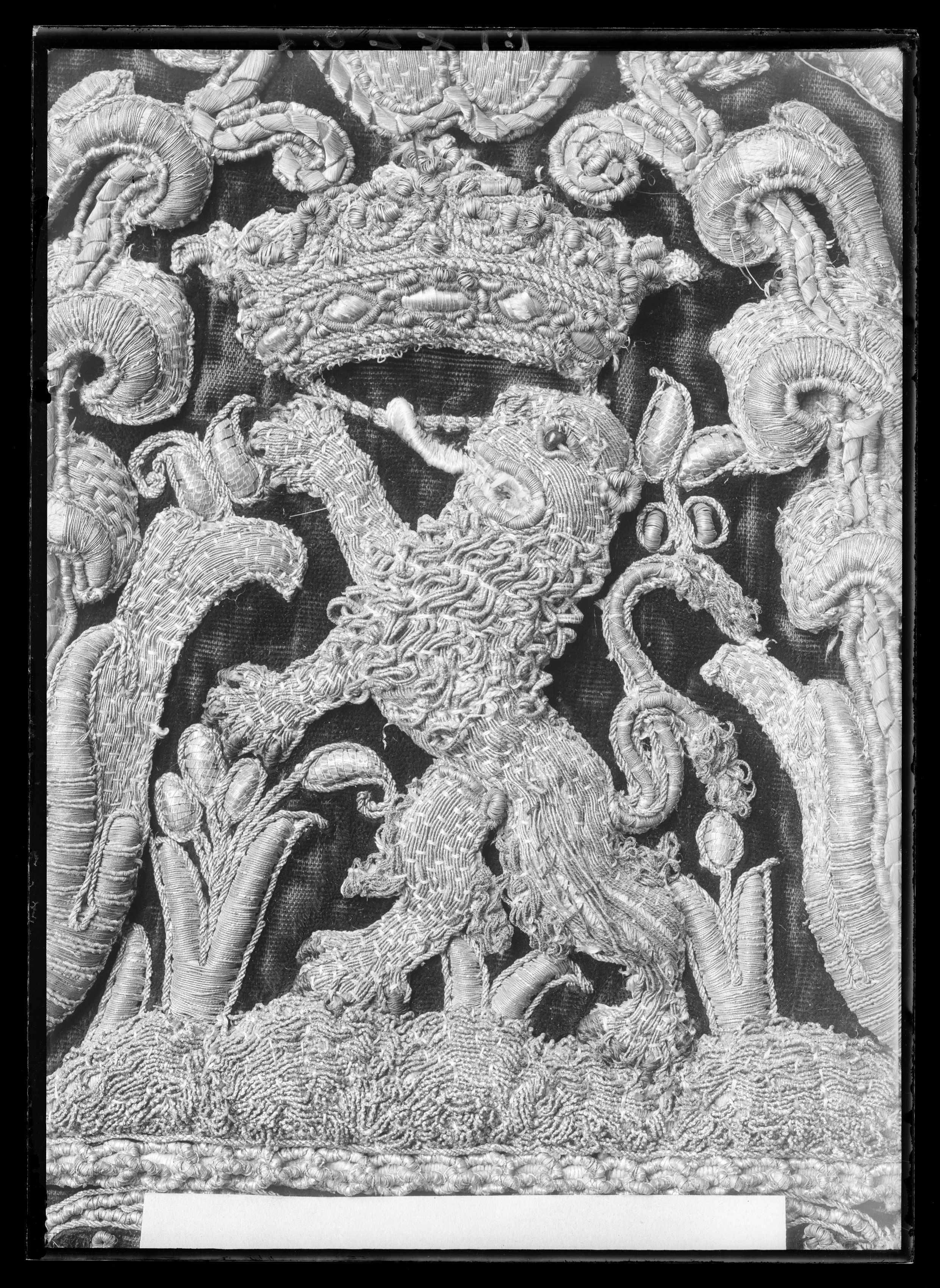 Bogstycket är till formen svagt rundat, sytt av två stycken. Två utskjutande stycken upptill för att ligga runt hästens manke. Bottentyg av svart silkessammet, täckt med broderier av guldtråd och guldlan och med detaljer av silkestråd samt kantiljer. Samtliga broderier är utförda i hög relief med hjälp av silkeskärna. Broderierna är indelade i tre fält där det dominerande fältet utgörs av guldkronor uppställda i rader. Nedanför kronorna följer ett brett fält med ett broderi med ett vegetativt uppåtsträvande mönster med slingrande blad, voluter och rosor. I den nedre kanten av broderiet står sex uppresta, dubbelsvansade lejon med utsträckta tungor av röd silkestråd. Lejonen är broderade av guldtråd med detaljer av silkestråd samt med rundslipade ögon liknande pärlor, troligen av stenkol. Det nedersta fältet utgörs av ett broderi av nio lejonhuvuden mellan vilka har broderats kronor och bladknippen som växer ut vid sidan av lejonens gap. Det nedersta fältet kantas upptill och nedtill av ett band av guldtråd i ett flätat kedjemönster. Bogstycket avslutas nedtill av en guldfrans, l. 95 mm, av tvinnad guldtråd och med ett vävt band, b. 15 mm, av guldtråd med invävda guldlan. På undersidan fodrat med naturfärgad, grov linnelärft kantat av ett vävt silkesband av röd och gul silkestråd.