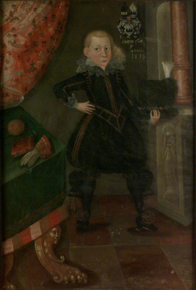 Helfigur, fas, långt hår, guldstickad svart dräkt, spetskrage och manschetter, knäbyxor, stora knärosetter, skor med skorosor, höger hand i midjan, i vänster hand svart hatt med juvelprydd kedja runt kullen, svart fjäder och vit kvast. Står i ickeperspektiviskt rum, t.h. röd kolonn på sockel, t.v. bord med skulpterade förgyllda ben, täckt av grön duk med röd, guld och vit frans, på duken ligger apelsin, bok och handskar. Rött draperi med blommor. Upptill Wrangelvapen samt text: "J M W ETATIS SUAR 5 ANNO 1619". Klistrad direkt på prydnadsramen, som är svartmålad med gulddekor. Ramlistens bredd 50 mm.