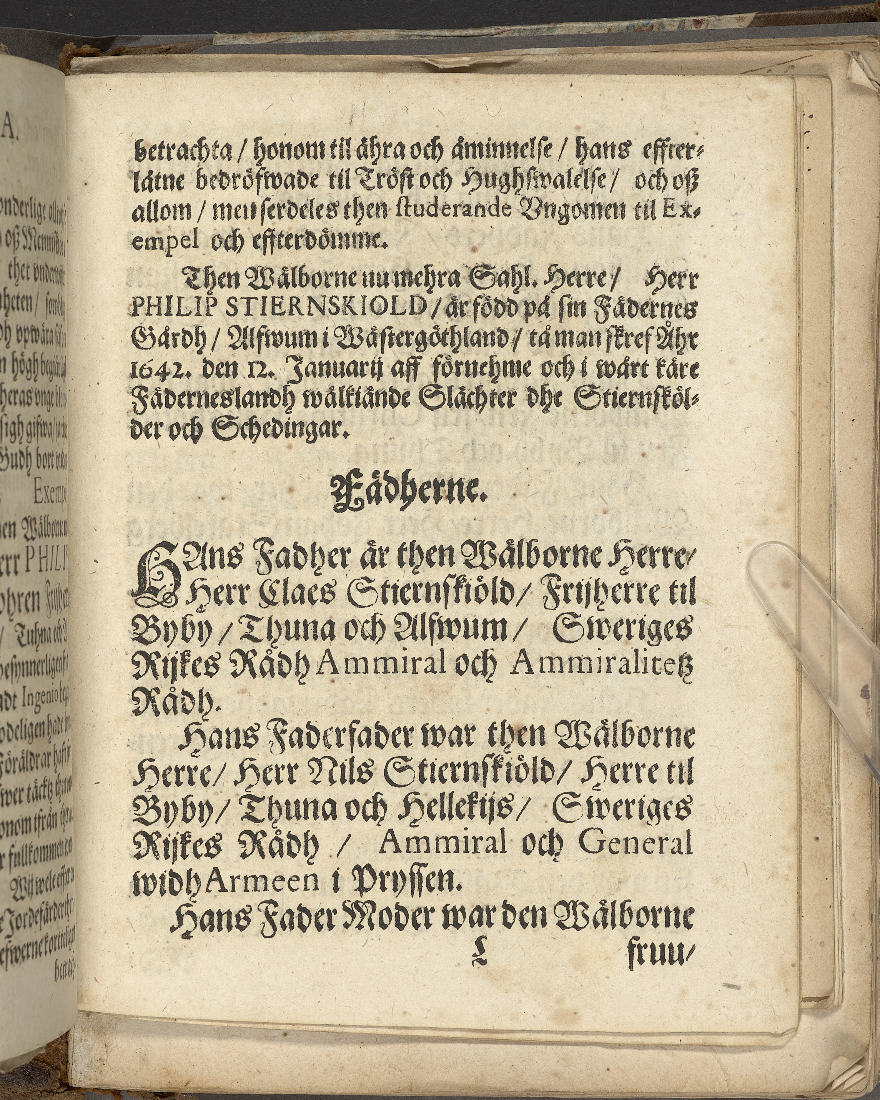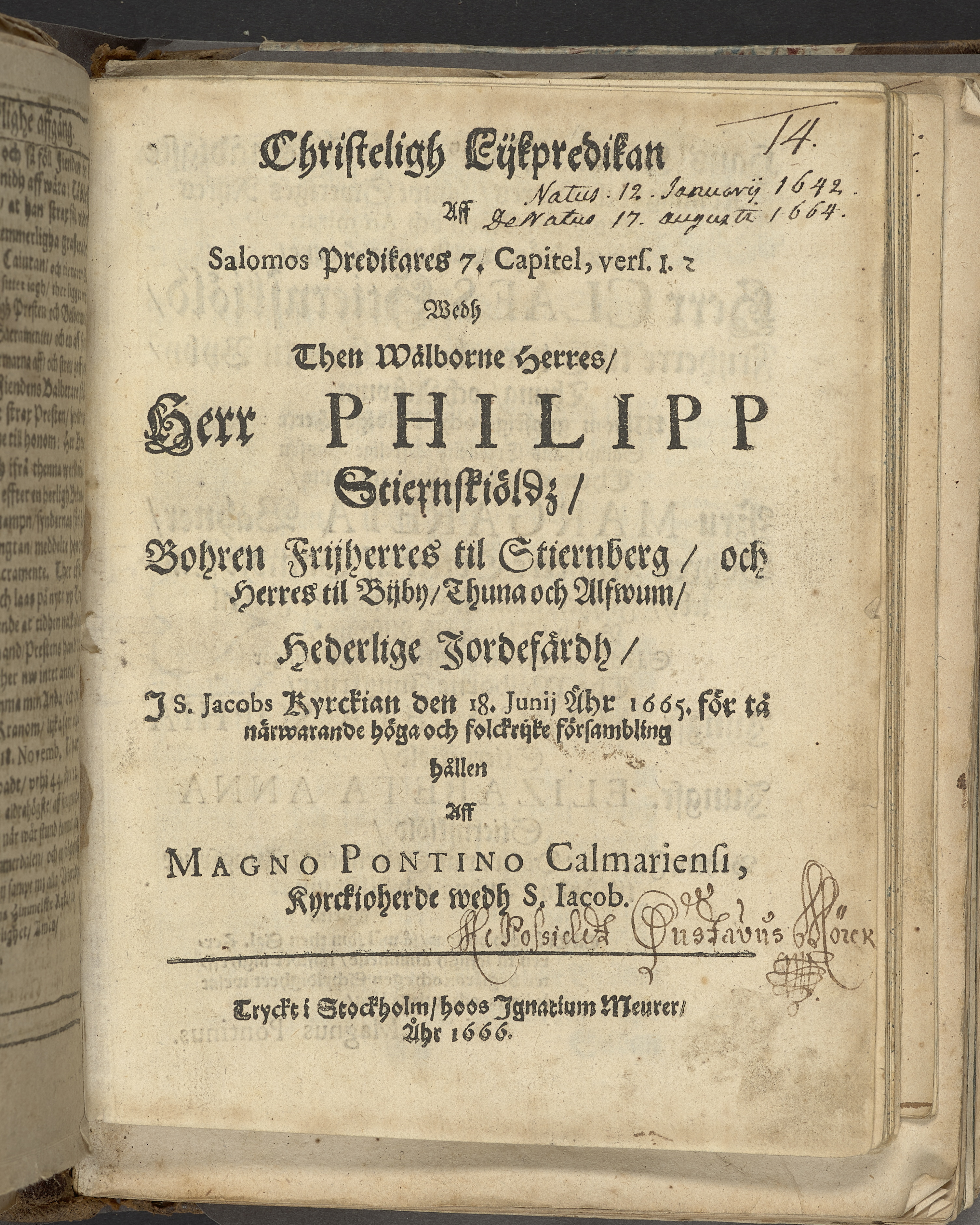 Christeligh lijkpredikan... wedh... Herr Philipp Stiernskiöldz, bohren frijherres til Stiernberg... hederlige jordefärdh, i S. Jacobs kyrckian den 18. junij åhr 1665... hållen aff Magno Pontino Calmariensi... Tryckt i Stockholm, hoos Ignatium Meurer, åhr 1666.