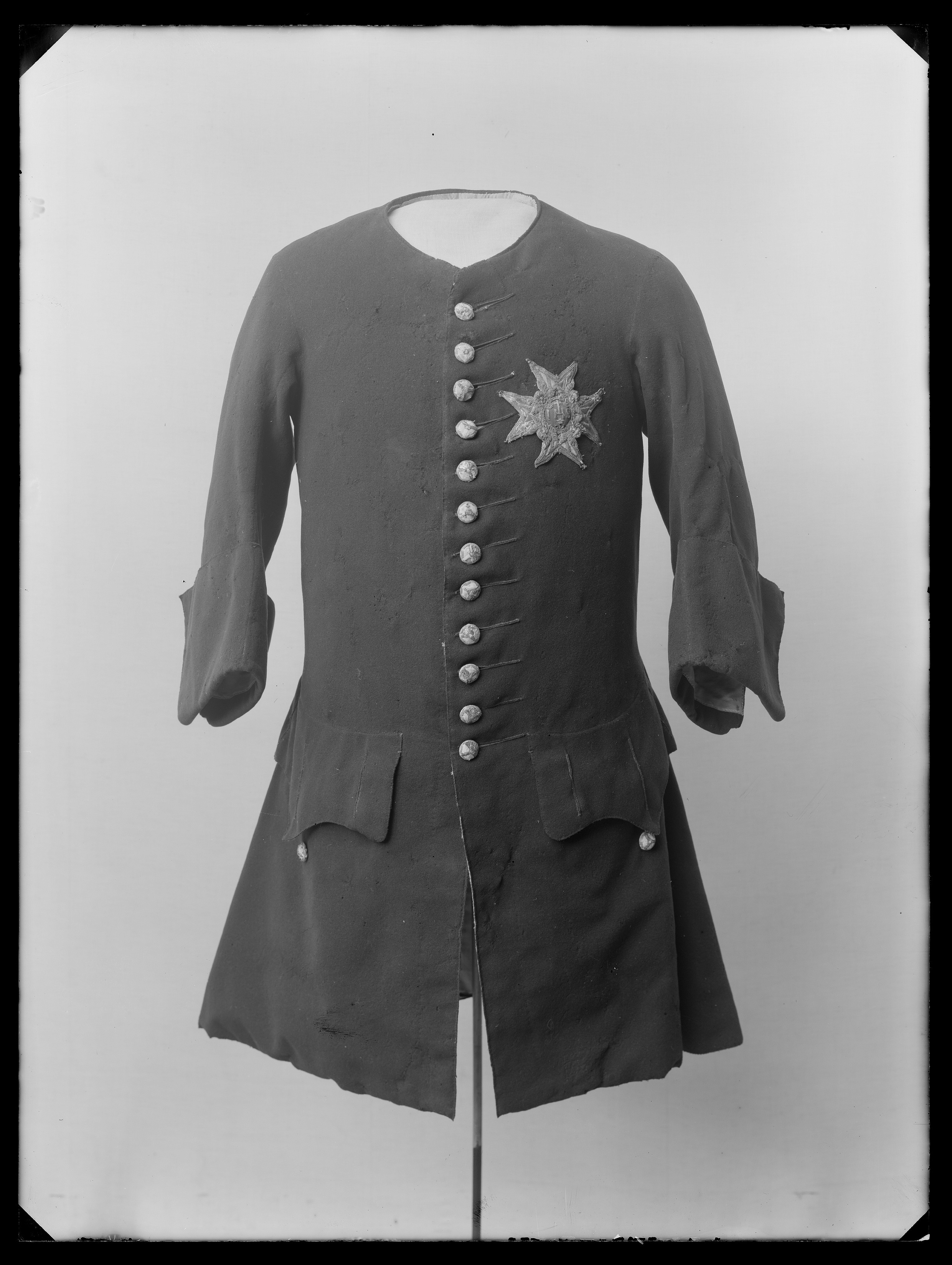 Halvlång, långärmad rock av blått kläde, bleu royale, fodrad med rött siden, gros de tours. Rundad halsringning med en 5 mm bred linning. Sydd med två mot varandra rundade framstycken och två bakstycken. Knäppning mitt fram bestående av 12 stora runda träknappar överklädda med vit silkestråd och med silvertråd och silverlan samt kantilj av silvertråd samt 70 mm breda knapphål. Mitt fram på vardera framstycke sitter en 280 mm lång, horisontellt iskuren ficka med ett 150 mm brett spetsflikigt ficklock som knäpps med tre knappar. Ärmarna är 605 mm långa och sydda med inner- och yttersöm med ett 160 mm högt sprund i yttersömmen vid ärmslutet och med 170 mm breda, uppvikta slag. Sprundet knäpps med tre små knappar. Rocken är sydd med två bakstycken med en mittsöm mitt bak på ryggen och med en 515 mm hög slits nedtill. Ovanför sprundet är 80 mm breda, horisontella slitsar skurna, tre på vardera sida. På vardera sida om slitsen bildas höga, djupa veck. Två av vecken, dvs ett veck på vardera stycke, knäpps med två knappar, en knapp nedtill och en knapp upptill. På vänster bröst är påsytt serafimerordens broderade kraschan nnr 18958.
