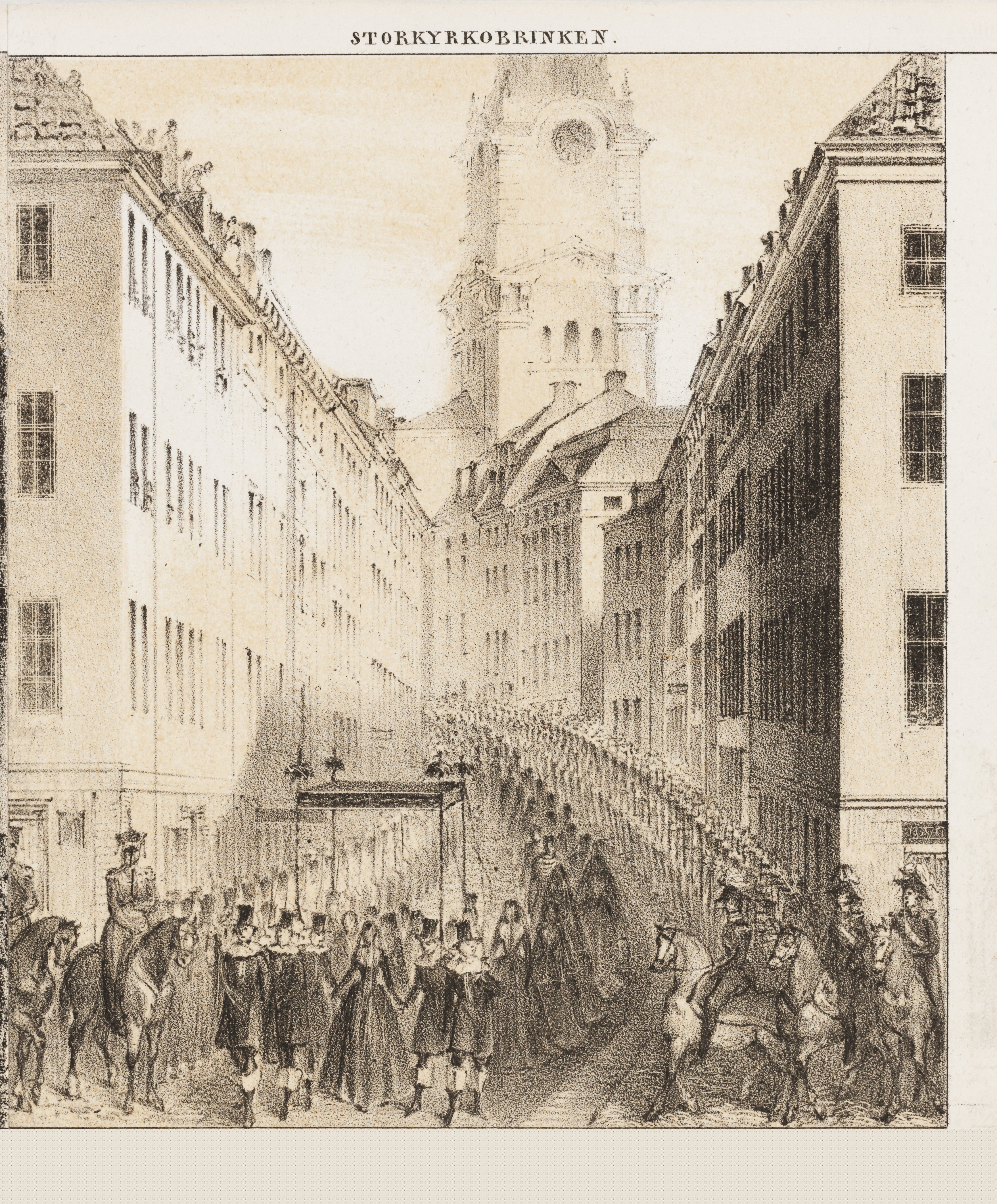 Skrift med plansch utförd i litografiskt tryck i svart med brungula schatteringar. Interiören av Riddarholmskyrkan, Karl XIV Johans likprocession från Storkyrkobrinken till Riddarholmskyrkan via Rådhuset, Riddarhuset, Riddarholmsbron och Riddarholmen. Ytterligare bilder visar Karl XIV Johans dödsbädd och likrummet. Tillhörande text med titeln Från dödsbädden till grafchoret. Fullständig historik öfver högtidligheterna vid högstsalig H.M. Konung Carl XIV Johans likbegängelse i Riddarholmskyrkan den 26 april 1844. En erinring för dem, som bivistat desamma, och ett minne för efterlefvande. Med panorama öfver processionen vid den kungliga likbegängelsen, teckning af Riddarholmskyrkans inre, mm. Stockholm 1844, Albert Bonniers förlag. Inbundet häfte, tvär folio, 15 sidor, extra titelblad samt utvikningsbar plansch; hxb 140x1340 mm. Pappersband med pärmar i mörkblått och omslagstitel litograferad i guld: Carl XIV Johan likbegängelse den 26te april 1844