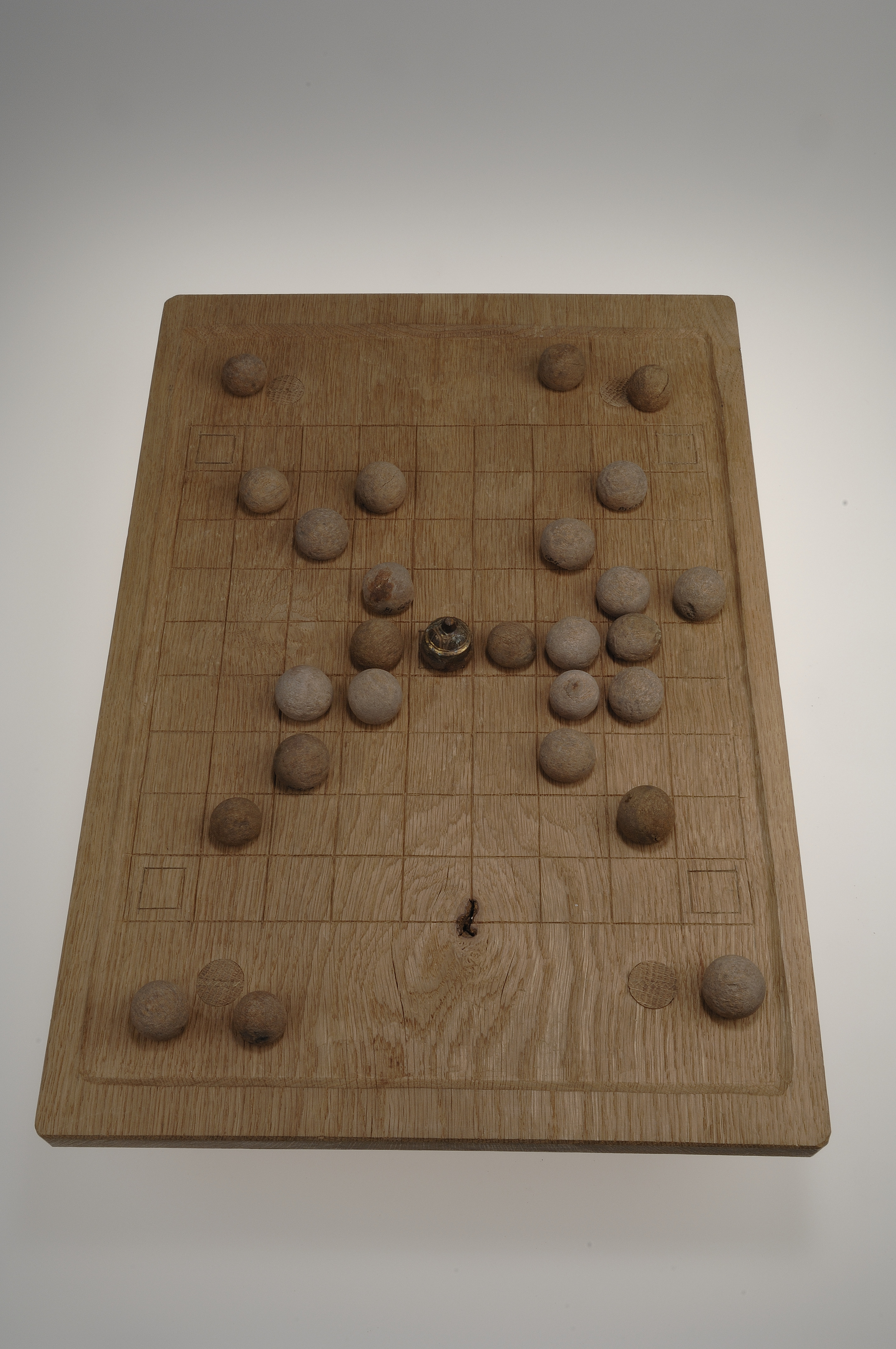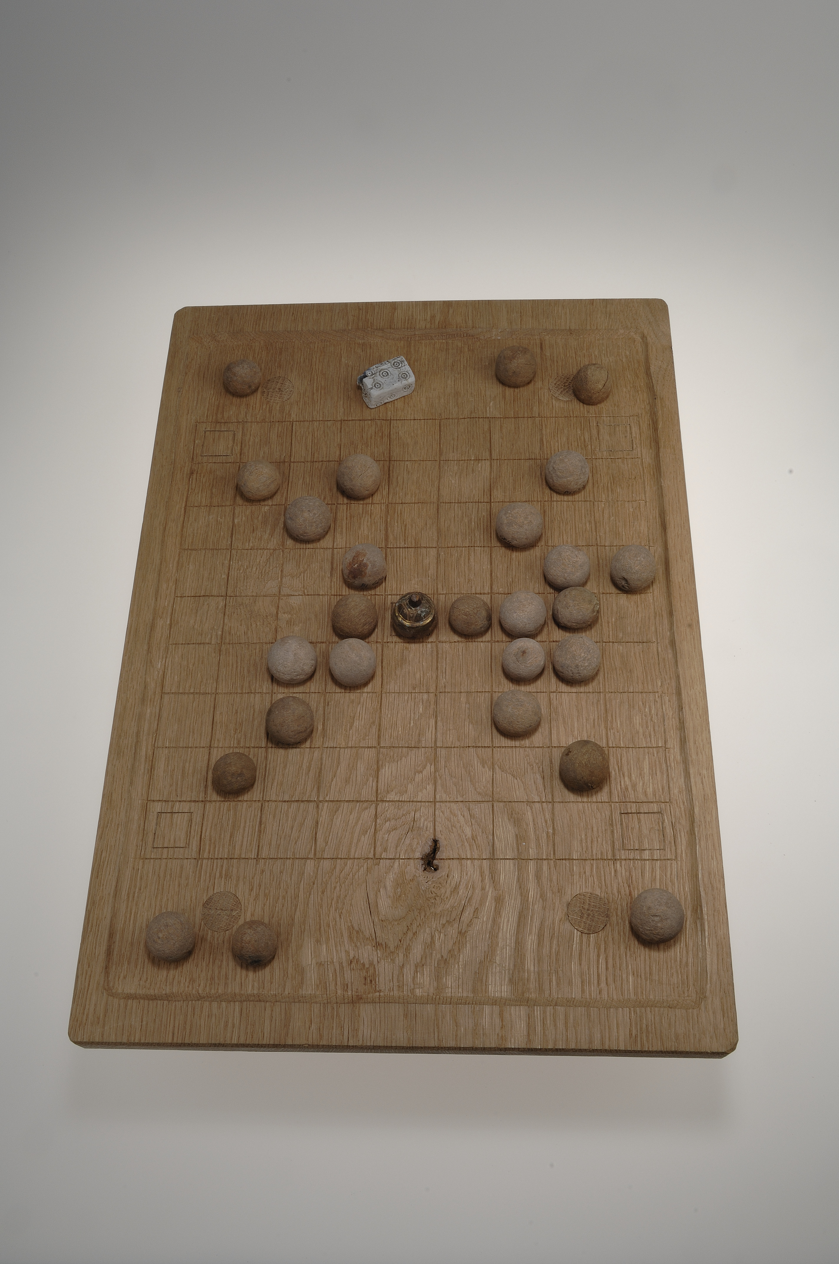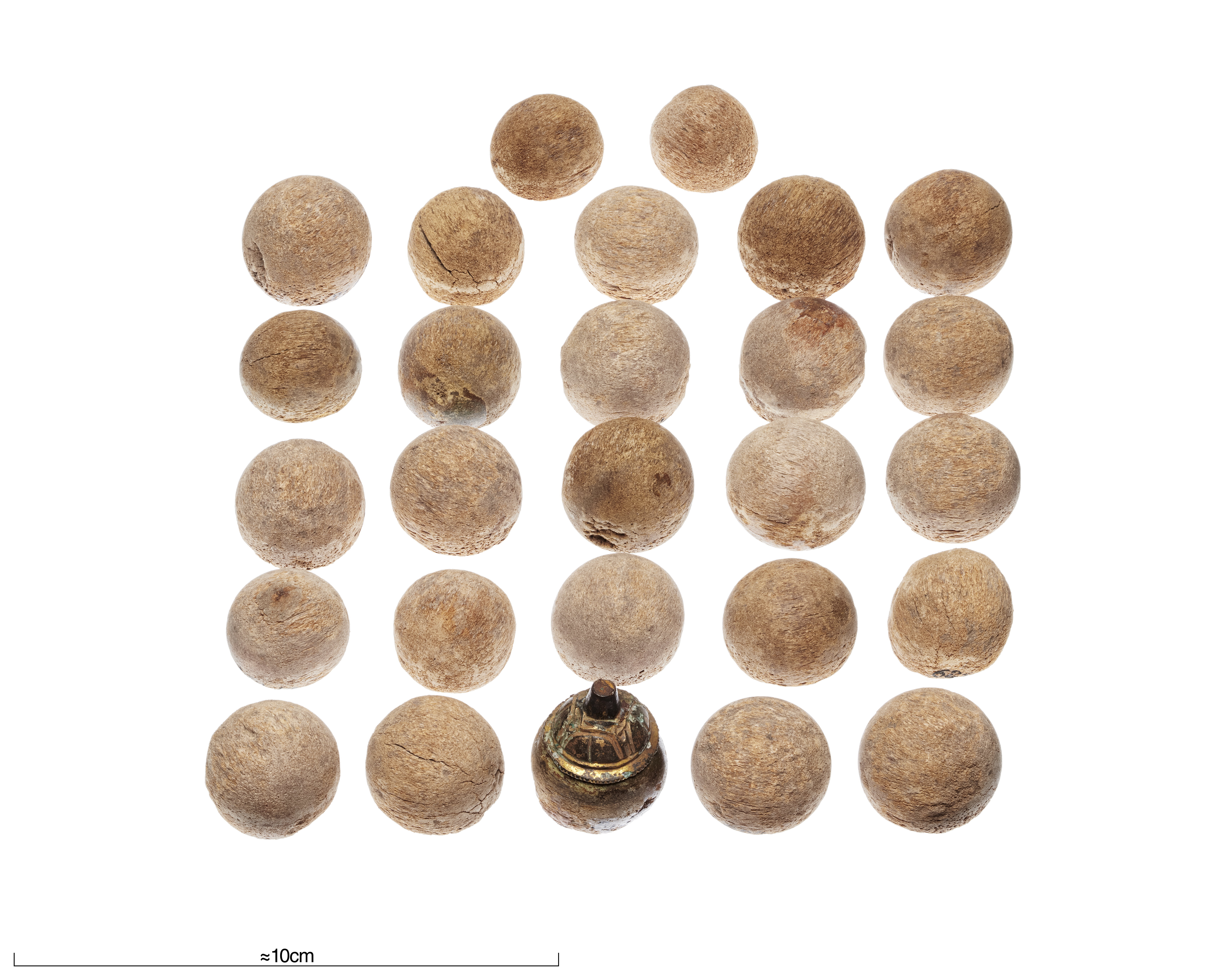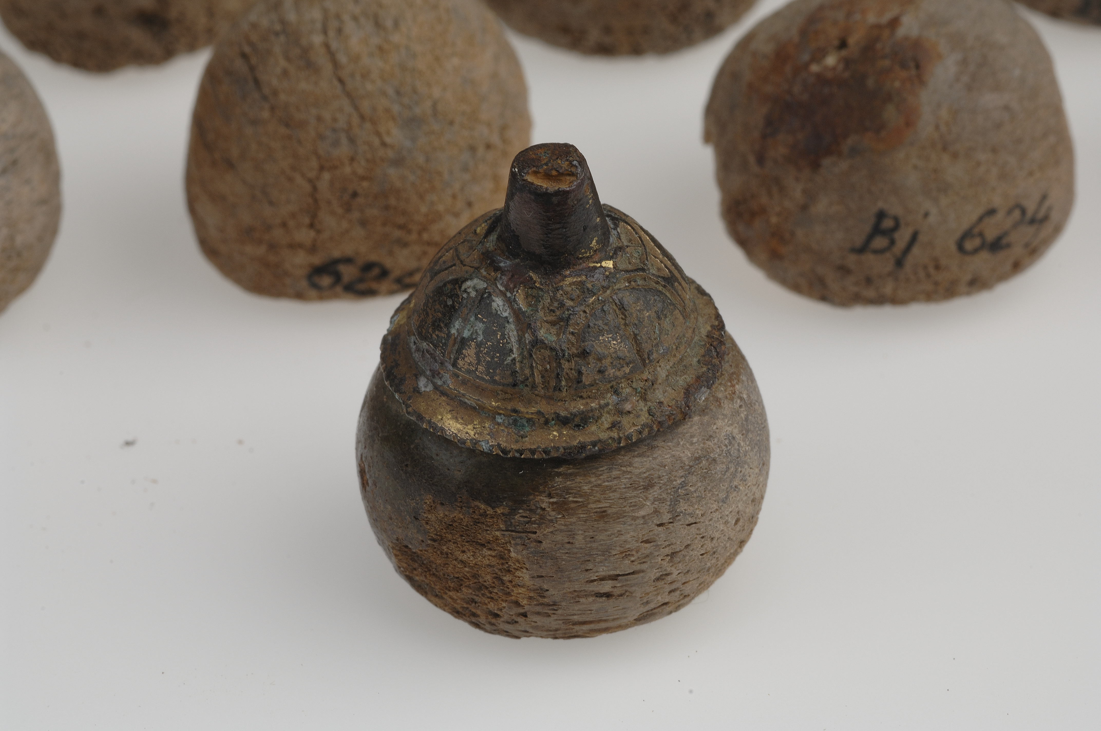 Spelbrickor av ben. 26 vanliga och en kung. Den senare klädd med förgylld brons.