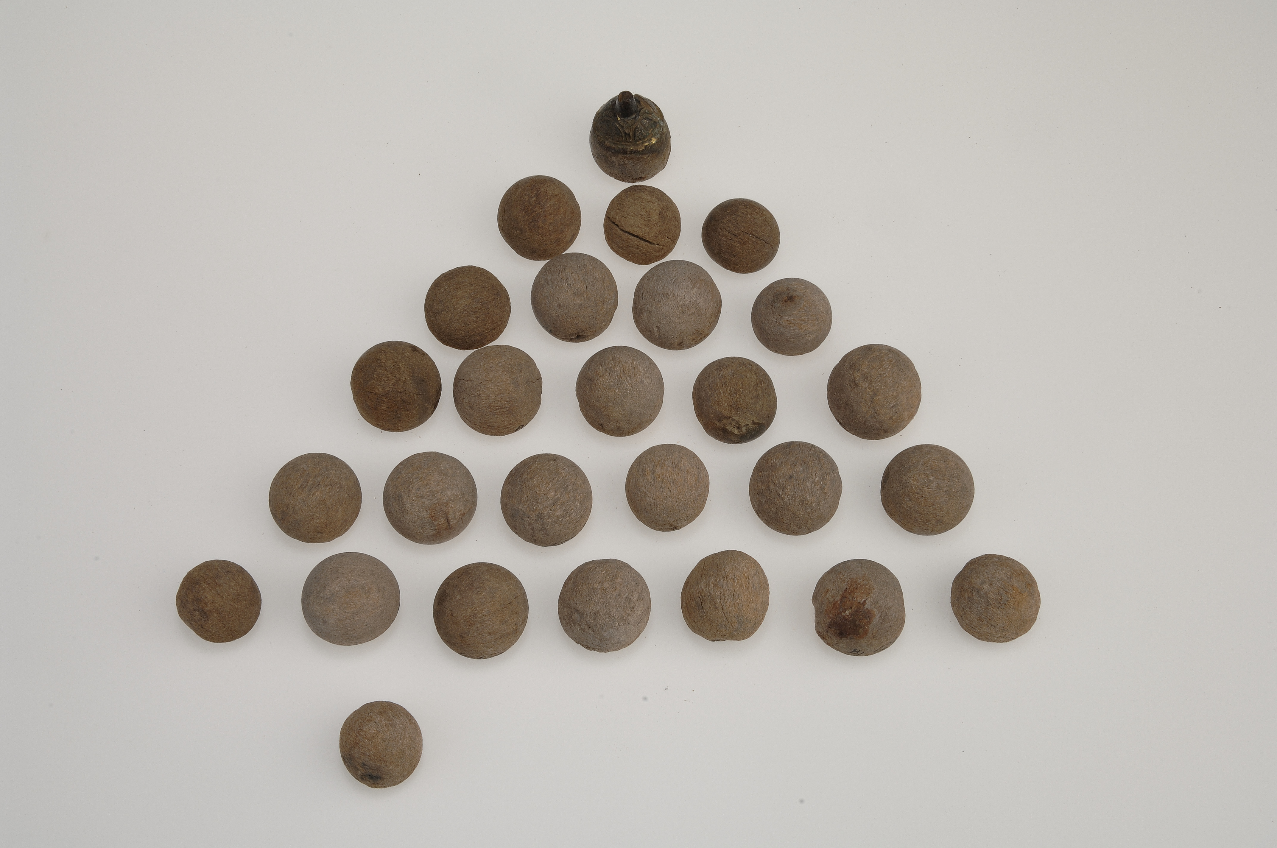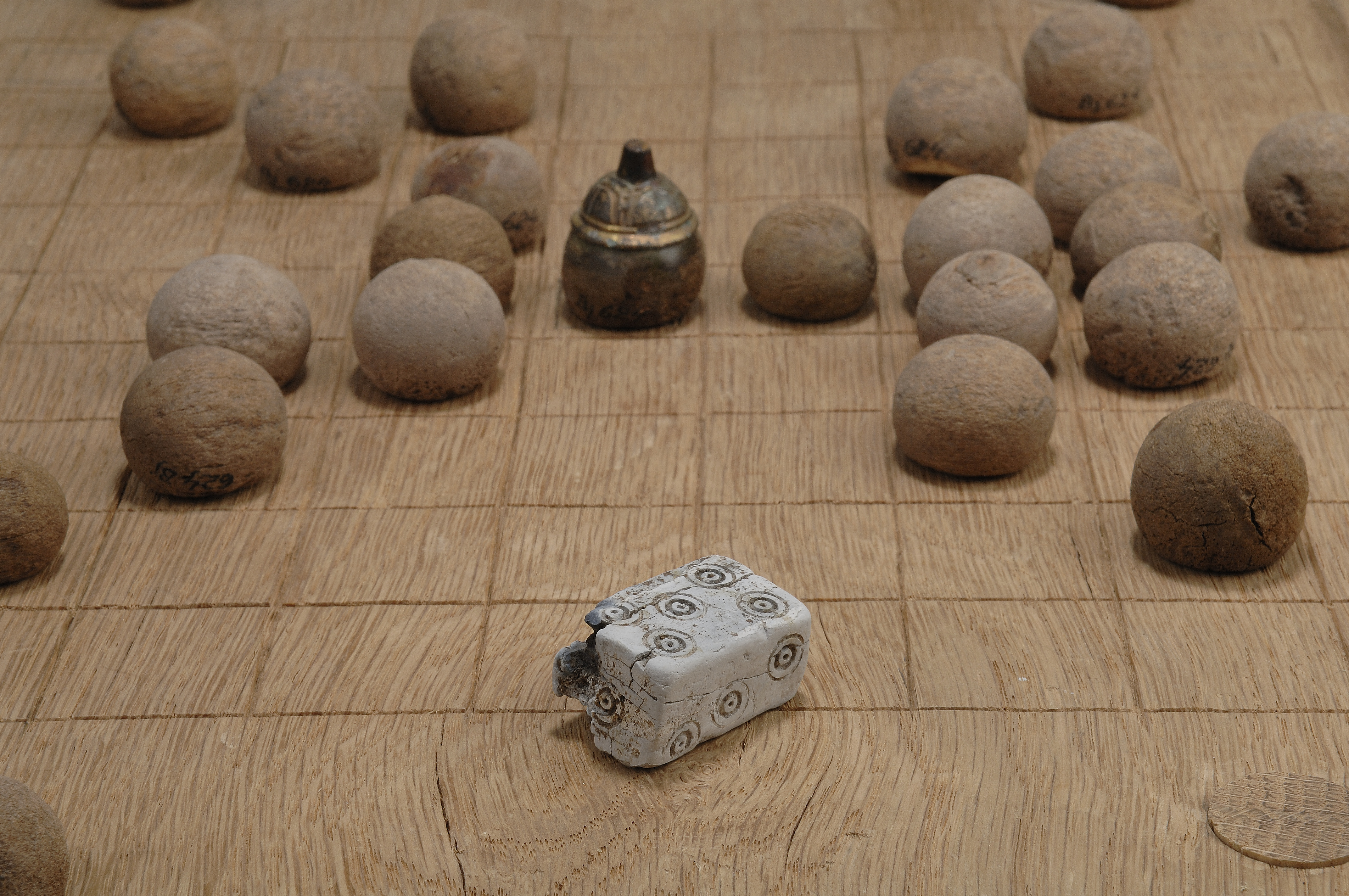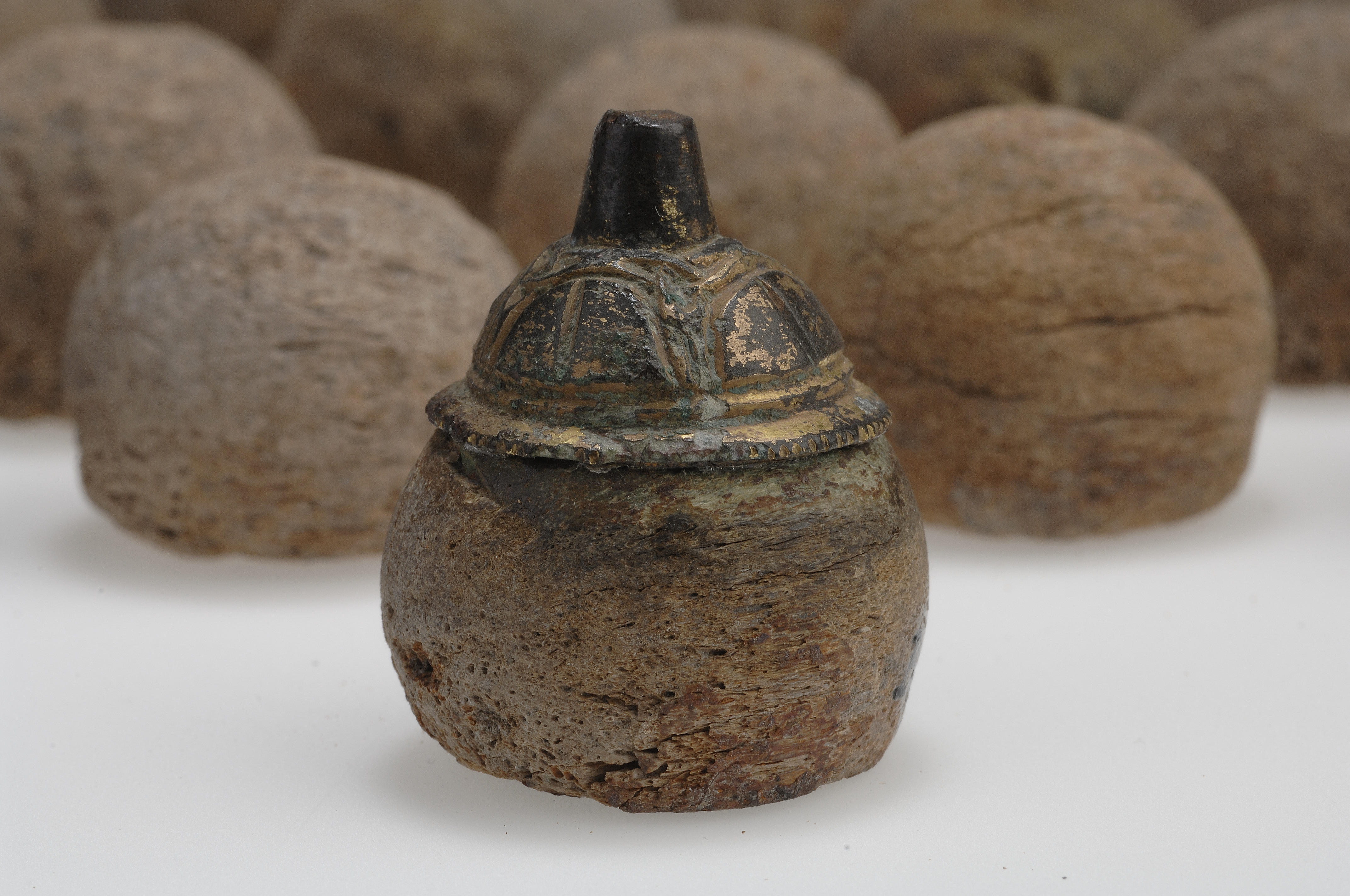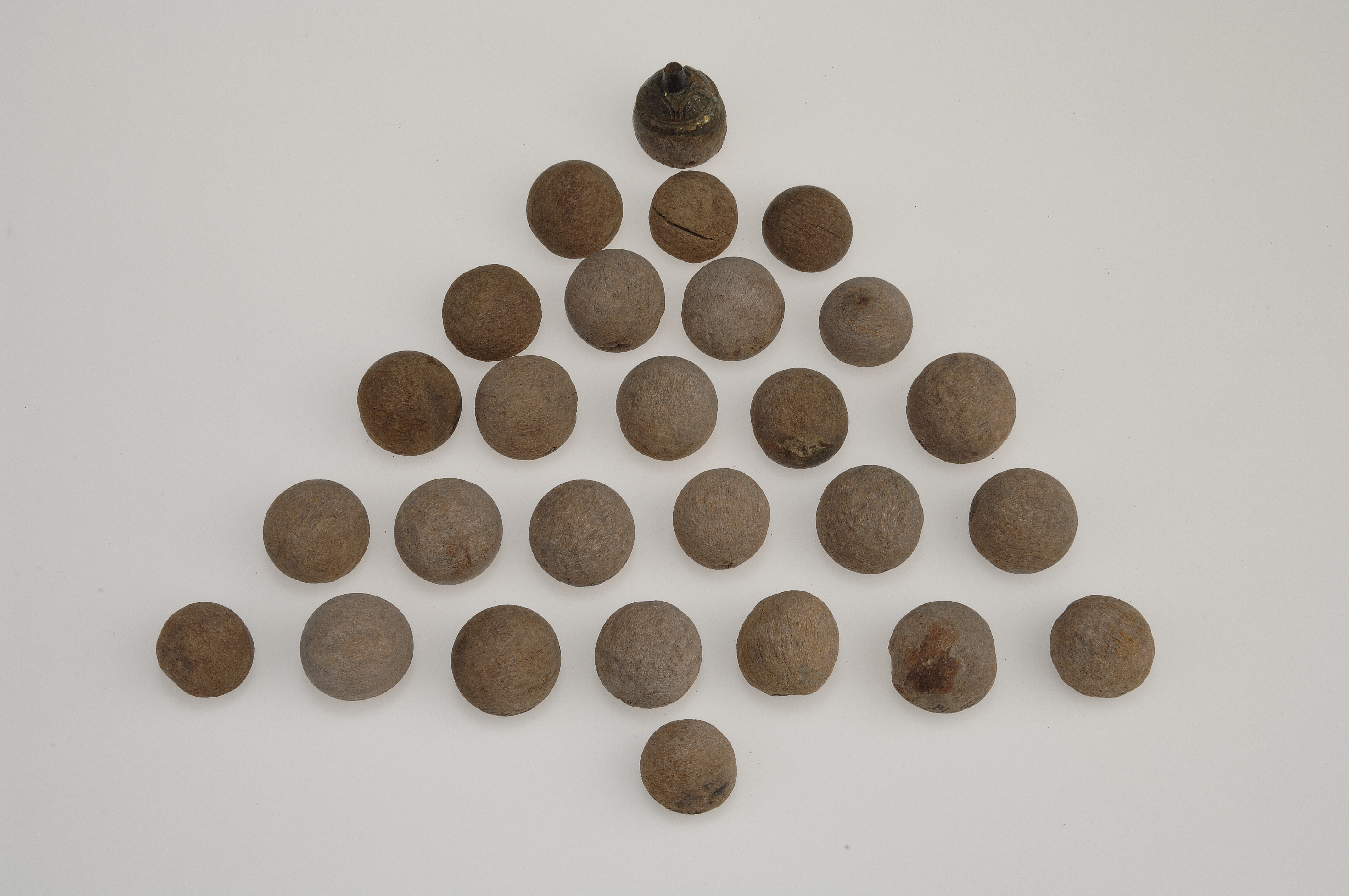 Spelbrickor av ben. 26 vanliga och en kung. Den senare klädd med förgylld brons.