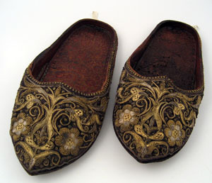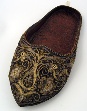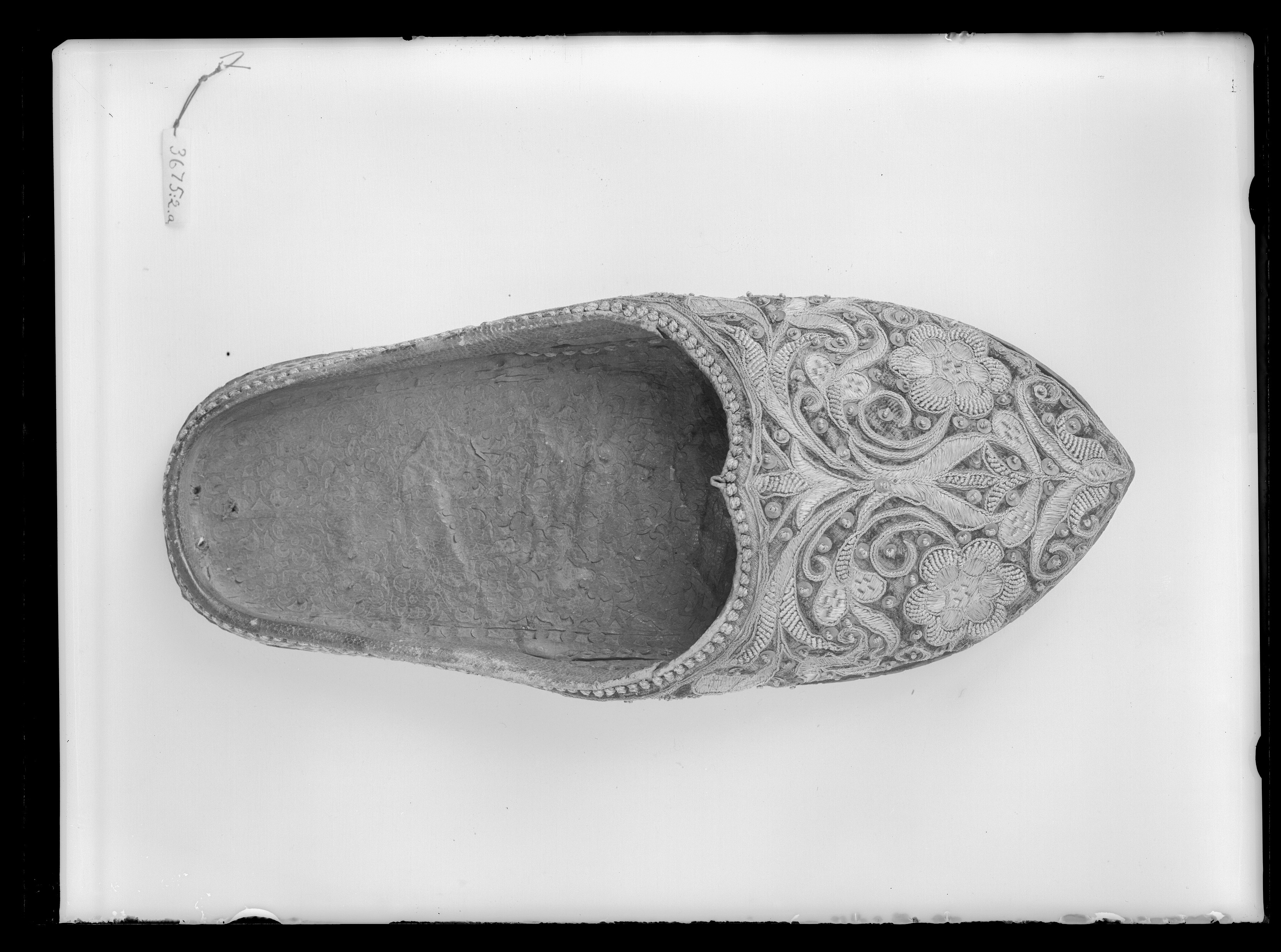 Liten toffla av spetsig modell med en rak läst och en ca 10mm hög bakkappa. Ovanlädret är klätt med violett sammet med ett täckande broderi, ett växtlighetsmotiv med stiliserade blommor, blad och voluter, huvudsakligen i guld men med inslag av silvertråd samt kantilj och små fastsydda paljetter i guld. Ringningen dekoreras med en broderad bård av punkter av guldtråd och gul silkestråd. Innanför denna en tvinnad silvertråd som löper runtom ringningen på ovanlädret. En rand av flätad gul och röd silkestråd löper runtom hälpartiet mellan sulan och toffeln. Sulans undersida av mörkt brunt nötläder. En lång ristning i mitten på undersidan av sulan samt en ristning som en s-kurva ovanpå denna. Ristning i kanterna samt som små punkter och på mitten tre punkter. På insidan klädd med ett ljust brunt läder, med ett fastsatt utskuret orientaliserande mönster av läder som täcker den bakre halvan av skon. På insidans kanter ett mörkare brunt läder. På insidan sydd med gula stygn som mörknat. En dekor av små svarta punkter på kanten av sulan.