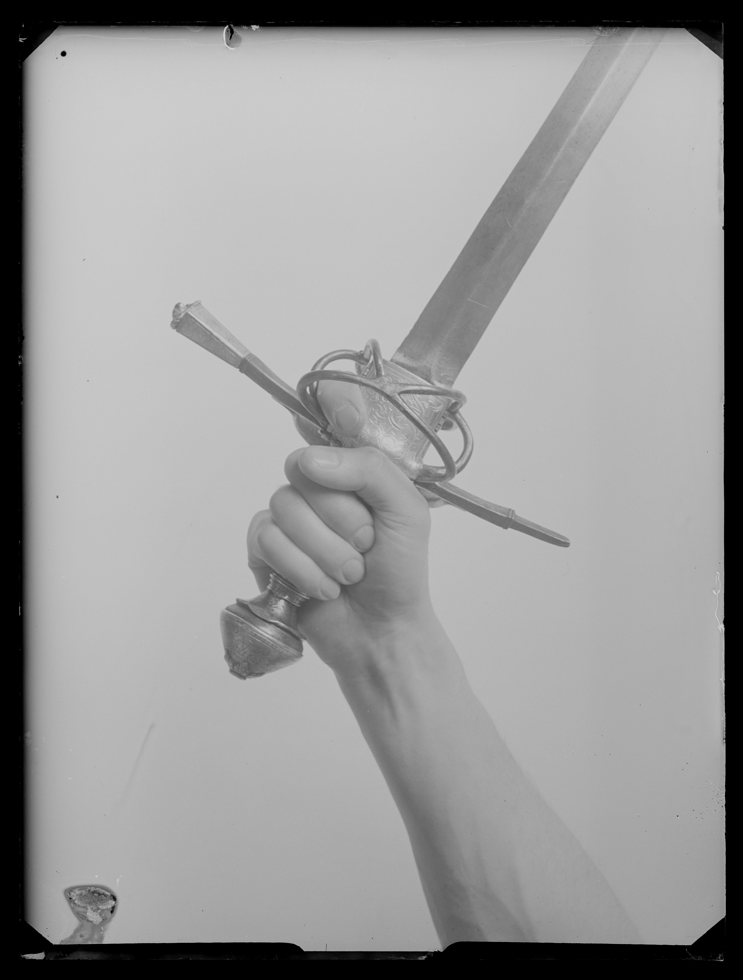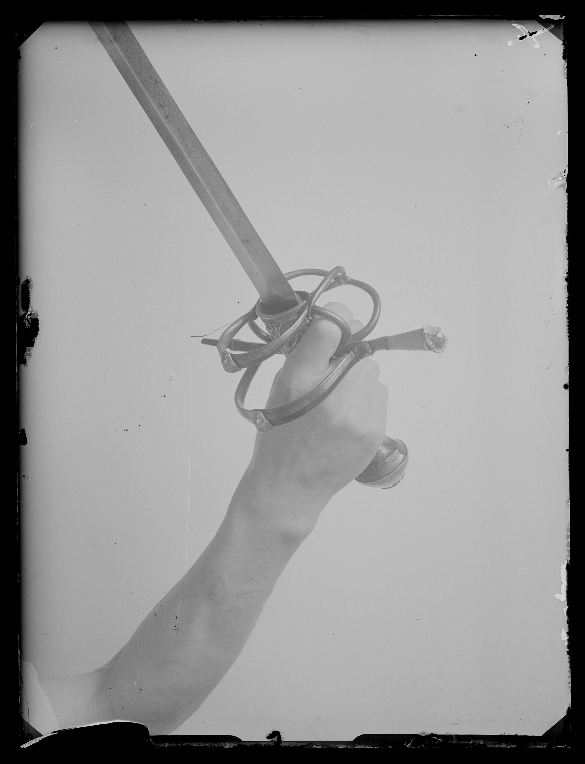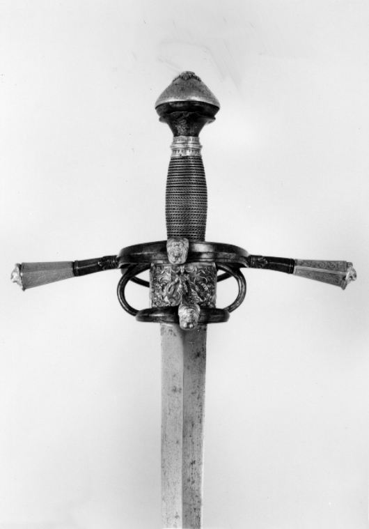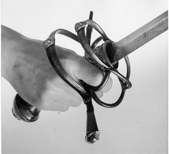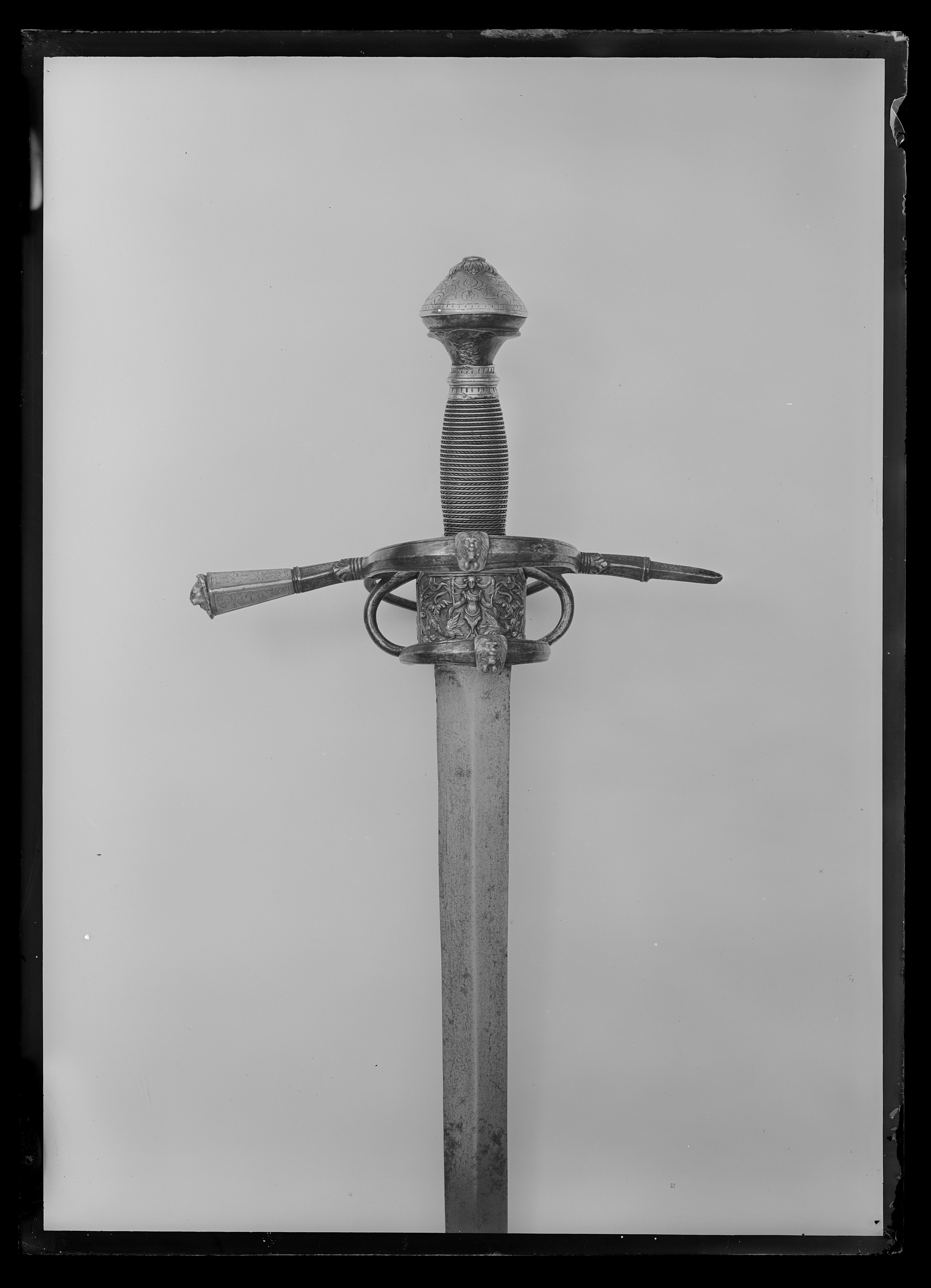Fäste av mörkanlöpt stål med beslag av förgyllt silver. Av typ utan handbygel. Knapp tämligen stor, konisk överdel och insvängd hals, överdelen belagd med förgylld, slät silverkåpa, graverad med ett bandmönster av fina linjer. Kring den låg nitknappen en pålagd, radiellt ordnad, flikigbladrosett. Parerstänger med fyrsidigt tvärsnitt, tämligen långa och något nedåtböjda samt med ca 45 mm långa ändbeslag av förgyllt silver (det bakre nytillverkat, nr 968). Ändbeslagen likaledes med fyrsidigt tvärsnitt, varje sida med graverad ornering, varannan med arabeskliknande ornament, däribland cirklar. Ytterändarna belagda med en fastlödd, gjuten lejonmaskaron, likså av förgyllt silver. På ut- och insidan av krysset ett beslag av förgyllt silver, som övergår i en ca 41 mm lång hylsa, omslutande klingans ricasso. Hylsan sammansatt av två hälfter, vid sidorna fästade vid varandra medelst springar. den yttre hälften välvd och med driven och ciselerad ornering, en mytologisk mittfigur (genie) omgiven av symmetriskt ordnade bladornament. Den inre mera plan med graverad ornering av ett symmetriskt mönster avband och bladmotiv. Vid och nedanför krysset ett bygelsystem. På utsidan en större, bågformig kryssbygel, nedanför denna en något mindre tvärbygel, utgående från fingerbyglarnas nederdel. På mitten av kryss- och tvärbyglarna en gjuten lejonmaskaron av förgyllt silver. På insidan ett enkelt system av kryssformigtlagda byglar, dessa, liksom fingerbyglarna, odekorerade. Spolformig kavel lindad med omväxlande tvinnad och slät, förgylld silvertråd. Klinga rak, tvåeggad, jämnt avsmalnande mot udden. På utsidan av ricasson en inslagen, pilliknade stämpel (LRK vägl.1921:48).