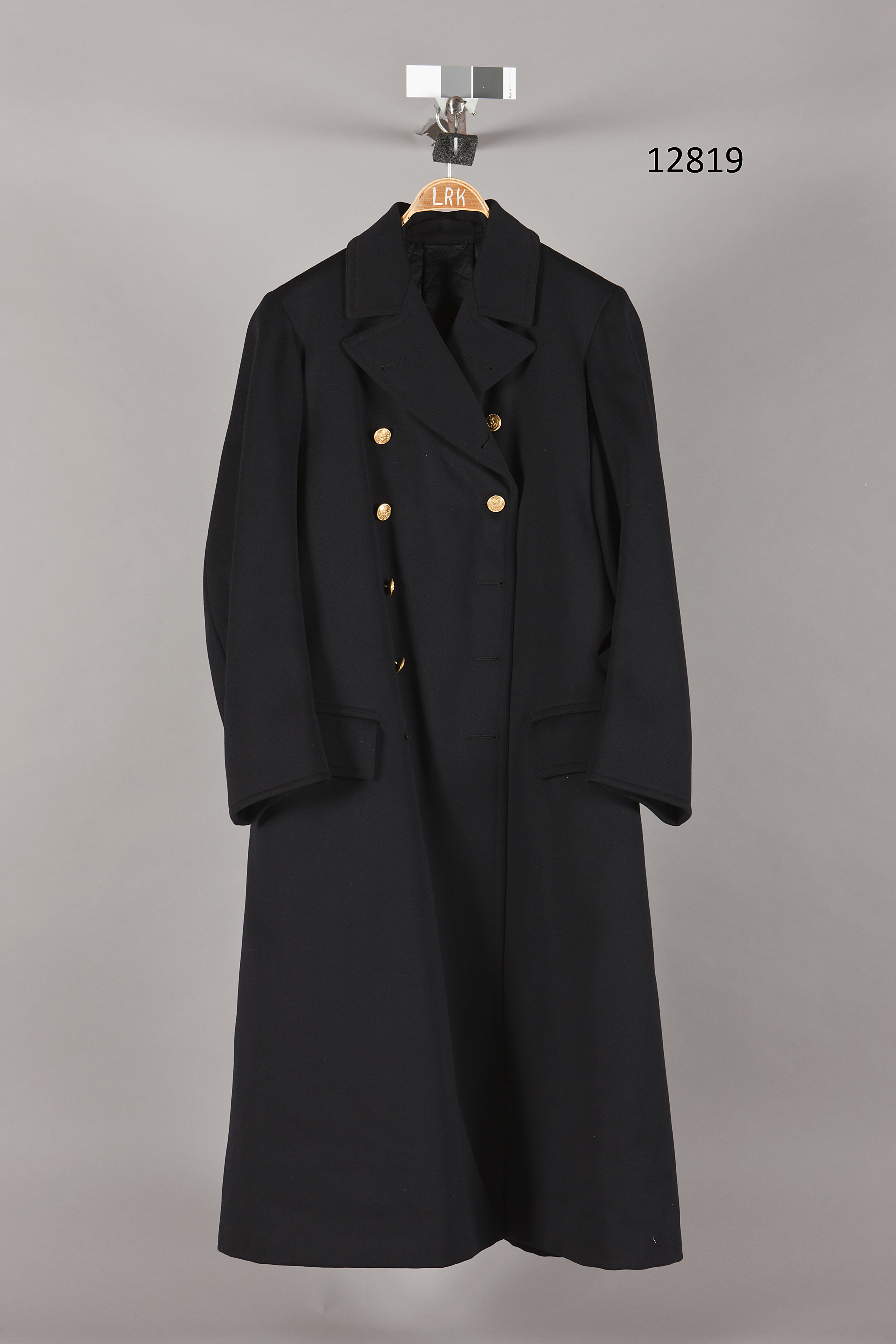 Kappa av mörkblått kläde, krage med slag, ingen midjesöm. Dubbelknäppt med två rader om fem förgyllda knappar, d: 23 mm, med i relief ett krönt ankare med lagerkrans oxh repstavsbård, på undersidan märkta: "JENNENS & Co // LONDON". Två stolpfickor med lock och i höger sida ett snedskuret hål för koppel. Rygg med längsgående veck med nedtill ett sprund med dold knäppning med fyra mörkblå plastknappar, d: 14 mm. I midjehöjd på de två längsgående ryggsömmarna, på var sida en knapp, som föregående i vilka en slejf fästs. Foder av svart siden, vadderad och med rutsöm. Fickfoder av vitt sämskskinn. Kragh: 60 mm, ryggl: 900 mm, skjörtl: 440 mm, ryggb: 430 mm, framstyckets l: 1280 mm, ärml: 680 mm, midja: 1100 mm.