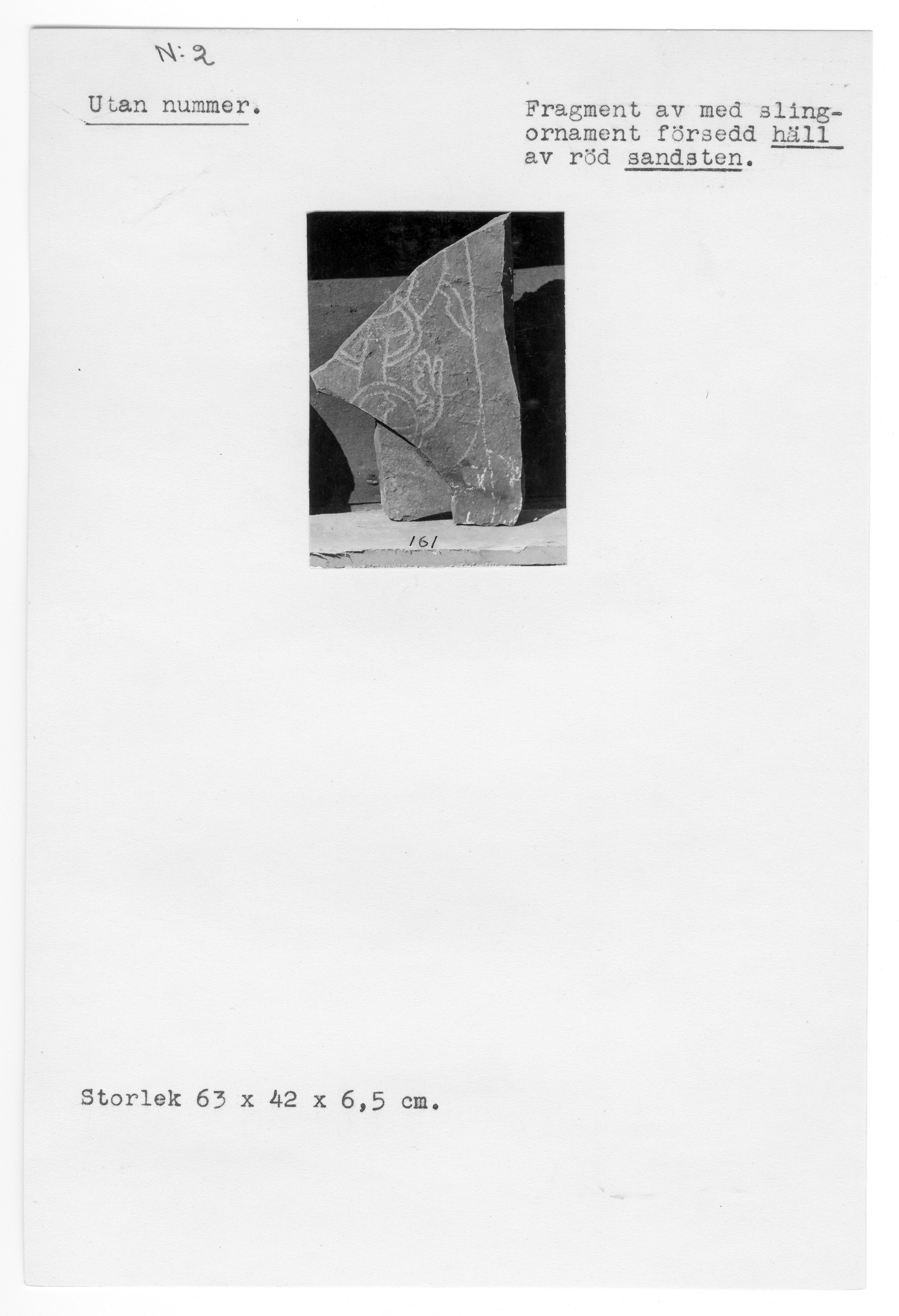 Fragment av häll med grunt huggen slinga i sen (?) urnes-stil. Inga spår av runor.