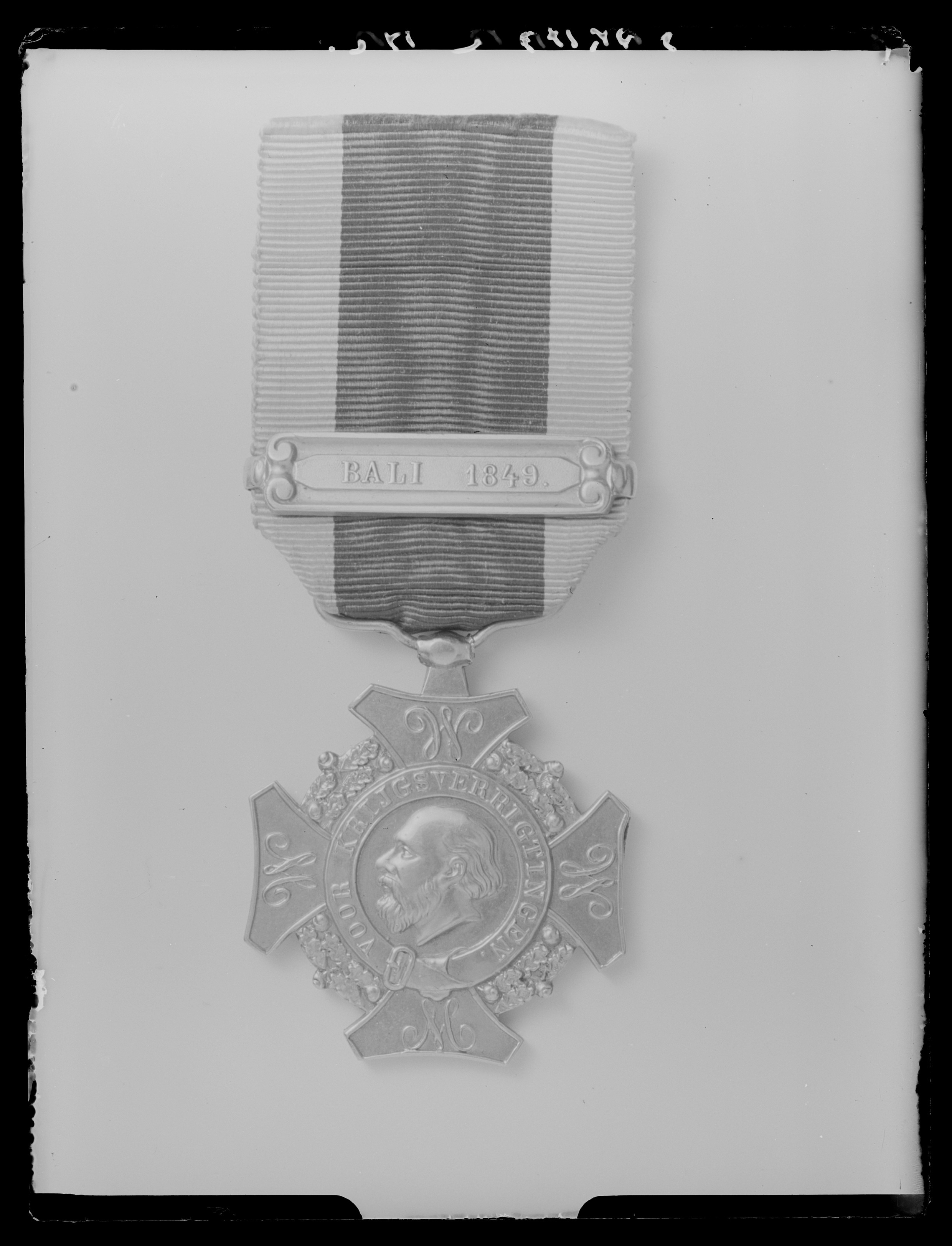 Kors av vitmetall (silver?) med utböjda, avhuggna armar, på korsarmarna eklövskrans. Medaljong med reliefporträtt av man (Wilhelm II?), halsbild, profil v, skägg, och långt hår, runtom band med spänne, relieftext: "VOOR KRIJGSVERRIGTINGEN". Baksidan slät. Från den övre korsarmen utgående spets med tunnformig bygel, däri fäst bandfäste.
