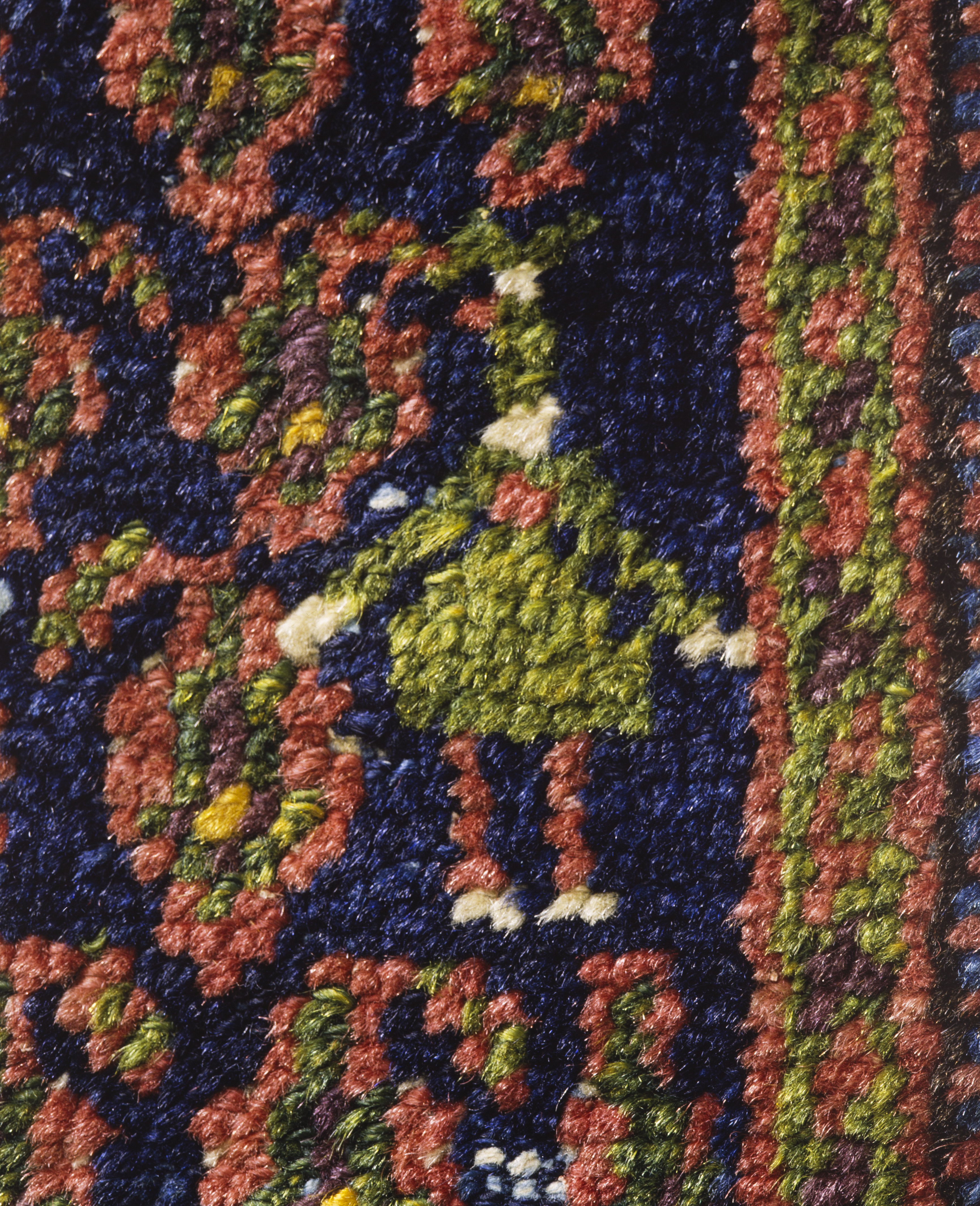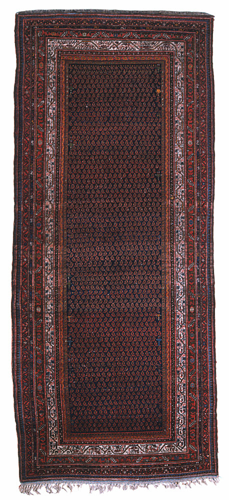 Gallerimatta. Mönster: mörkblå botten med tätt litet plolykromt botehmönster samt på långsidorna små människor. Benvit huvudbård med bladranka, åtta bårder inklusive huvudbården Varp: bomull Inslag: bomull Z7S ljusblå. Lugg: ull, Z2, symmetrisk knut på en nivå. Knuttäthet: 31,5-34 knutar/dm horisontellt, 31 men på 63 cm av mattans övre del 38 knutar /dm vertikalt.Ca 1.070 knutar/dm2 mått 332x141,5-143,5 - " - Långsidor: Kabel bestående av två+två varptrådar med inslagstrådar runt om omlindat med röd ull Kortsidor Övre kortsidan med 2 cm slätväv med ljusblå inslagtrådar och tvåfärgad rand i mörkblå och röd ull Färger: Mörkrött, rött, augbergine, gult, mörkbrunt, mörkblått, blått, ljusblått, grönt, benvit. De röda färgerna med abrascher (nyansskillnader)
