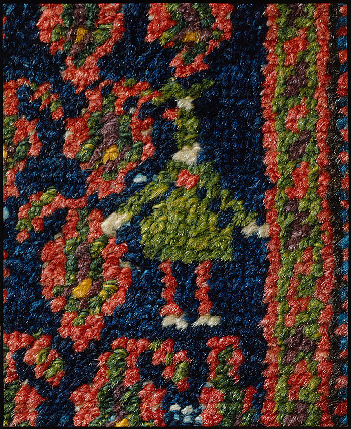 Långsträckt rektangulär. Varp af ofärgadt bomullsgarn, ändarna utmed ena kortsidan hopknutna till en slät kantskoning och vid den andra utstickande i en frans. Knytning af ullgarn. I midten ett stort innerfält med blå botten, mot hvilken ett ytfyllande mönster af i tvärgående rader ordnade små mir-i-bota-ornament i rödt med grön midt, ornamenten i hvar-annan rad vända åt ett håll, i hvarannan åt det motsatta; utmed ena långsidans kanter på spridda ställen sex, utmed den andra sju små människofigurer i gult, blått, grönt och mörkt brungredelint. Kring innerfältet en bred omfattningsbård, delad i åtta lister, mellan hvilka smala ränder öfvervägande i rödt och blått, de förra med en prickrad i grågult. Första och andra listerna, inifrån räknadt, smala samt med röd botten, mot hvilken rankor öfvervägande i grönt å den första och gult å den andra; den tredje med brunsvart botten, mot hvilken en sick-sackranka i grönt och något rödt; den fjärde och den femte tämligen breda, den förra med gråhvit botten, mot hvilken en nästan upplöst ranka i blått och rödt, den senare med röd botten, mot hvilken en linsärtformig ranka i grönt och brunsvart med stora blad i sistnämnda färg och gråhvitt samt dessutom runda blommor öfvervägande i blått, grönt och gråhvitt; sjätte listen smal samt bestående af en sammanhängande rad S-formade ornament i olika färger mot mörkblå botten; den sjunde röd med en sicksackranka i mörkblått och något grönt samt med korsformiga blommor i olika färger med mörkblåa konturer; den åttonde bestående af två mot hvarandra vända rader af uddar, Längd utan frans: omkring 3.4 m.; bredd: omkring 1.44 m. Gåfva till Johanna Kempe, f. Wallis, Julaftonen 1900 från hennes dotter och svärson, Anna Fridrica Wilhelmina (Mina), f. 1 Oktober 1844, d. 25 Juli 1930, och Walther von Hallwyl, f. 26 Januari 1839 i Bern, d. 27 Februari 1921 i Stockholm, gifta 10 Juni 1865. Inköpt af de sistnämnda 1 December 1900 i samråd med deras svärson löjtnanten Wilhelm von Geijer hos matthandlaren Hag Aly Ben Ismail Chabestary, Han Halil, Kairo, (se räkning 1 December 1900, utställd på Wilhelm von Geijer) under deras vistelse i nämnda stad tillsammans med sin dotter och svärson Irma och Wilhelm von Geijer samt fröken Ida Uhse 18 November—27 December 1900. Förestående uppgifter lämnade med ledning af fröken Ida Uhses Reseanteckningar. Ankom 5 Mars 1901, se Rescontra (Walther von Hallwyl). Betald 1 December 1900, se räkning. Pris: £ 28 (tillsammans med K. I: A.a.i och 2 samt I: D.a.i), se räkning,