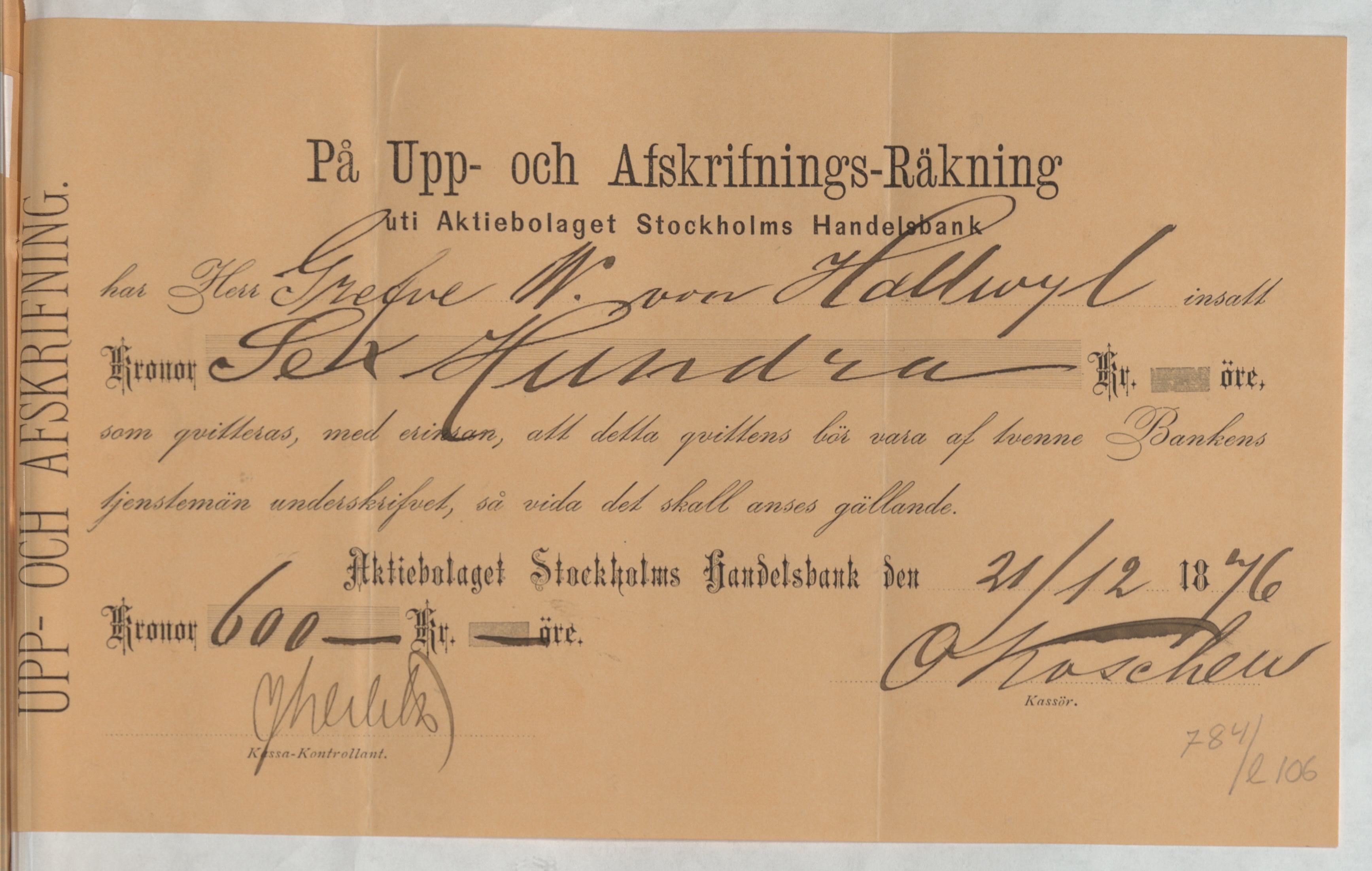 Kvitto från Aktiebolaget Stockholms Handelsbank rörande Upp- och Afskrifnings-Räkning