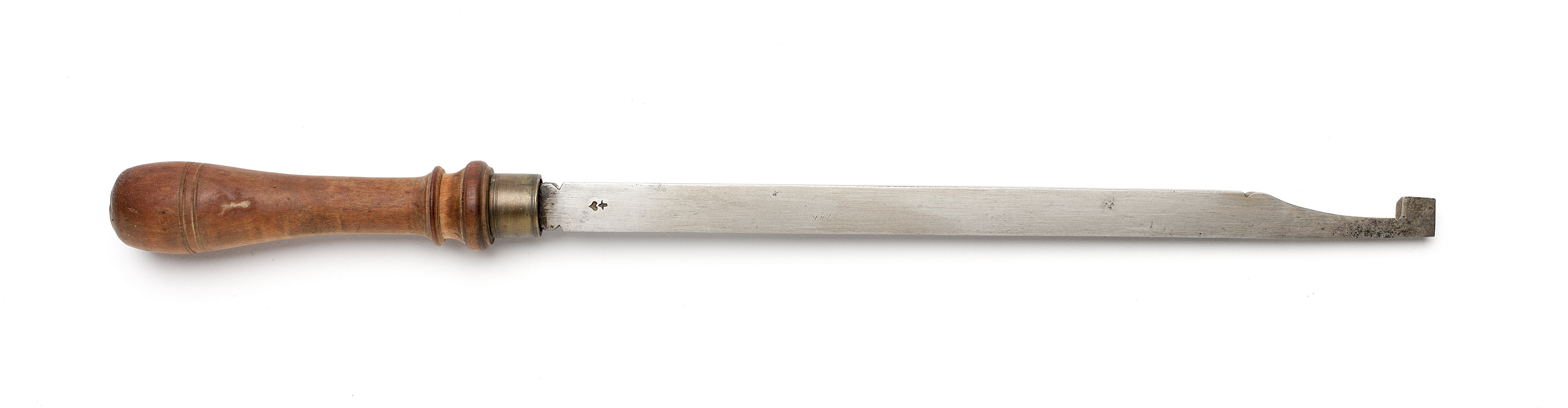 Klinga med rektangulär genomskärning och profilerad hals. Stämplat på klingan: hjärta under kors. Änden avsmalnande och svängd, slutande i rektangulär platta med egg efter två sidor. Svarvat skaft av päronträ med två vulster nedtill (rydboholmstyp). Mässingsring.