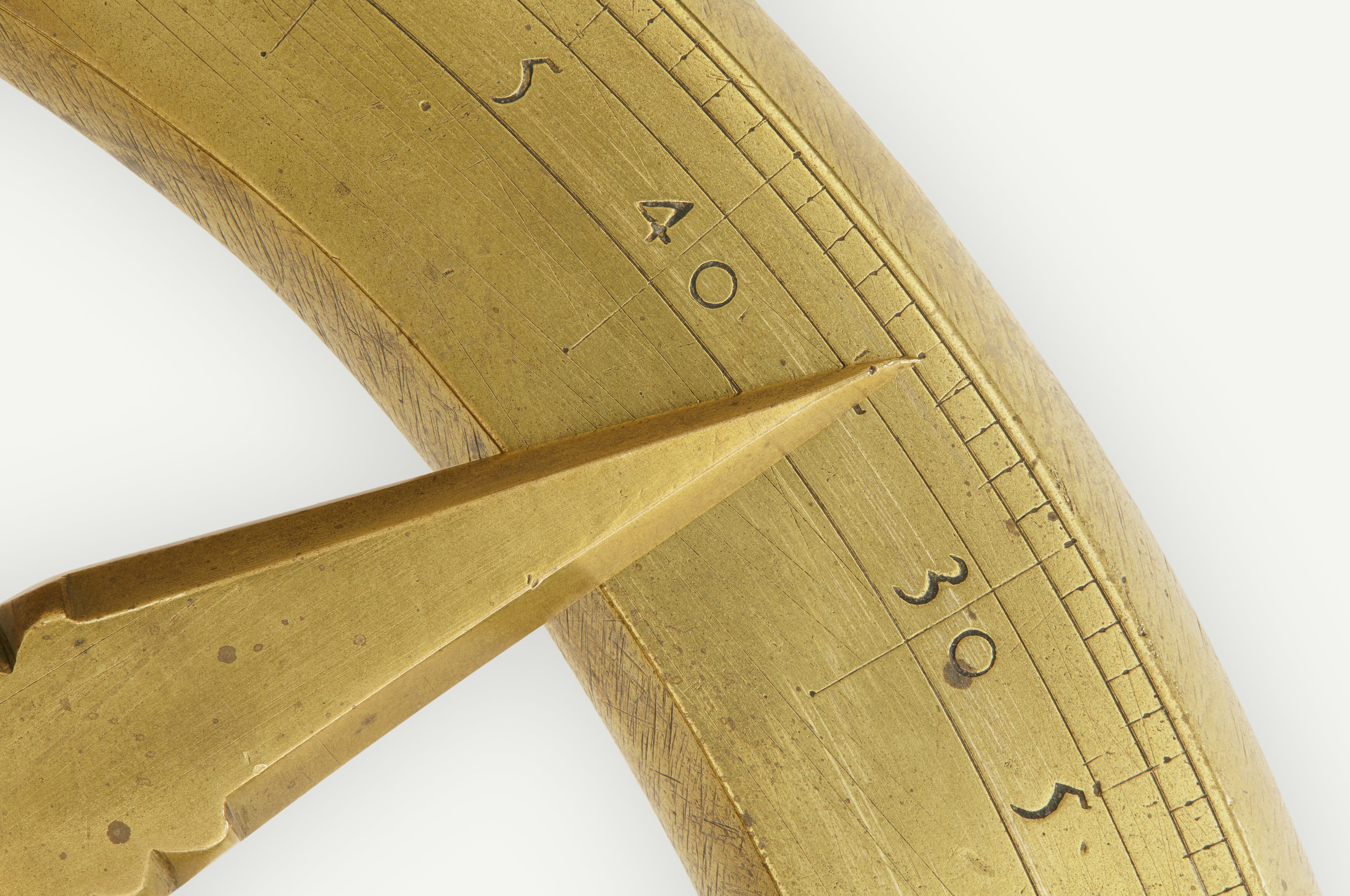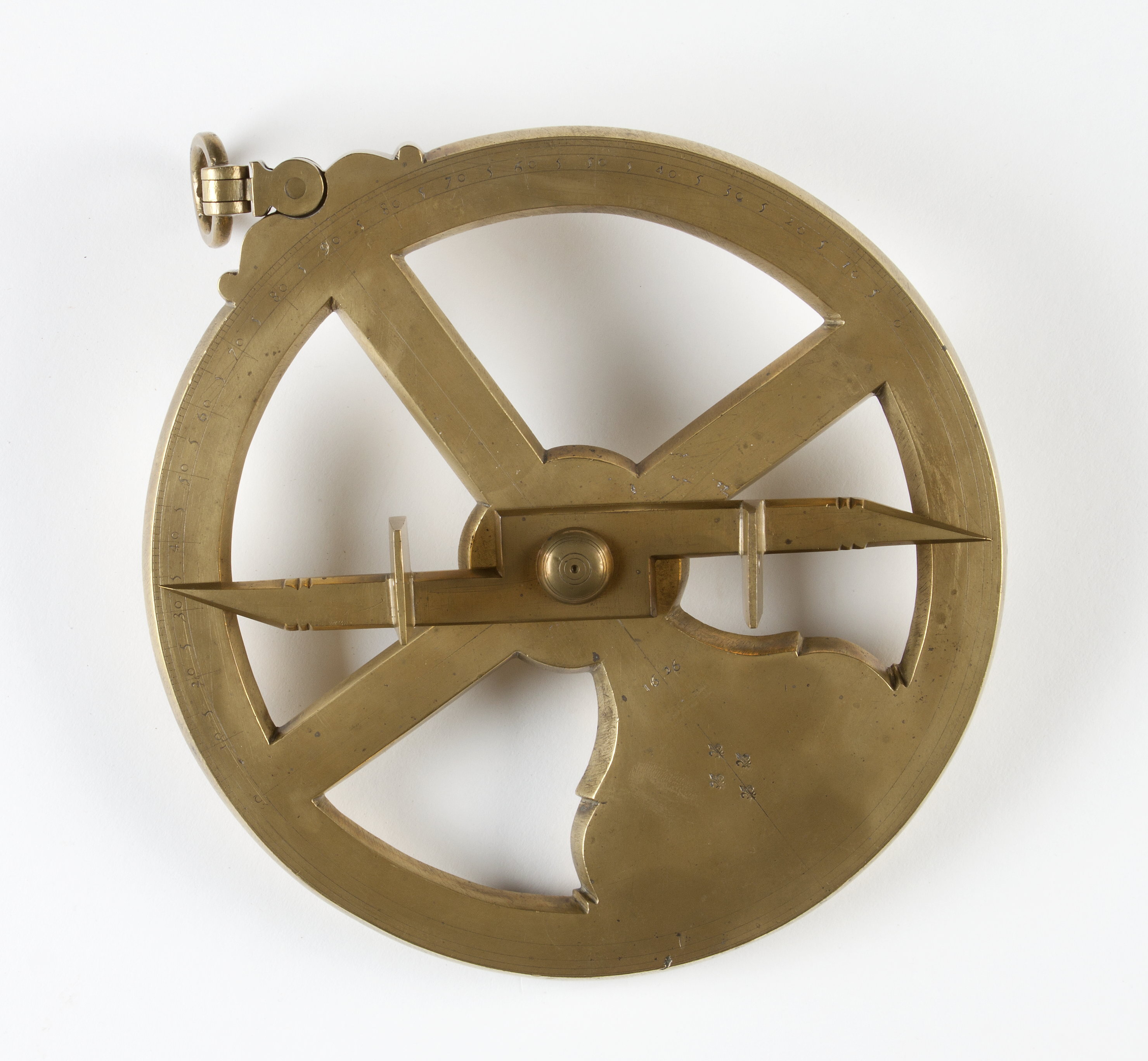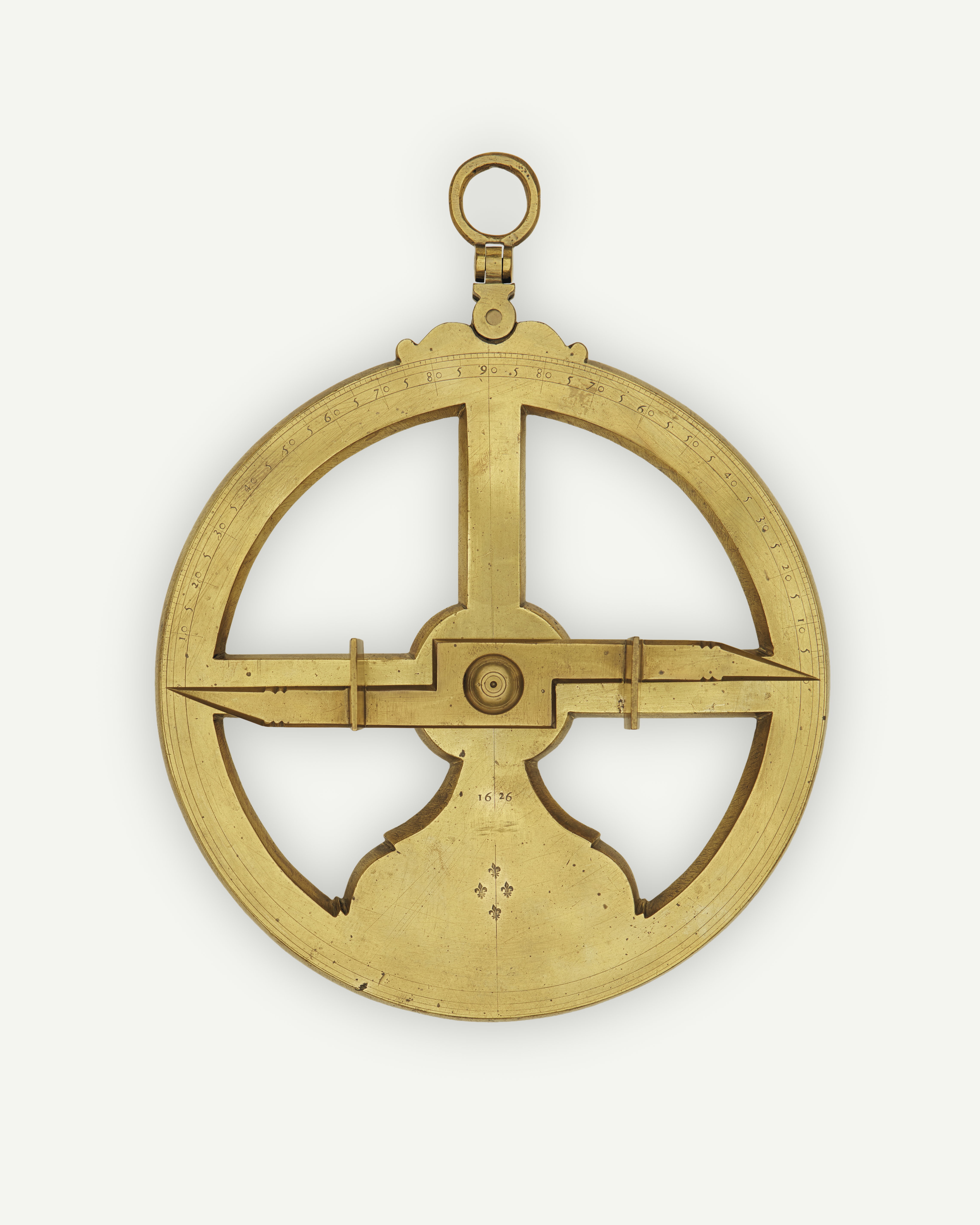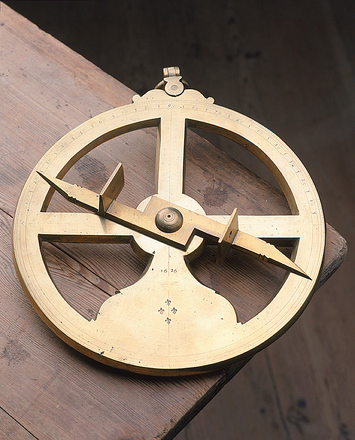 Cirkelformad limbus med mittkryss med rund centrumplatta. “Base ballast” med åt sidorna karnisformad profil. Altitudskala 0-90-0. Diopeterlinjal (241 mm lång) med okulär- och objektivdiopter 94,9 mm från varandra. Vardera dioptern med ett koniskt hål (0,8 och 0,7 mm diam.) Linjalens ändar har en rak och en sned snedfasad sida. Stämplad: Fyra franska liljor, rombiskt placerade samt “1626”. Under upphängningsringen på sjöastrolabiets baksida graverat “8 24”. På ballastens baksida ristat “Vlll:0” . På ovansidan böljande, lätt uppskjutand profilering, vari en kardangsängad upphängningsring fastsnitsats. Axeltapp med halvrunt huvud med graverade koncentriska ringar. Vingmutter med spetsiga, inåtböjda vingar. Vikt: 4270 gram