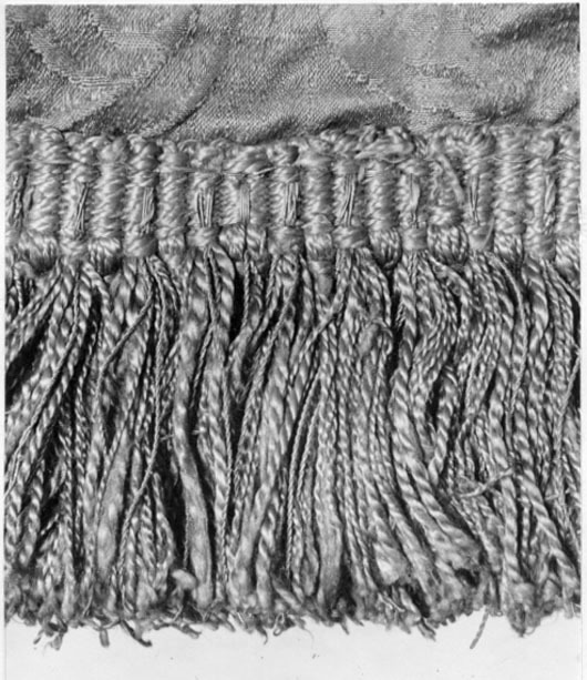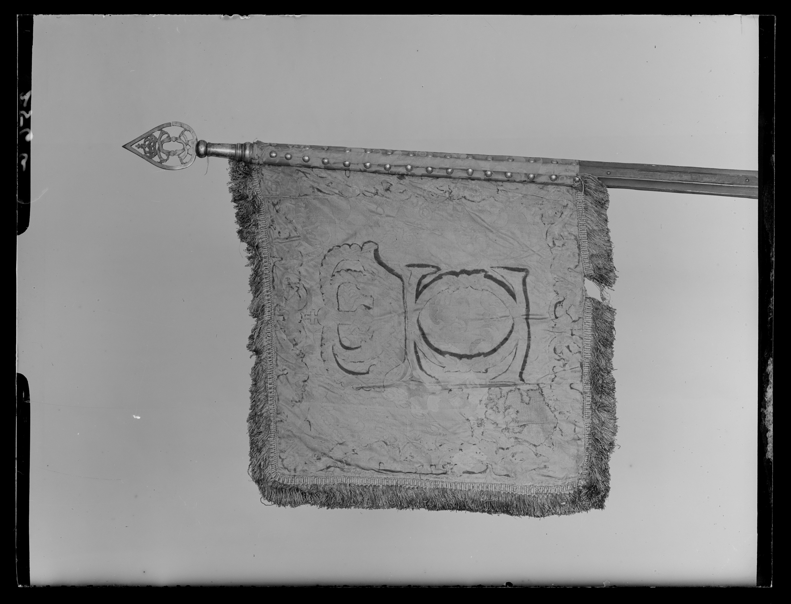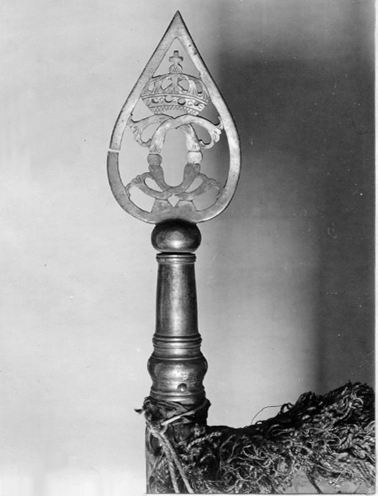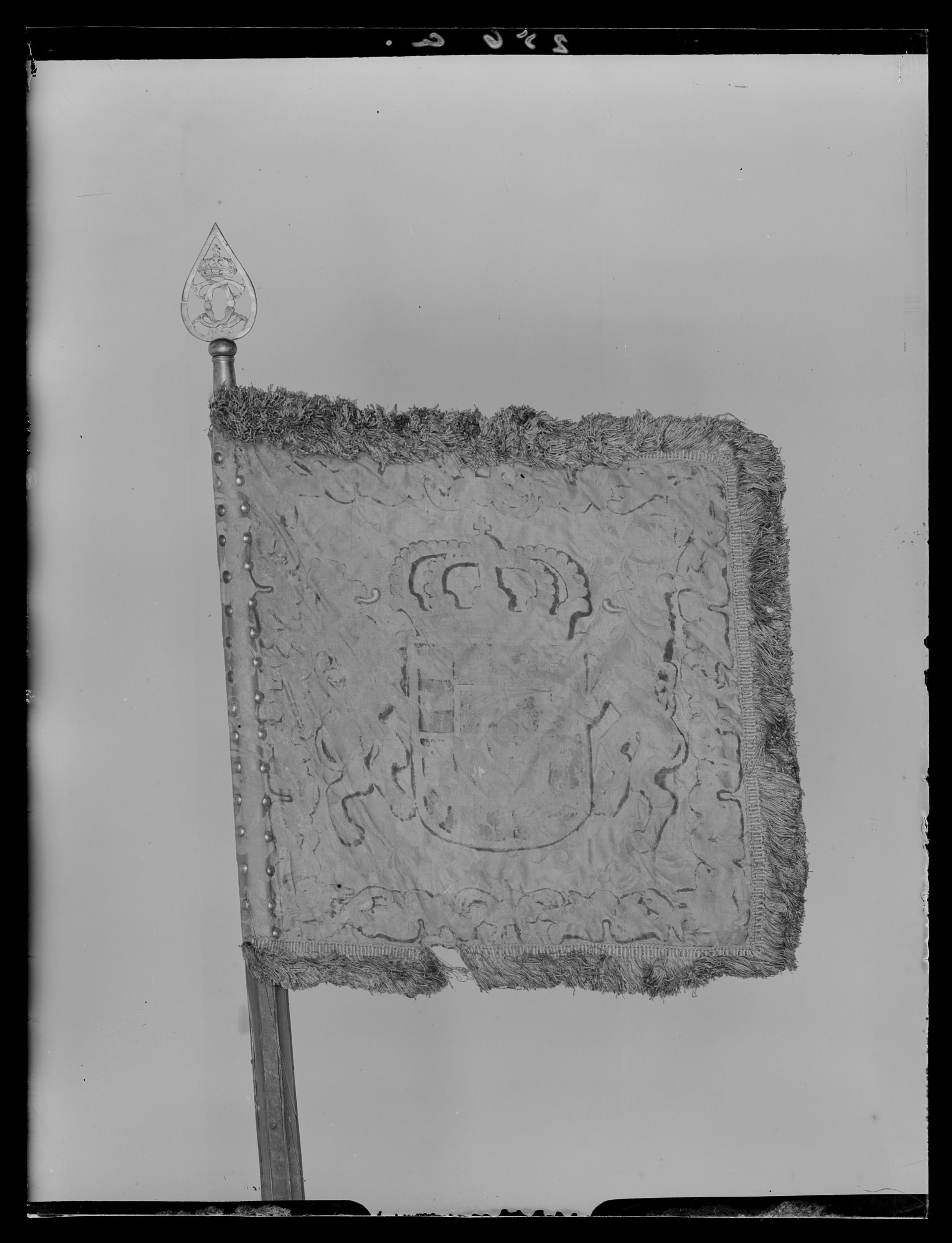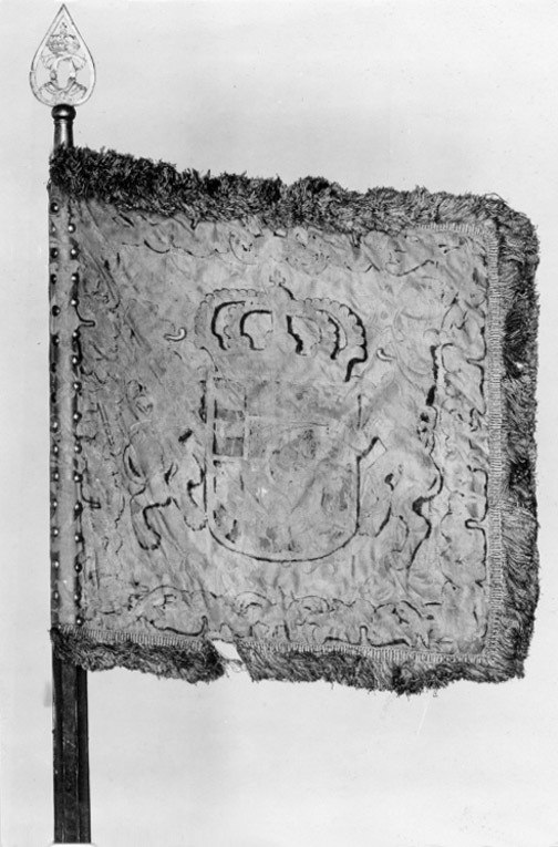 Ev.målat 1678 av mäster Baltzar Friedrich. Duk av dubbel, rosa sidendamast med mellanfoder av linnelärft (syns ej på dukens utsida). Dekor: Målningen, nästan helt borta på dukens insida, föreställer svenska riksvapnet under pfalziska huset i guld och färger i blått, rosa etc. Längs kanten bård av stiliserade bladverk, kronor och palmkvistar ev. i guld. Vapnets h: 330 mm; lejonets h: 295 mm; på yttre sidan dubbelt C, krönt. Frans: dubbel, av silke i rosa och guld. Duken fäst med fyra rader tennlickor. Stång av trä, kannelerad, rödmålad. Löpande bärring. Holk och spets av förgylld mässing, spetsen avbruten, dubbelt C under sluten krona.