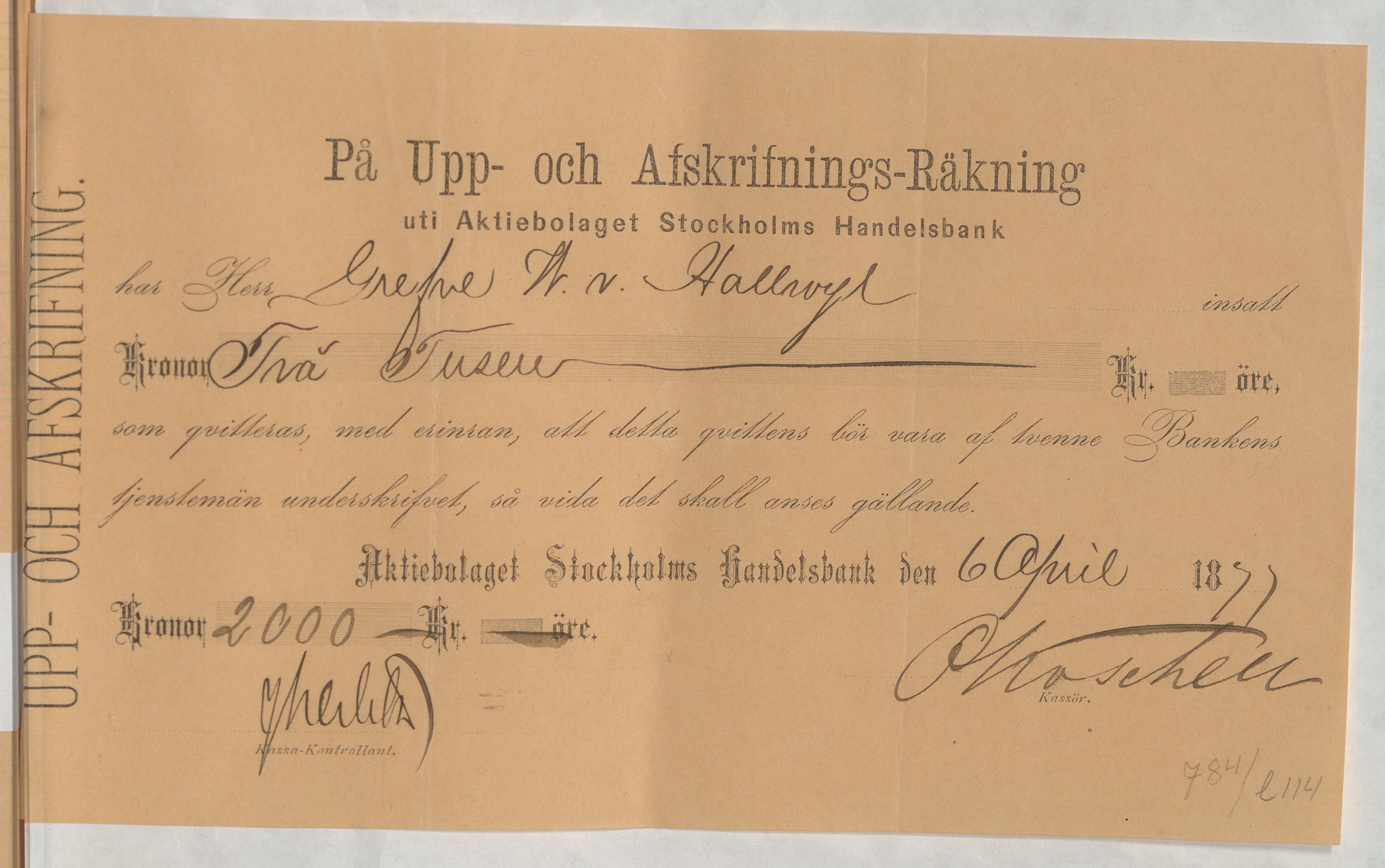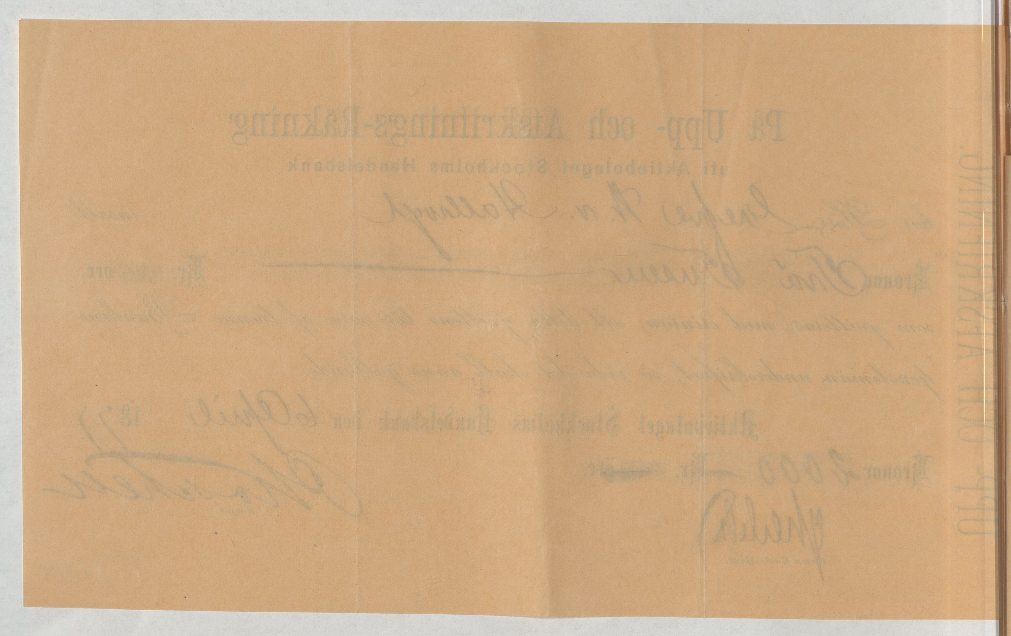 Kvitto från Aktiebolaget Stockholms Handelsbank rörande Upp- och Afskrifnings-Räkning