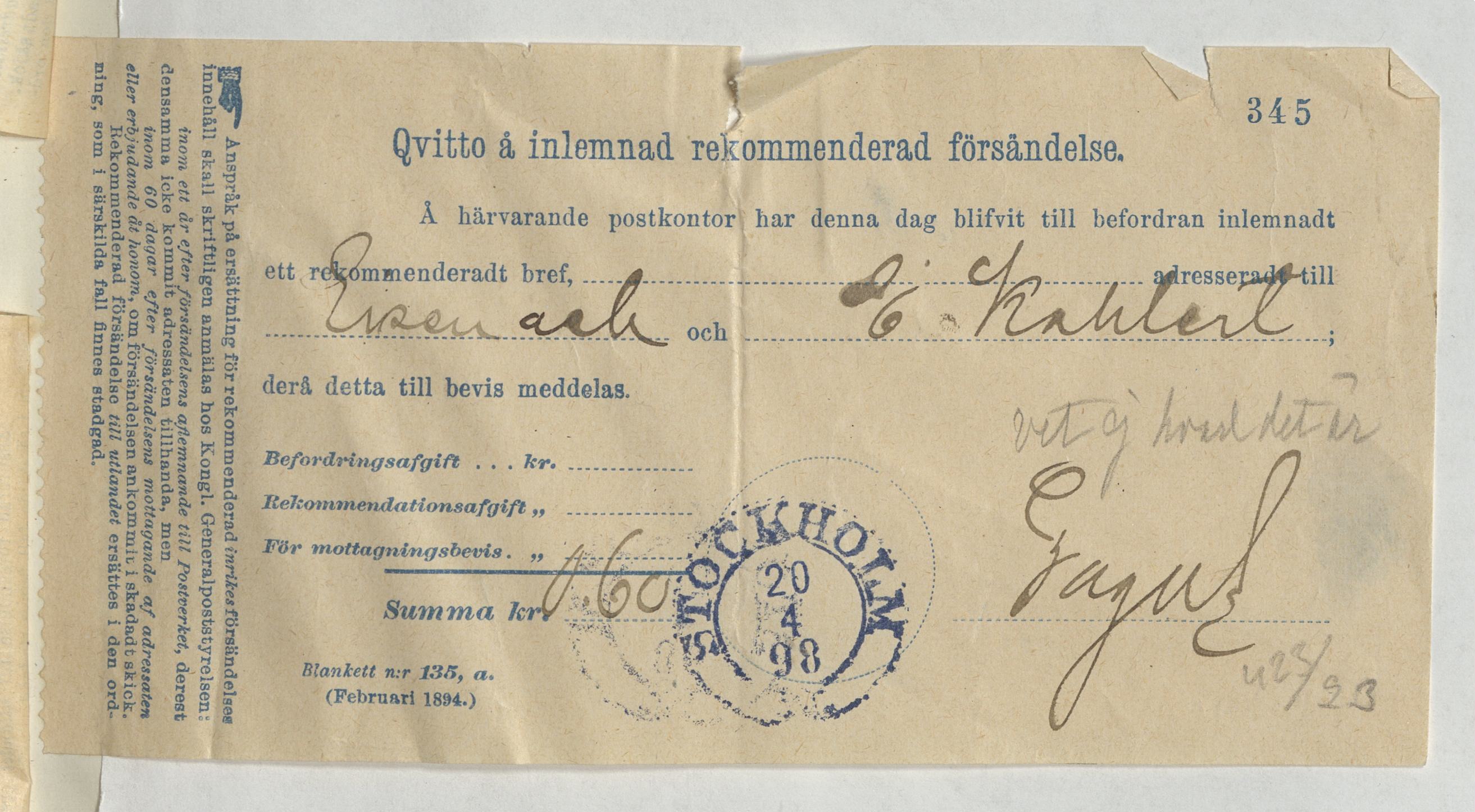 Kvitto för inlämnad rekommenderad försändelse gällande E. Kahlert. Stockholm, 1898.