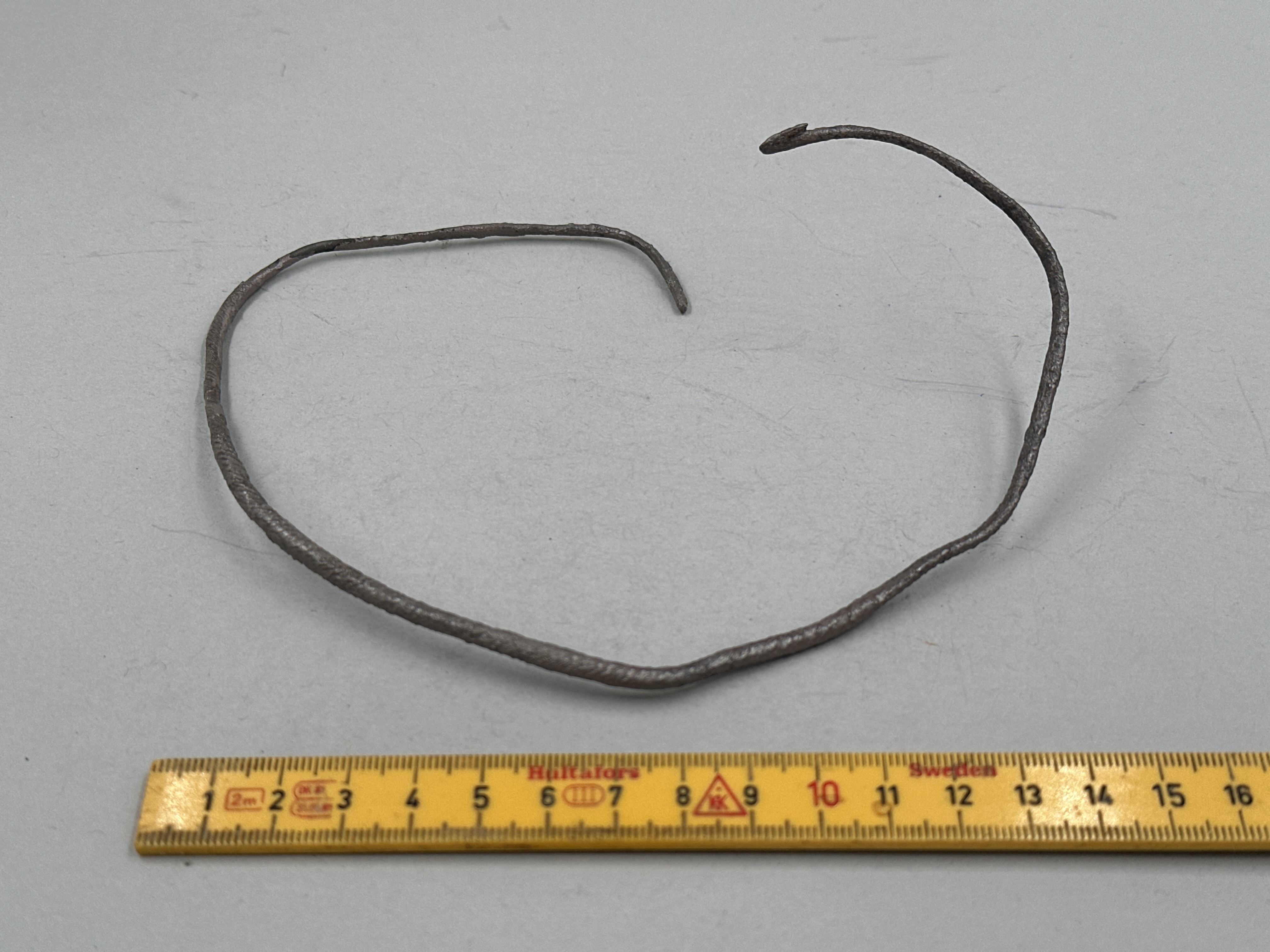 Rundad ten med ena änden tillbakaböjd till ögla. Den andra änden avbruten (?) Ställvis spiralvriden ornamentik, ställvis stämpelornerad. Tenen korossionsskadad.