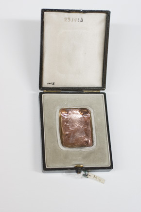 Rektangulärt etui av trä, utvändigt klätt med svart, mönsterpressat papper,två gångjärn samt fjäderlås av mässing. Locket invändigt klätt med vitt, något smutsat siden, i underdelen fast insats klädd med grå sammet, däri rektangulärt, folierat urtag, i vilket stenen är monterad, längs kanten uppstående, rundad kant, klädd med samma sammet.
