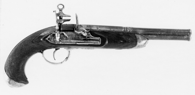 Slätborrad, rund, blånerad pipa med åttsidig kammare och trumf. Vid övergången till den runda delen ett tvärgående, profilerat band med snidad akantusbård mot förgylld, punsad botten. På kammarens ovansida förgyllda stämplar: tre franska liljor, korsformigt ornament samt krönt stämpel med text: "BVS // TIN // DUI" (Stöckelnr 124, vägl. 1921:318:1). Utmed de tre översta sidorna inslaget med silver: "FABRICADO // EN EIBAR // ANO 1827". Utmed kammarens bakkant en vågformig, tvärgående linje av silver. Svansskruvblad med enkel kantdekor. Fästning: Ett häfte och ett pipstift av silver. Snapplås alla katalana. Plant låsbleck med graverad kantlinje, baktill bladornament. Hane med rätvinkliga käkar, lös överkäke, baktill på båda snidad rankdekor. Hanen nertill med ovalt tvärsnitt, käkskruv med ringformigt huvud. Rundad fängpanna med arm bakåt, åsat eldstål. Fästning: Halvstock av valnöt med kort, insvängd kolv med rutsnidade sidor, förstock med täckt laddstocksränna. Beslag av stål. Kolvkappa övergående i ryggbeslag fram till svansskruvbladet. Oval, bred varbygel med enkla, graverade bladornament samt oval, försänkt stämpel med otydlig text: "ALBERDI" (Stöckelnr 3, LRK vägl. 1921:314:1). Främre stolpen med runt tvärsnitt samt främre armen avslutad med en palmett. Näsband med hål för laddstock, bandet på undersidan utdraget bakåt i en flik. Sidbleck något välvt, konturerat med smal, graverad kantbård och enkla blad samt två hål (för bälthake).