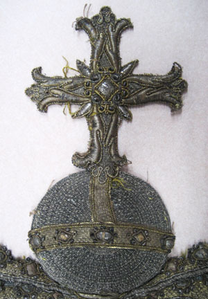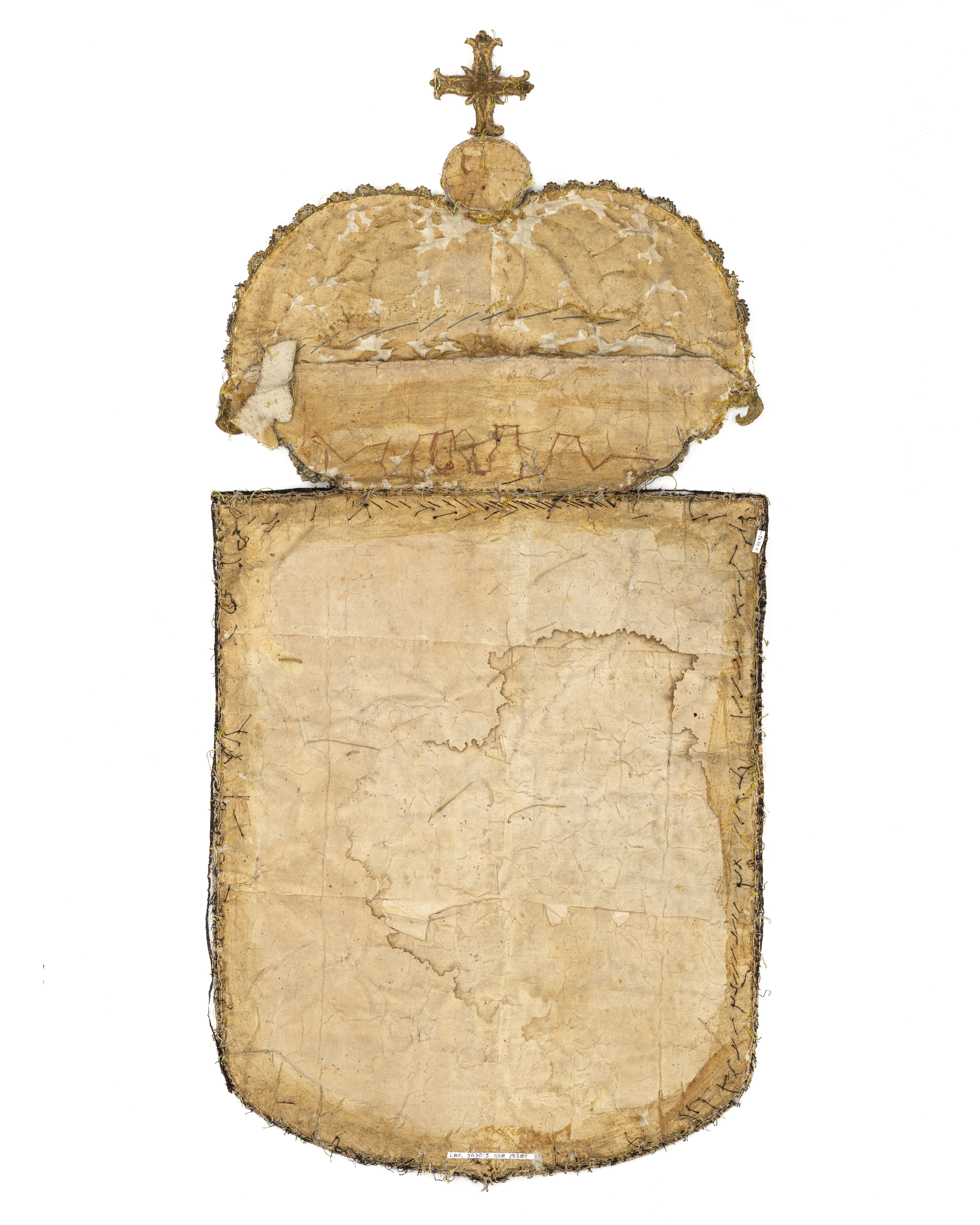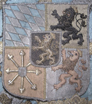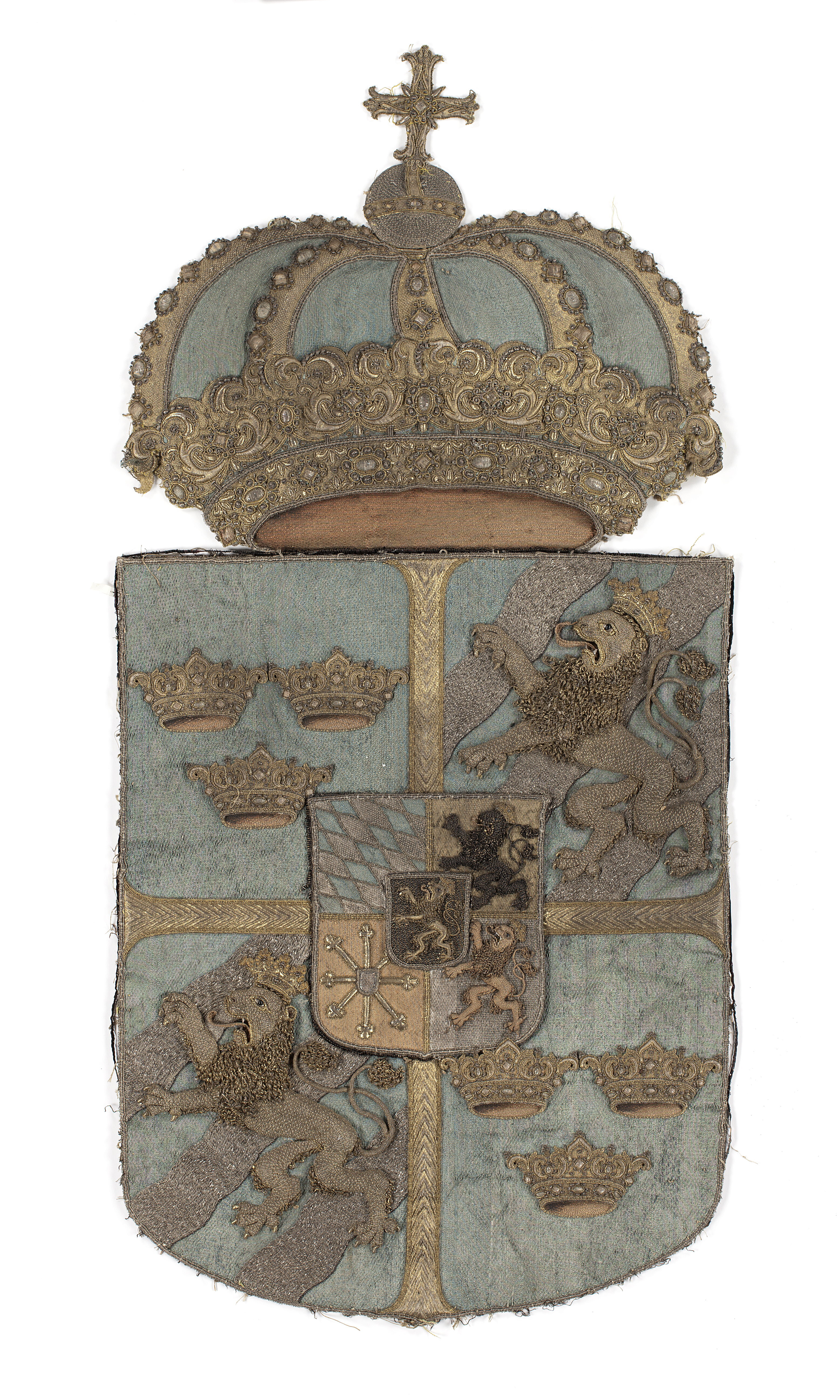 Kvadrerad sköld med ett kors av guldgalon, med utböjda ändar. Huvudskölden har i fält 1 och 4 tre öppna kronor i applikationsbroderi av silvertråd och silverlan, på blå textil. I fält 2 och 3 ett krönt, stegrande lejon med två svansar, på tre ginbalkvis gående strömmar. Applikationsbroderi av silvertråd och silverlan på blå textil. Skölden är kantad med guldlan virat på papper. Pfalziska ättens hjärtsköld. Kvadrerad med snedspetsrutor i silver på blå textil i fält 1, svart lejon på guldtextil i fält 2, en silversköld inom ett liljekors i guld- och silverlan på röd- och svartmelerad textil i fält 3 och guldlejon av röd silke och guldtråd på silvertyg i fält 4. Inre hjärtsköld med guldlejon av guldtråd och guldlan, på svart- och guldfärgad textil. Skölden kröns av en sluten krona i kraftig relief, av guldtråd och guldlan. Överst riksäpple med kors. Blått siden- och silvertyg mellan kronans armar. Kronan har ädelstensimitation av blått, orange- och beigefärgat silkesgarn, samt silverlan. Kronan har någon sorts grå vaddfyllning i ylle. Foder i ofärgad linnelärft. Baksidan klädd med papper.