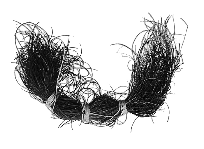 SKÄGG (pipskägg, Walther von Hallwyls) Mörkbrunt samt omlindad på tre ställen med vit tråd. Längd: ca 6 cm. Avklippt omkring 1870. Bevarat av Wilhelmina von Hallwyl.
