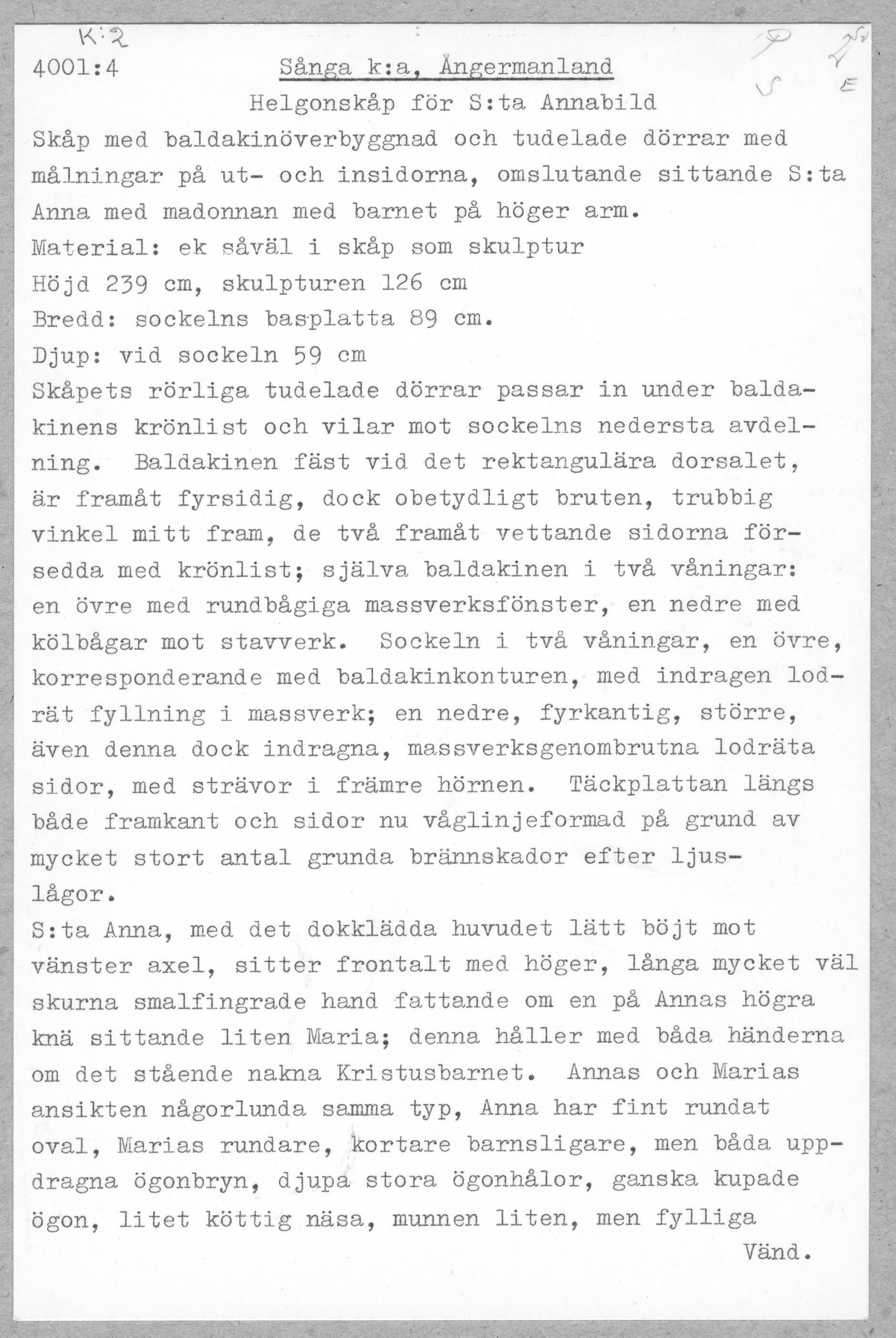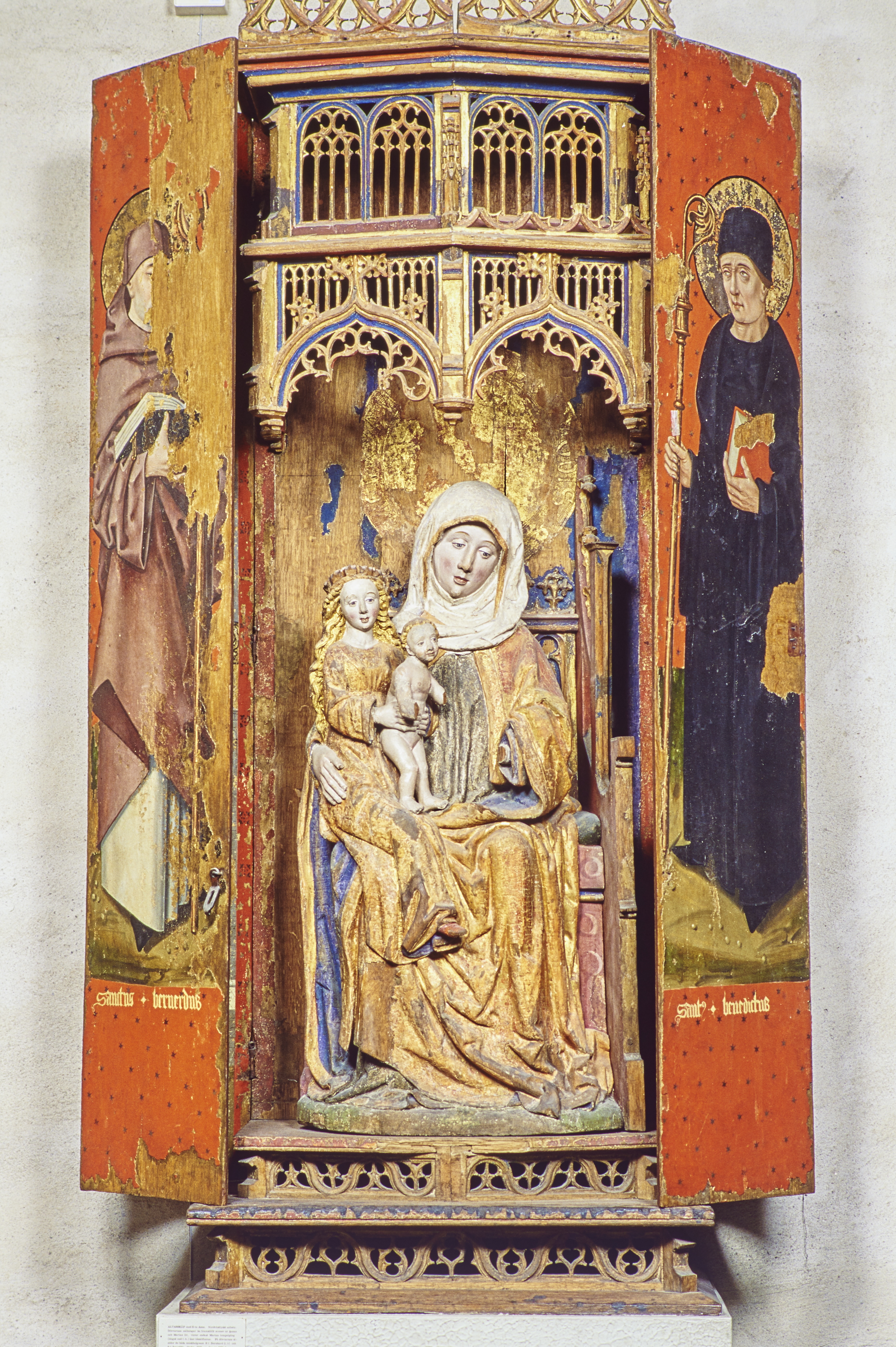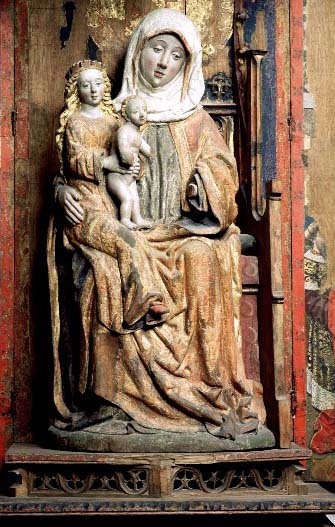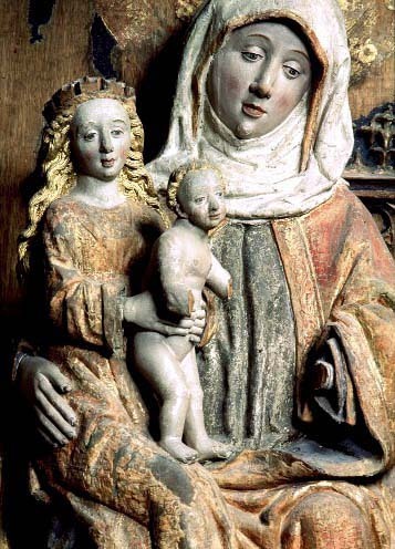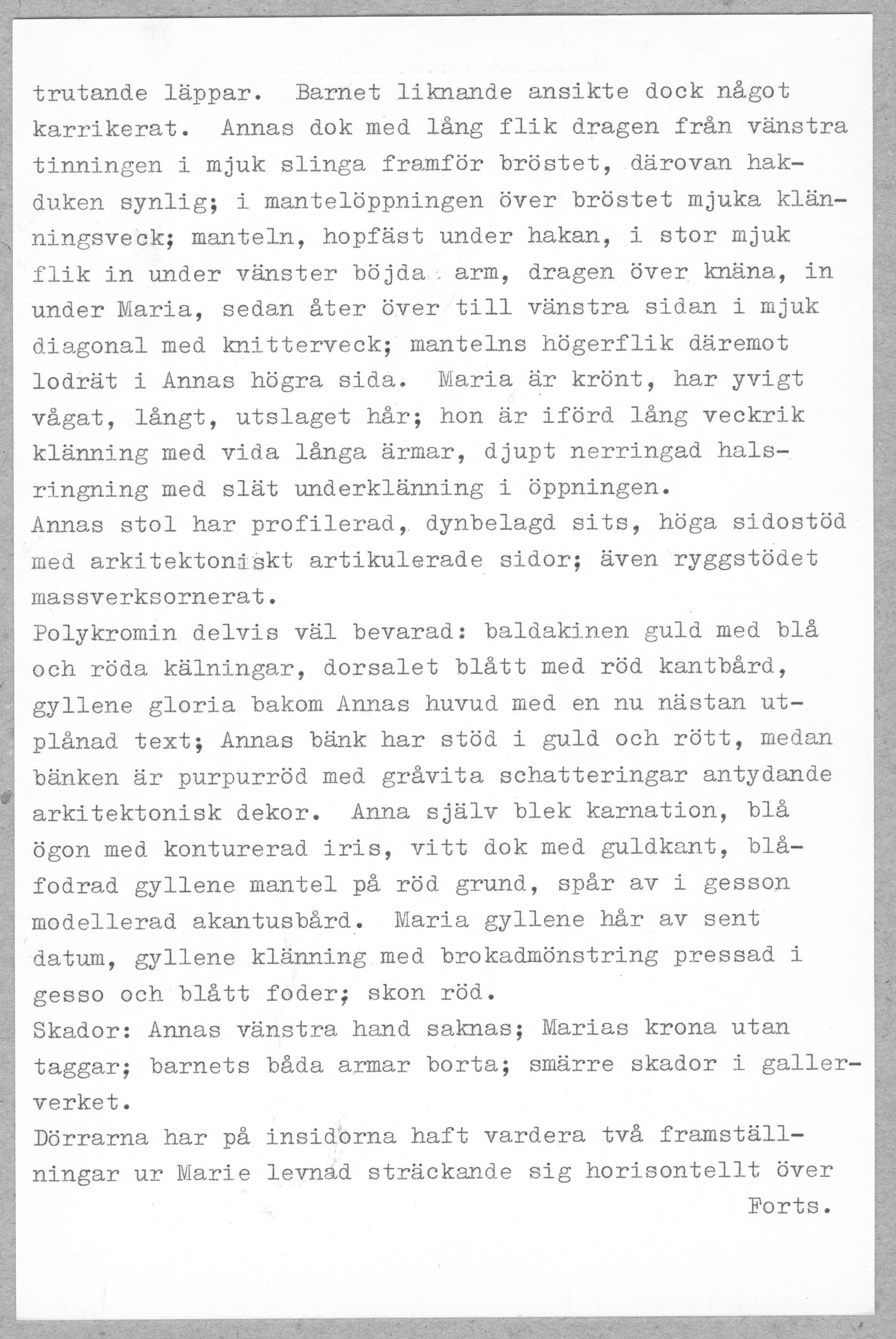 Kondition: barnets båda underarmar och Annas vänstra hand bortbrutna, Marias krona fragmentarisk. Färg: betydande partier bevarade men något nötta.