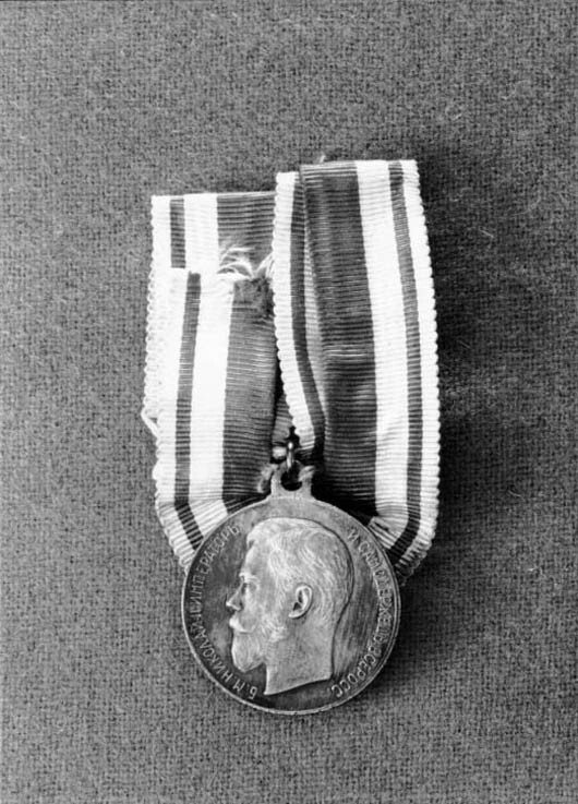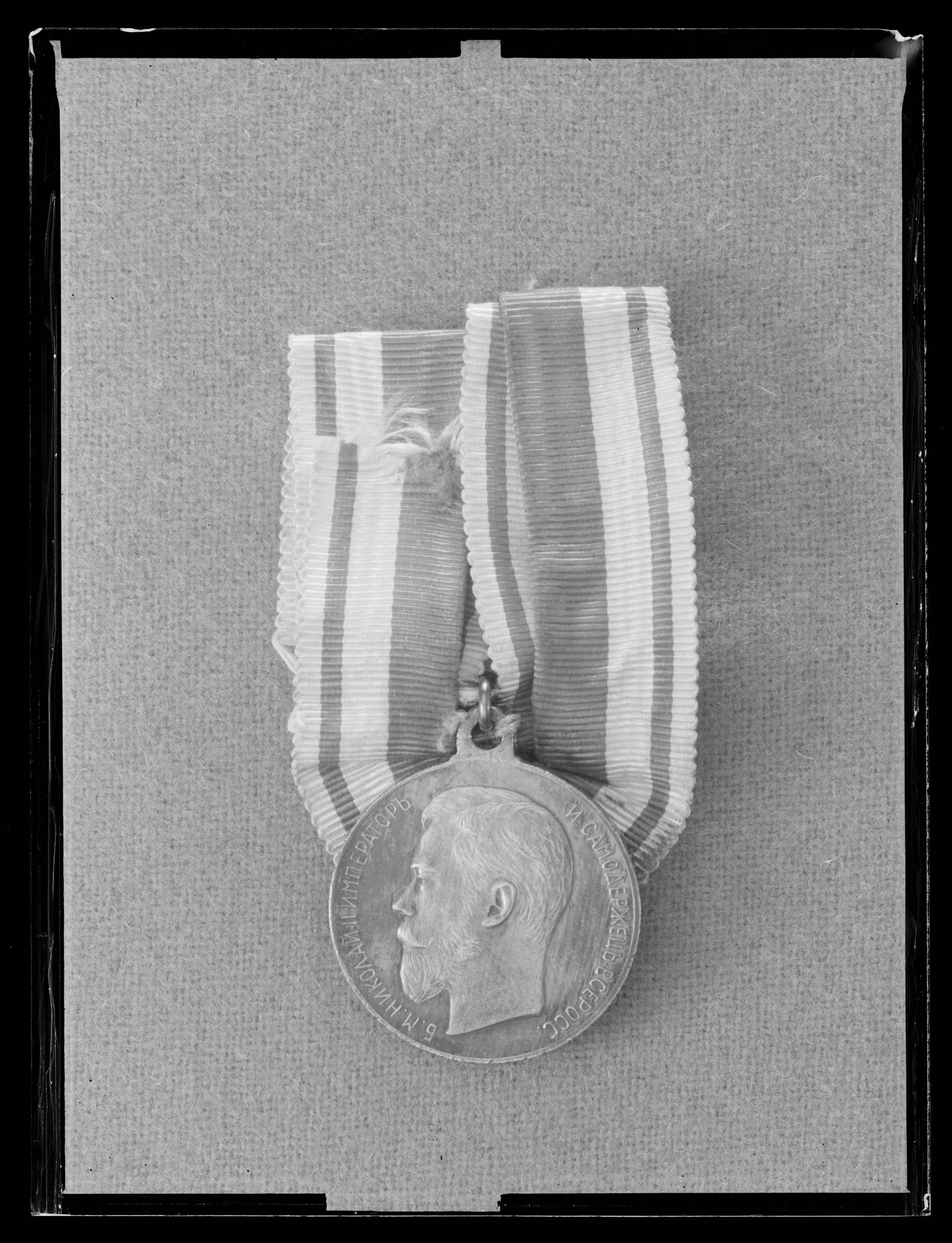 Åtsida: porträtt av Nikolaus II, halsbild, profil v, rysk text: B. M. NIKOLAJ II IMPERATOR I SAMODERZEC VSEROSS (Nikolaus II, kejsare, alla ryssars självhärskare). Frånsida: lagerkvist(?), rysk text: ZA USERDIE (För nit). Upptill övergående i ring, däri fäst spiralformig bandring.